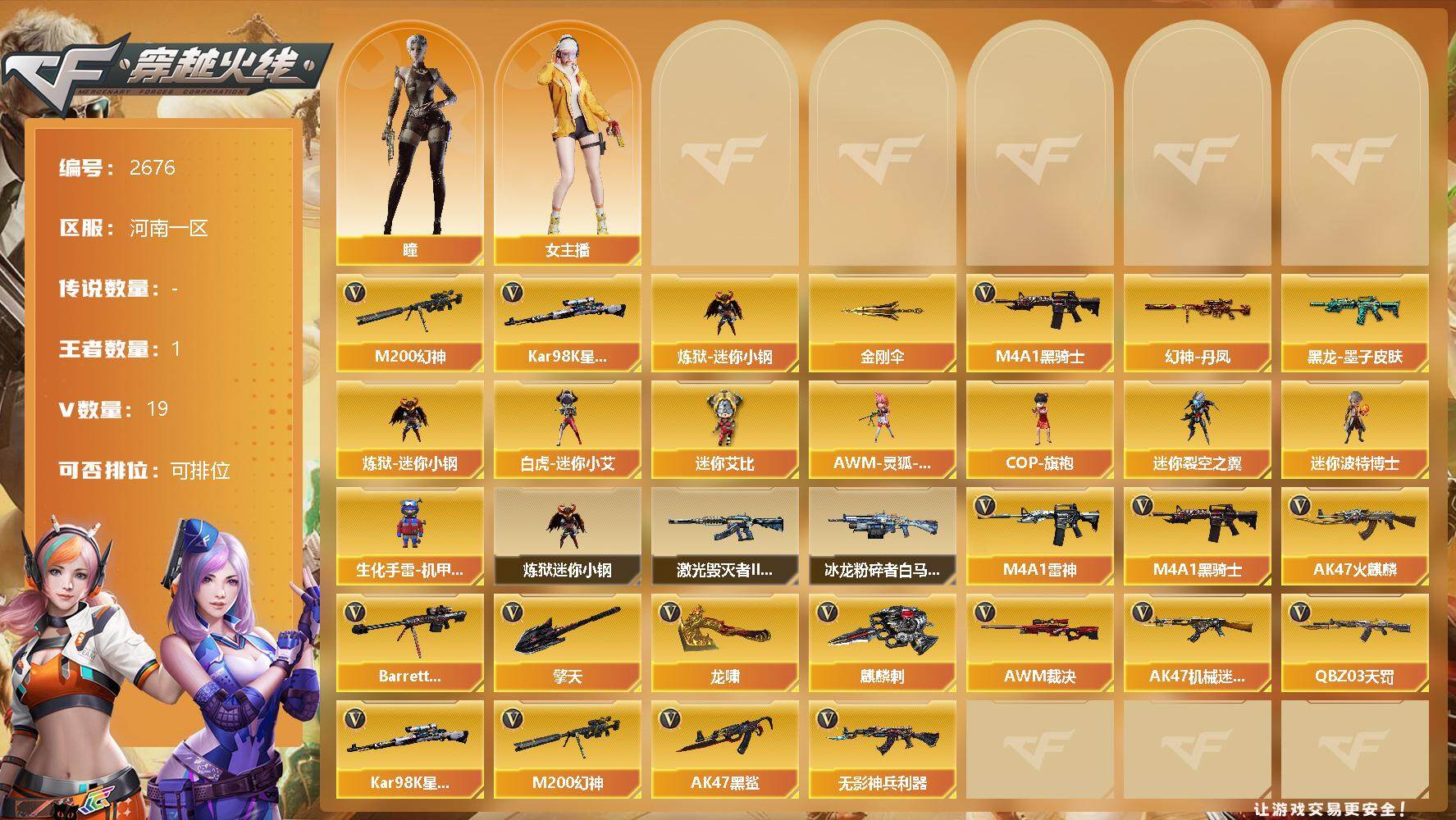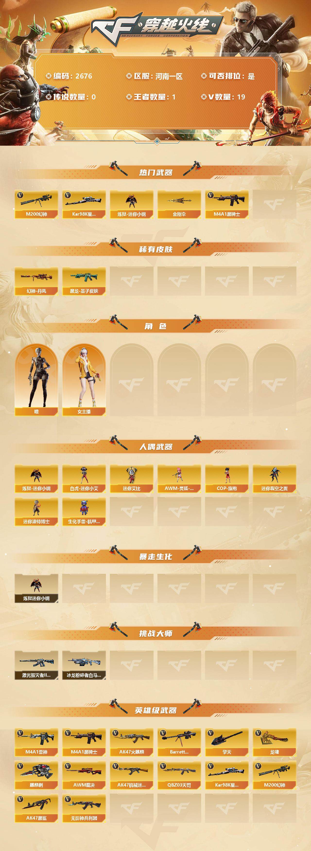 [12522850]【商品标题】:河南一区-19V-1王者-0炫金 【热门武器】:M200-幻神,Kar98K-星神,炼狱-迷你小钢,M4A1-黑骑士,金刚伞 【稀有皮肤】:幻神-丹凤,黑龙-墨子皮肤 【角色】:瞳,女主播 【人偶武器】:白虎-迷你小艾,AWM-灵狐-15周年嘉年华,COP-旗袍,炼狱-迷你小钢,迷你艾比,迷你裂空之翼,迷你波特博士,生化手雷-机甲核心*2 【暴走生化】:炼狱-迷你小钢 【挑战大师】:激光毁灭者III-白马银枪,冰龙粉碎者-白马银枪 【英雄级武器】:无影-神兵利器,M4A1-雷神,M4A1-黑骑士,AK47-火麒麟,Barrett-毁灭,AWM-裁决,AK47-机械迷城,QBZ03-天罚,Kar98K-星神,M200-幻神,AK47-黑鲨,麒麟刺,擎天,龙啸 【特殊枪械】:1黑骑士