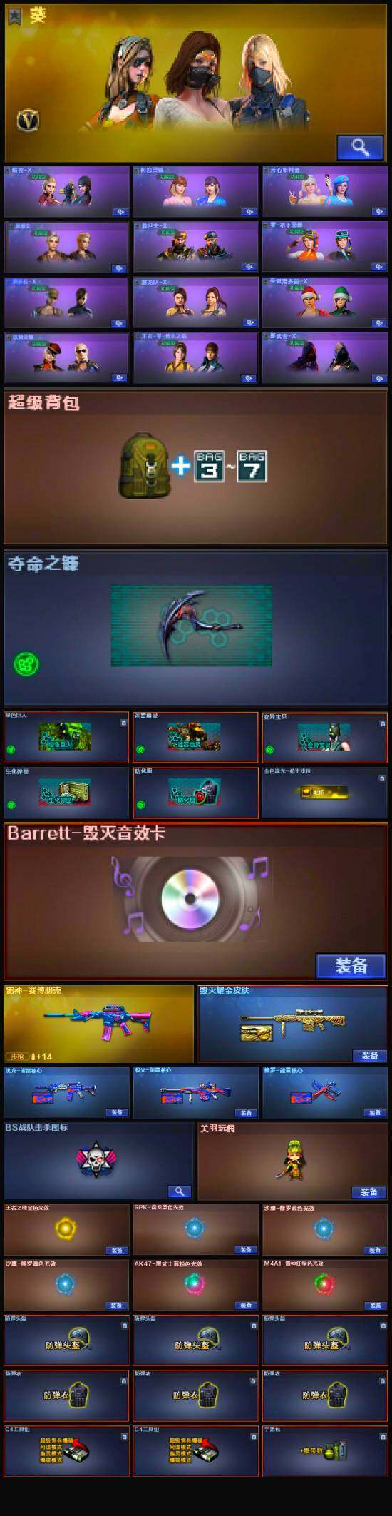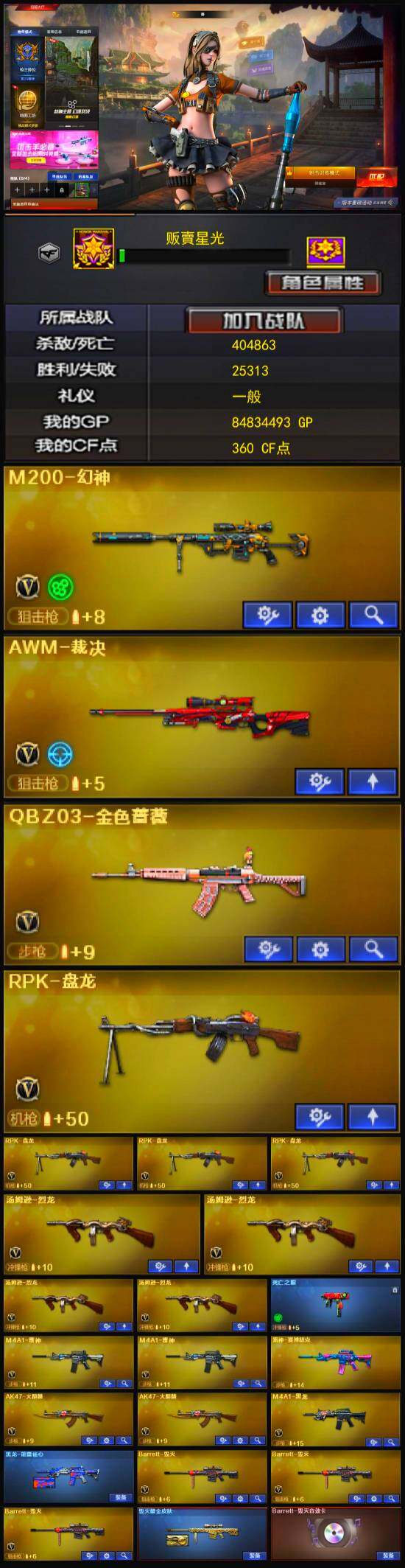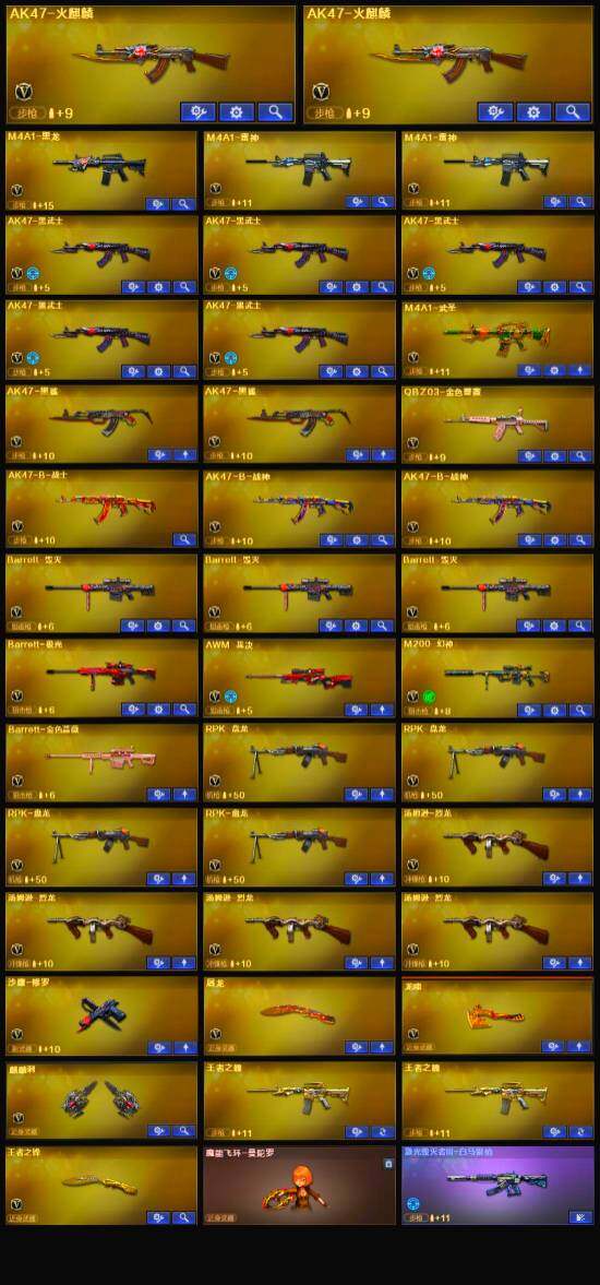 【英雄级武器】:M4A1-武圣,QBZ03-金色蔷薇,M4A1-雷神*2,M4A1-黑龙,RPK-盘龙*4,汤姆逊-烈龙*4,AK47-火麒麟*2,AK47-黑武士*5,Barrett-毁灭*3,Barrett-极光,AWM-裁决,M200-幻神,AK47-黑鲨*2,AK-47-猩红传说,AK47-B-战神*2,沙鹰-修罗,麒麟刺,龙啸,屠龙