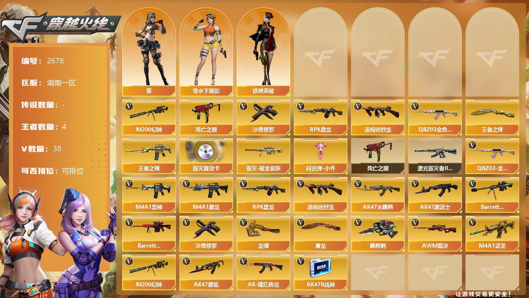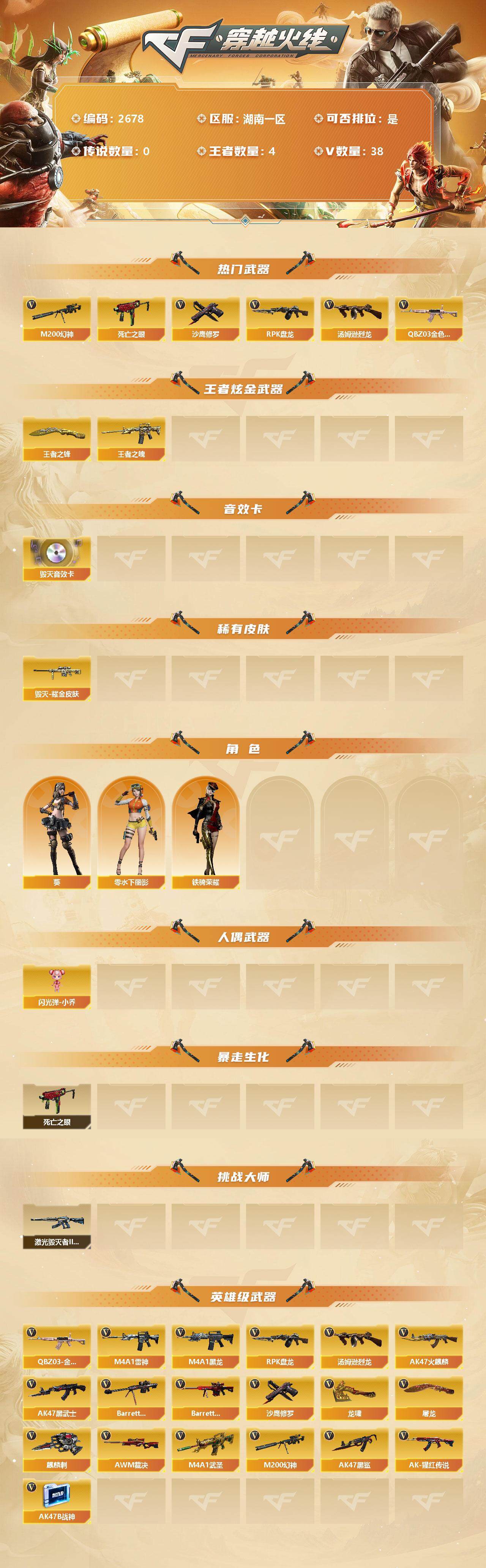 [12522949]【商品标题】:湖南一区-38V-4王者-0炫金 【热门武器】:QBZ03-金色蔷薇,M200-幻神,死亡之眼,汤姆逊-烈龙*4,RPK-盘龙*4,沙鹰-修罗 【王者炫金武器】:王者之魄*2,王者之锋 【音效卡】:Barrett-毁灭音效卡 【稀有皮肤】:毁灭耀金皮肤 【角色】:零-水下丽影,葵,铁骑荣耀 【人偶武器】:闪光弹-小乔 【暴走生化】:死亡之眼 【挑战大师】:激光毁灭者III-白马银枪 【英雄级武器】:M4A1-武圣,QBZ03-金色蔷薇,M4A1-雷神*2,M4A1-黑龙,RPK-盘龙*4,汤姆逊-烈龙*4,AK47-火麒麟*2,AK47-黑武士*5,Barrett-毁灭*3,Barrett-极光,AWM-裁决,M200-幻神,AK47-黑鲨*2,AK-47-猩红传说,AK47-B-战神*2,沙鹰-修罗,麒麟刺,龙啸,屠龙 【特殊枪械】:4烈龙,4盘龙