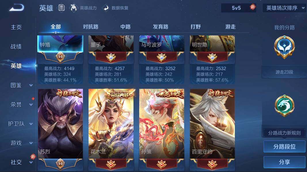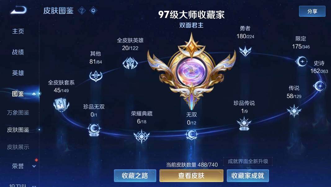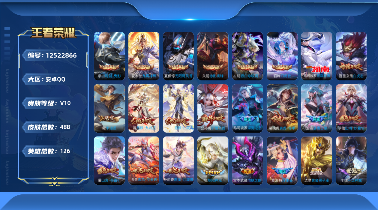 [12522866]【特价急出/详情看图】:安卓Q-V10-至尊星耀III段位-126英雄-488皮肤-6典藏-1珍品传说-58传说-162史诗