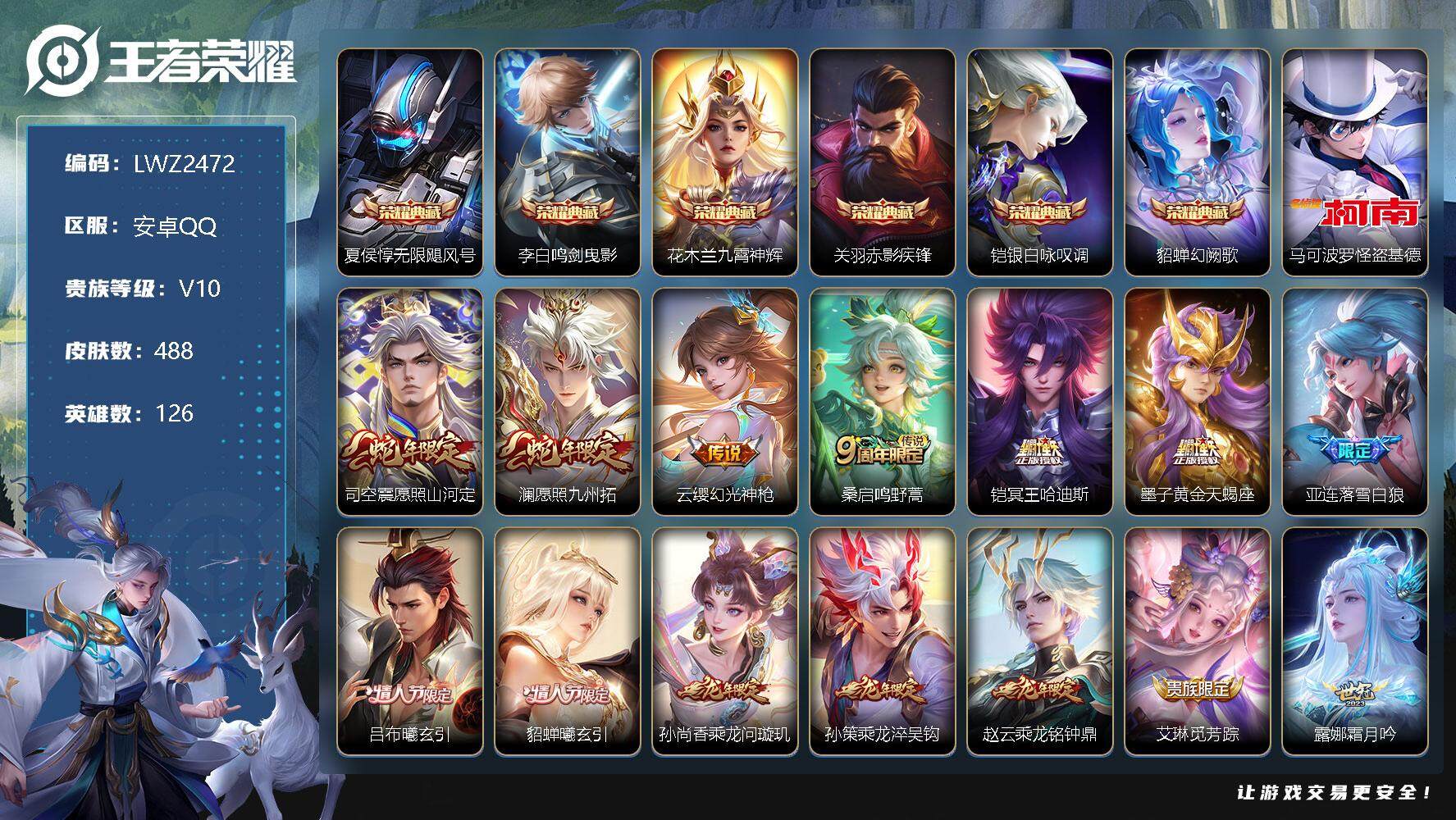 [12522866]【特价急出/详情看图】:安卓Q-V10-至尊星耀III段位-126英雄-488皮肤-6典藏-1珍品传说-58传说-162史诗 【荣耀典藏】:夏侯惇无限飓风号,李白鸣剑曳影,花木兰九霄神辉,关羽赤影疾锋,铠银白咏叹调,貂蝉幻阙歌 【珍品传说】:马可波罗怪盗基德 【传说皮肤】:司空震愿照山河定,澜愿照九州拓,云缨幻光神枪,桑启鸣野蒿,铠冥王哈迪斯,墨子黄金天蝎座,亚连落雪白狼,吕布曦玄引,貂蝉曦玄引,孙尚香乘龙问璇玑,孙策乘龙淬吴钩,赵云乘龙铭钟鼎,艾琳觅芳踪,露娜霜月吟,兰陵王影龙天霄,云缨鹤归松栖,上官婉儿妄想奇谈,诸葛亮鹤羽星尊,张飞百相守梦,夏洛特浮生妄,花木兰燃星之曲,伽罗炽翼辉光,孙悟空齐天大圣,曜山海苍雷引,李信山海炽霜斩,吕布怒海麟威,李白诗剑行,狄仁杰神器狴犴令,不知火舞绯月行,王昭君星穹之声,百里守约碎云,橘右京枫霜尽,娜可露露前尘镜,孙尚香音你闪耀,马可波罗深海之息,马超无双飞将,孙策挚爱之约,露娜启示之音,孙策末日机甲,裴擒虎寅虎赤拳,西施游龙清影,曜李逍遥 ,周瑜音你心动,公孙离祈雪灵祝,诸葛亮时雨天司,镜炽阳神光,虞姬启明星使,孙悟空零号赤焰,关羽武圣,曜云鹰飞将,李信一念神魔,貂蝉猫影幻舞,达摩黄金狮子座,百里玄策白虎志,梦奇胖达荣荣,后羿黄金射手座,宫本武藏地狱之眼,狄仁杰超时空战士 【限定皮肤】:铠冥王哈迪斯,暃埋骨钱,蒙犽顽岩魄,蔡文姬夏日便利店,大乔绒语心约,虞姬夏日便利店,姜子牙天穹之誓,杨戬破阵退雄兵,狄仁杰阴阳师,赵云皇家上将,赵云引擎之心,赵云龙胆,赵云百木心枪,墨子神迹守卫,墨子降魔,妲己时之奇旅,钟无艳超时空战士,扁鹊奇幻香踪,芈月白晶晶,吕布猎兽之王,吕布御风骁将,元歌云间偶戏,元歌无心,甄姬落雪兰心,马可波罗深海之息,马可波罗山海玄木吟,狄仁杰魔术师,狄仁杰神器狴犴令,达摩星际陆战队,项羽海滩派对,老夫子航海奇遇记,关羽武圣,关羽百相守梦,露娜启示之音,刘邦夺宝奇兵,韩信傲雪梅枪,王昭君午后时光,王昭君星穹之声,兰陵王影龙天霄,兰陵王驯魔猎人,兰陵王金庭之子,花木兰默契交锋,花木兰燃星之曲,不知火舞绯月行,娜可露露前尘镜,橘右京枫霜尽,孙悟空至尊宝,孙悟空零号赤焰,孙悟空孙行者,孙悟空齐天大圣,后羿圣弓游侠,刘备百相守梦,张飞百相守梦,李元芳银河之约,李元芳云中旅人,虞姬启明星使,钟馗神迹守卫,杨玉环遇见飞天,杨玉