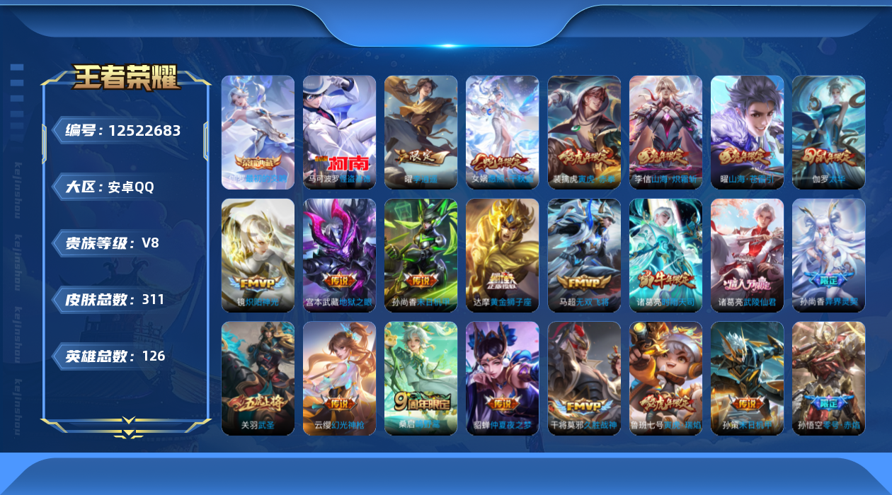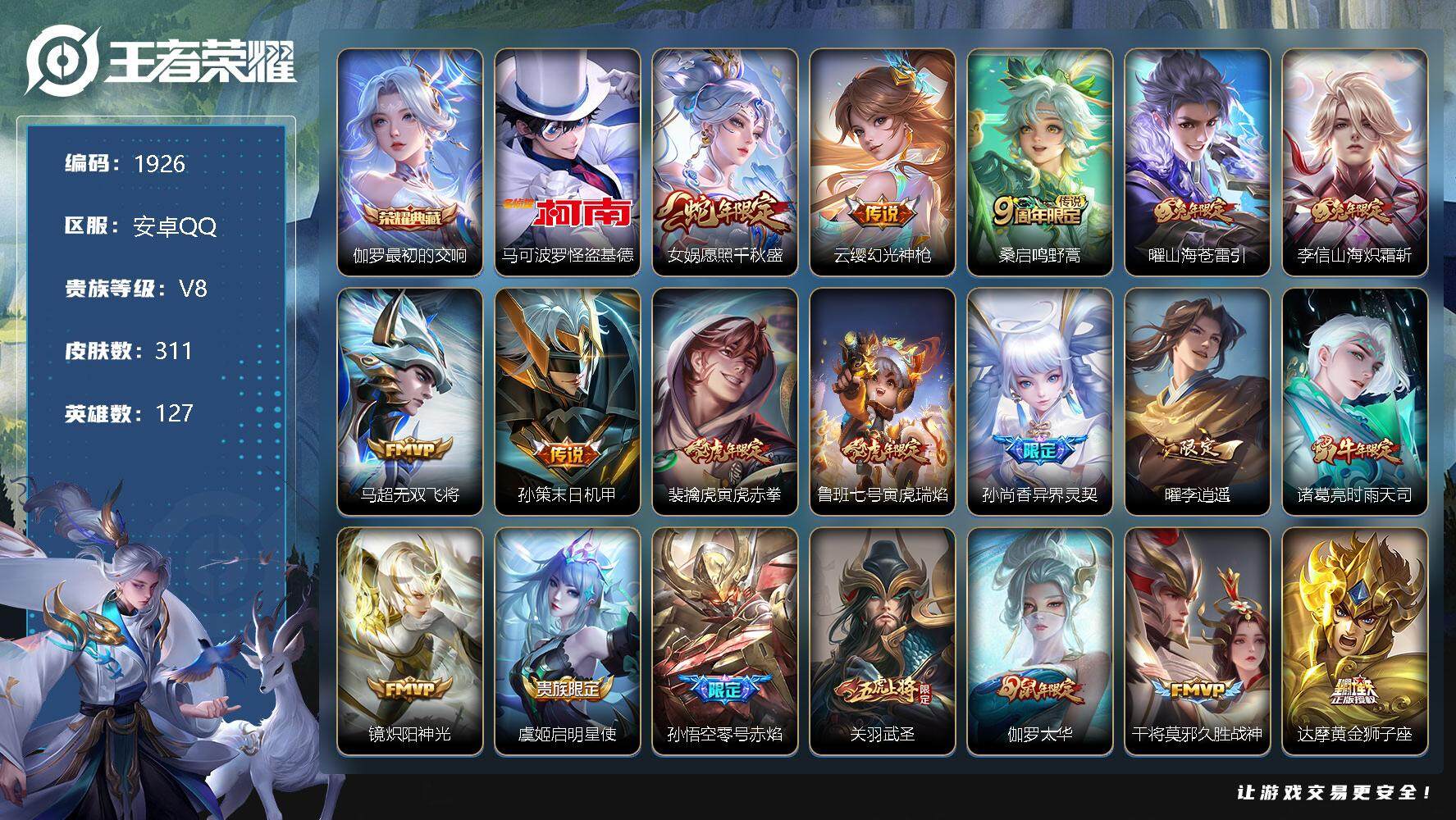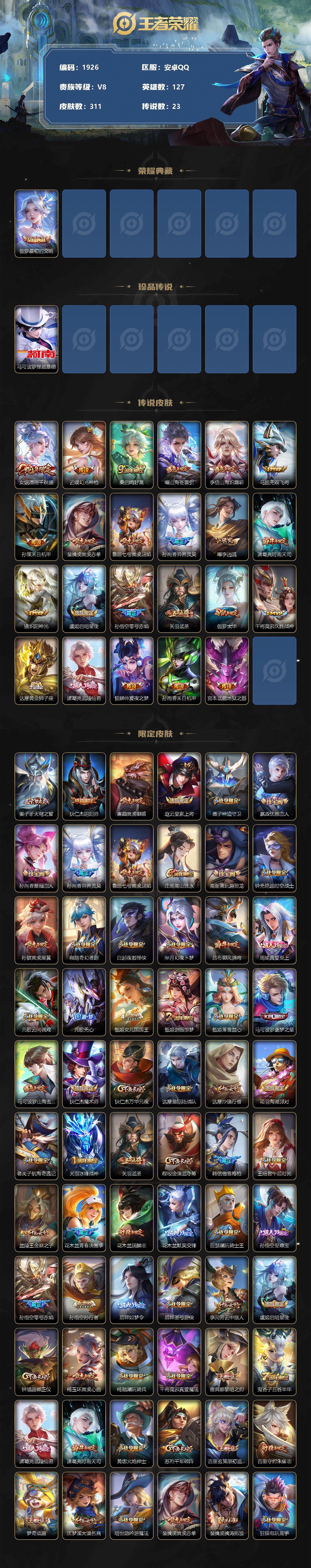 [12522683]【商品标题】:安卓Q-V8-至尊星耀III段位-127英雄-311皮肤-1典藏-0珍品无双-0无双-1珍品传说-23传说-105史诗