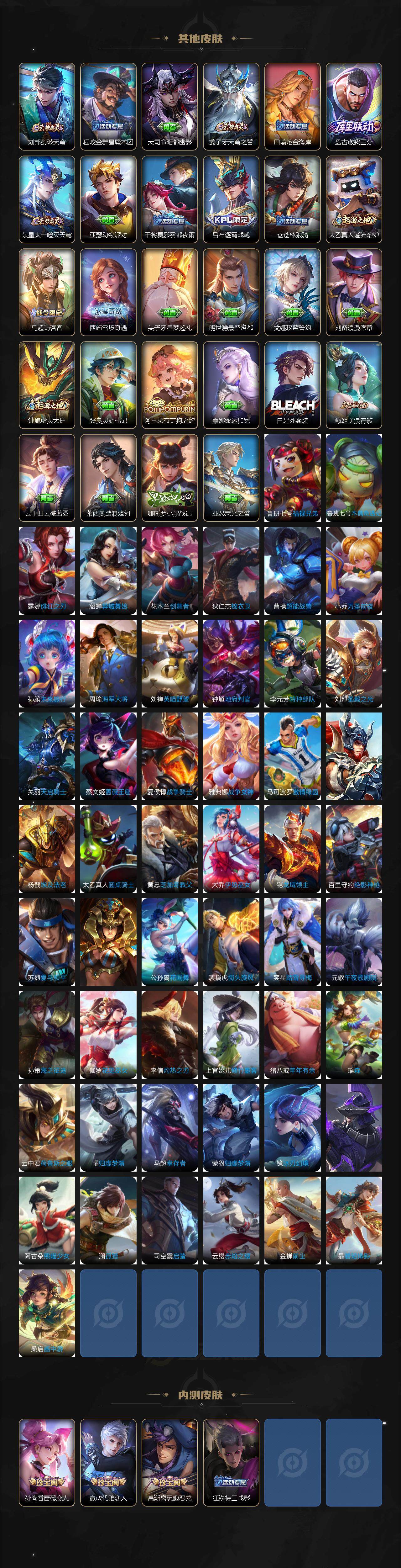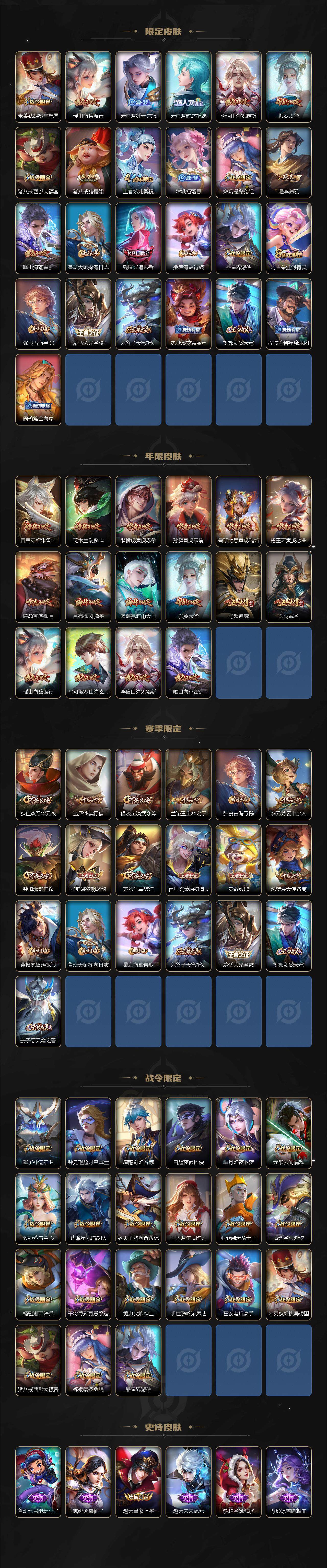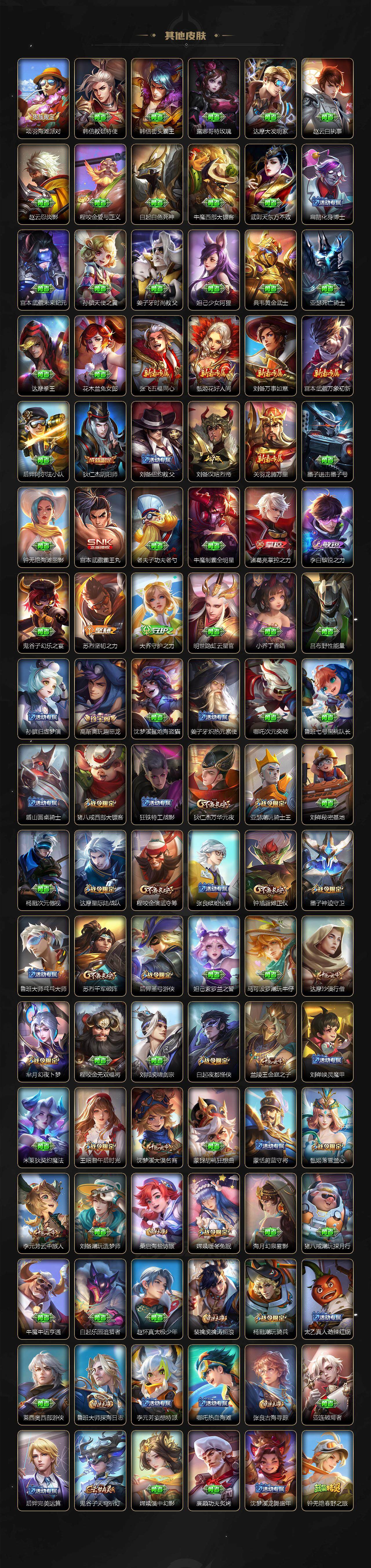 【限定皮肤】:姜子牙天穹之誓,狄仁杰阴阳师,廉颇寅虎御盾,赵云皇家上将,墨子神迹守卫,嬴政优雅恋人,孙尚香蔷薇恋人,孙尚香异界灵契,鲁班七号寅虎瑞焰,庄周高山流水,高渐离玩趣恶龙,钟无艳超时空战士,孙膑寅虎展翼,扁鹊奇幻香踪,白起夜都怪侠,芈月幻夜卜梦,吕布御风骁将,周瑜真爱至上,元歌云间偶戏,元歌无心,甄姬女儿国国王,甄姬游园惊梦,甄姬落雪兰心,马可波罗逐梦之星,马可波罗山海玄木吟,狄仁杰魔术师,狄仁杰万华元夜,达摩星际陆战队,达摩沙漠行僧,项羽海滩派对,老夫子航海奇遇记,关羽冰锋战神,关羽武圣,程咬金演武夺筹,韩信傲雪梅枪,王昭君午后时光,兰陵王金庭之子,花木兰青春决赛季,花木兰瑞麟志,花木兰默契交锋,亚瑟潮玩骑士王,孙悟空至尊宝,孙悟空零号赤焰,孙悟空孙行者,后羿如梦令,后羿圣弓游侠,李元芳云中旅人,虞姬启明星使,钟馗驱傩正仪,杨玉环寅虎心曲,杨戬潮玩骑兵,干将莫邪真爱魔法,雅典娜黎明之约,鬼谷子五谷丰年,诸葛亮武陵仙君,诸葛亮时雨天司,黄忠火炮绅士,苏烈千军破阵,百里玄策原初追逐者,百里守约朱雀志,梦奇顽趣,沈梦溪大漠名商,明世隐吟游魔法,裴擒虎寅虎赤拳,裴擒虎擒涛扼浪,狂铁电玩高手,米莱狄胡桃异想国,瑶山海碧波行,云中君纤云弄巧,云中君时之祈愿,李信山海炽霜斩,伽罗太华,猪八戒西部大镖客,猪八戒猪悟能,上官婉儿梁祝,嫦娥拒霜思,嫦娥暖冬兔眠,曜李逍遥 ,曜山海苍雷引,鲁班大师探海日志,镜匿光追影者,桑启海盐诗旅,暃星界游侠,阿古朵江河有灵,张良古海寻踪,蒙恬荣光圣徽,鬼谷子天穹祈灯,沈梦溪龙舞盛年,刘邦剑破天穹,程咬金群星魔术团,周瑜熔金海岸