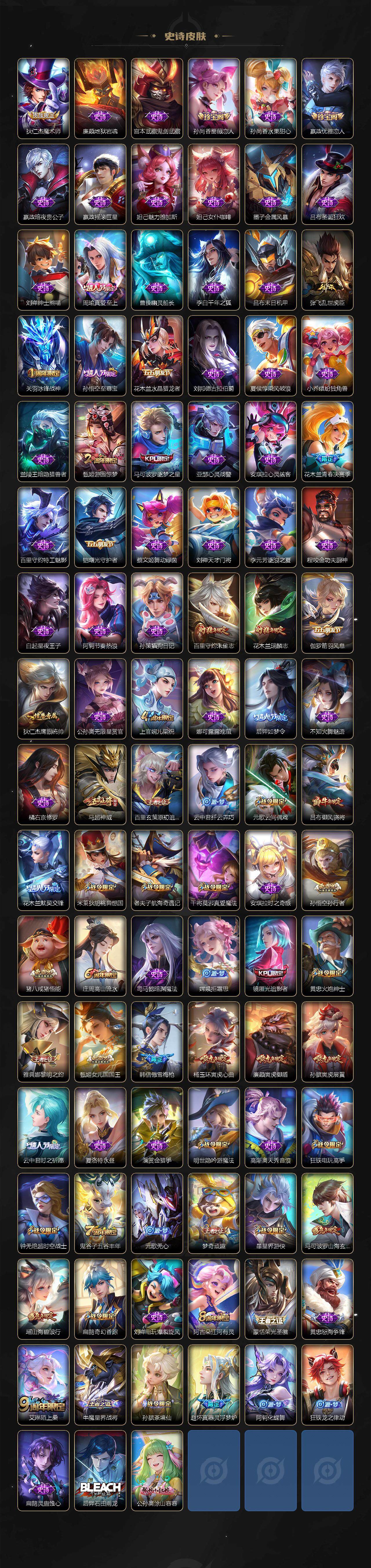 娜可露露晚萤,伽罗箭羽风息,李元芳逐浪之夏,不知火舞魅语,公孙离无限星赏官,孙策猫狗日记,阿轲节奏热浪,露娜紫霞仙子,吕布末日机甲,鲁班七号电玩小子,橘右京修罗,嬴政摇滚巨星,刘禅绅士熊喵,刘禅天才门将,白起星夜王子,安琪拉心灵骇客,安琪拉时之奇旅,程咬金功夫厨神,刘邦德古拉伯爵,兰陵王暗隐猎兽者,曹操幽灵船长,宫本武藏鬼剑武藏,司马懿暗渊魔法,亚瑟心灵战警,蔡文姬舞动绿茵,廉颇地狱岩魂,小乔缤纷独角兽,夏侯惇乘风破浪,花木兰水晶猎龙者,铠曙光守护者,墨子金属风暴,百里玄策原初追逐者,吕布圣诞狂欢,貂蝉圣诞恋歌,百里守约特工魅影,嬴政暗夜贵公子,嫦娥拒霜思,雅典娜黎明之约,李白千年之狐,夏洛特永昼,澜赏金猎手,高渐离天秀·音浪,刘禅电玩·爆裂旋风,赵怀真器灵·浮梦炉