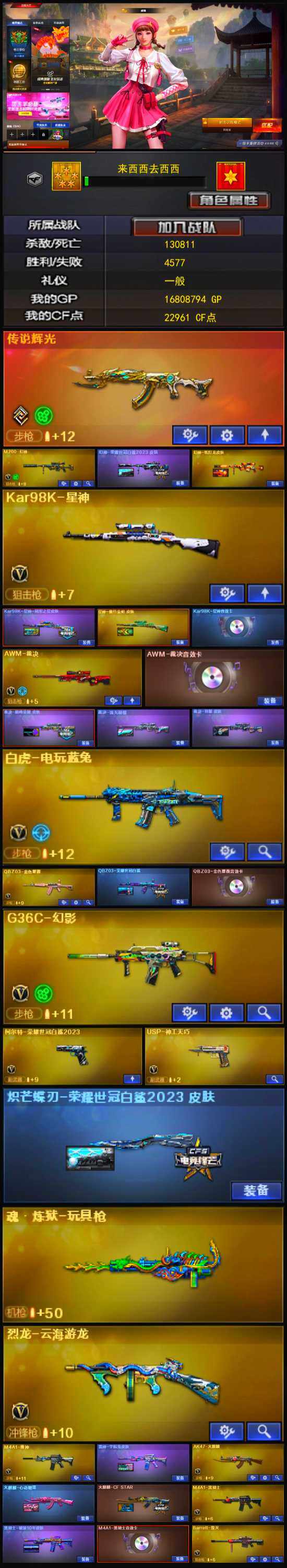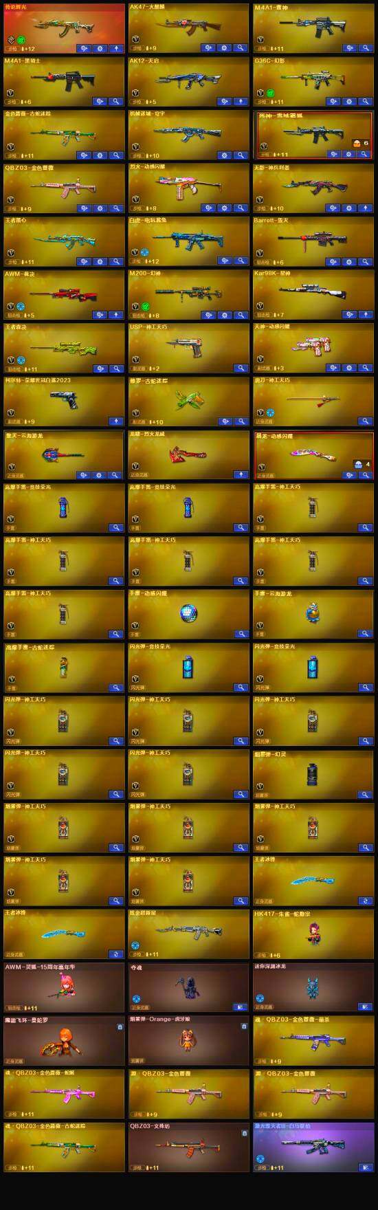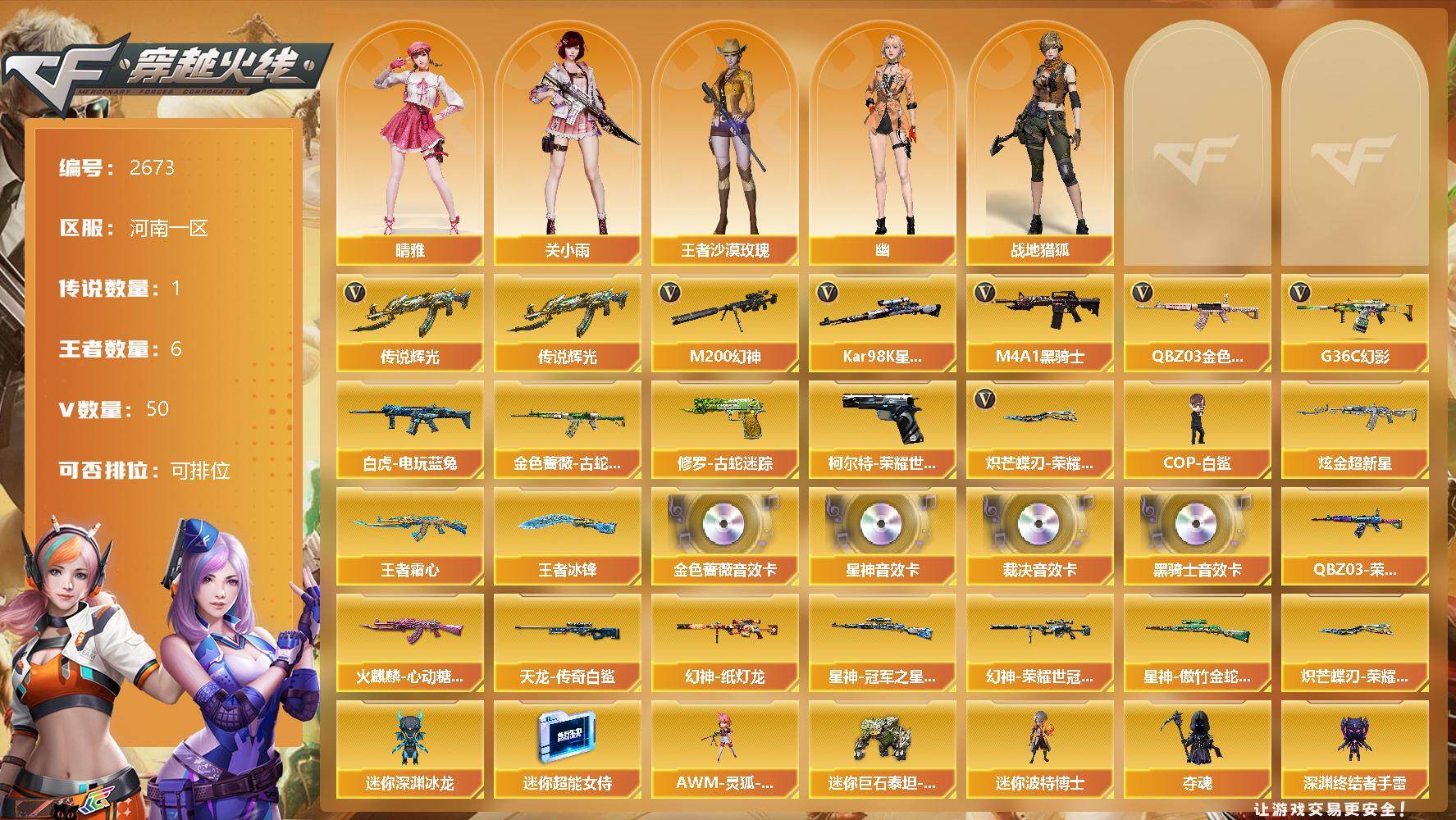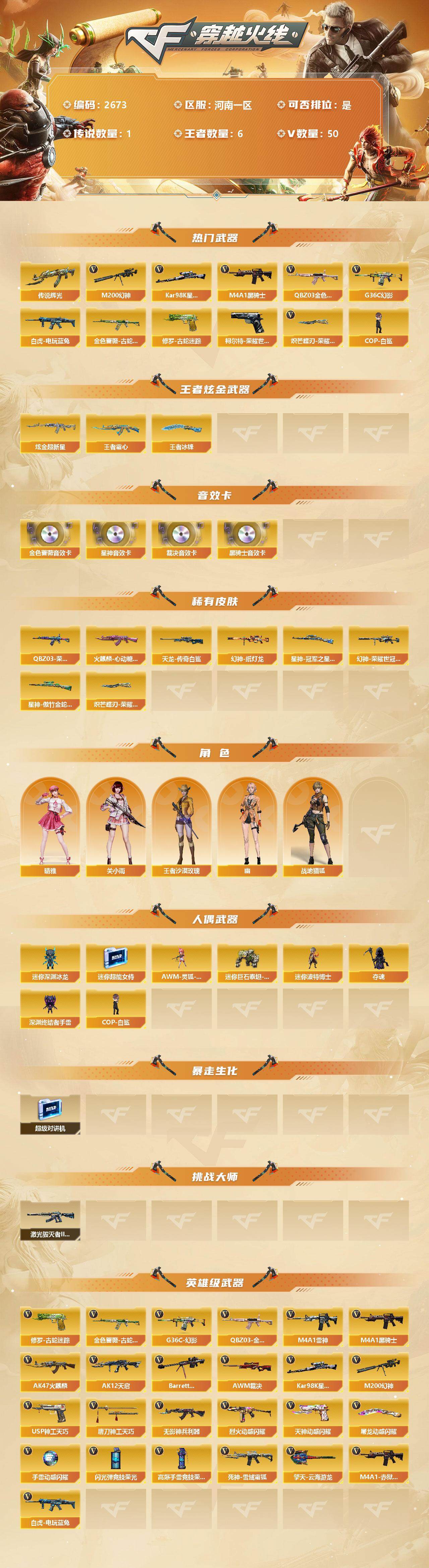 [12522728]【商品标题】:河南一区-50V-6王者-1炫金 【传说武器】:传说辉光 【热门武器】:传说辉光,G36C-幻影,QBZ03-金色蔷薇,M200-幻神,柯尔特-荣耀世冠白鲨2023,金色蔷薇-古蛇迷踪,修罗-古蛇迷踪,白虎-电玩蓝兔,Kar98K-星神,M4A1-黑骑士,COP-白鲨,炽芒蝶刃-荣耀世冠白鲨2023 皮肤 【王者炫金武器】:炫金超新星,王者霜心,王者冰锋*2 【音效卡】:M4A1-黑骑士音效卡,QBZ03-金色蔷薇音效卡,AWM-裁决音效卡,Kar98K-星神音效卡 【稀有皮肤】:幻神-纸灯龙皮肤,幻神-荣耀世冠白鲨2023 皮肤,Kar98K-星神-冠军之星皮肤,星神-傲竹金蛇 皮肤,QBZ03-荣耀世冠白鲨,火麒麟-心动糖果,AWM-天龙-传奇白鲨,炽芒蝶刃-荣耀世冠白鲨2023 皮肤 【角色】:王者沙漠玫瑰,幽,关小雨,晴雅,战地猎狐 【人偶武器】:COP-白鲨,AWM-灵狐-15周年嘉年华,迷你深渊冰龙,迷你超能女侍,迷你巨石泰坦-魔花研究所,迷你波特博士,夺魂,深渊终结者手雷*2 【暴走生化】:超级对讲机 【挑战大师】:激光毁灭者III-白马银枪 【英雄级武器】:USP-神工天巧,唐刀-神工天巧,高爆手雷-竞技荣光*2,闪光弹-竞技荣光*2,烈火-动感闪耀,天神-动感闪耀,屠龙-动感闪耀,手雷-动感闪耀,G36C-幻影,QBZ03-金色蔷薇,金色蔷薇-古蛇迷踪,白虎-电玩蓝兔,无影-神兵利器,M4A1-雷神,M4A1-黑骑士,AK47-火麒麟,AK12-天启,Barrett-毁灭,AWM-裁决,Kar98K-星神,M200-幻神,死神-雪域霜狐,M4A1-赤狱骑士,修罗-古蛇迷踪,擎天-云海游龙 【特殊枪械】:1黑骑士