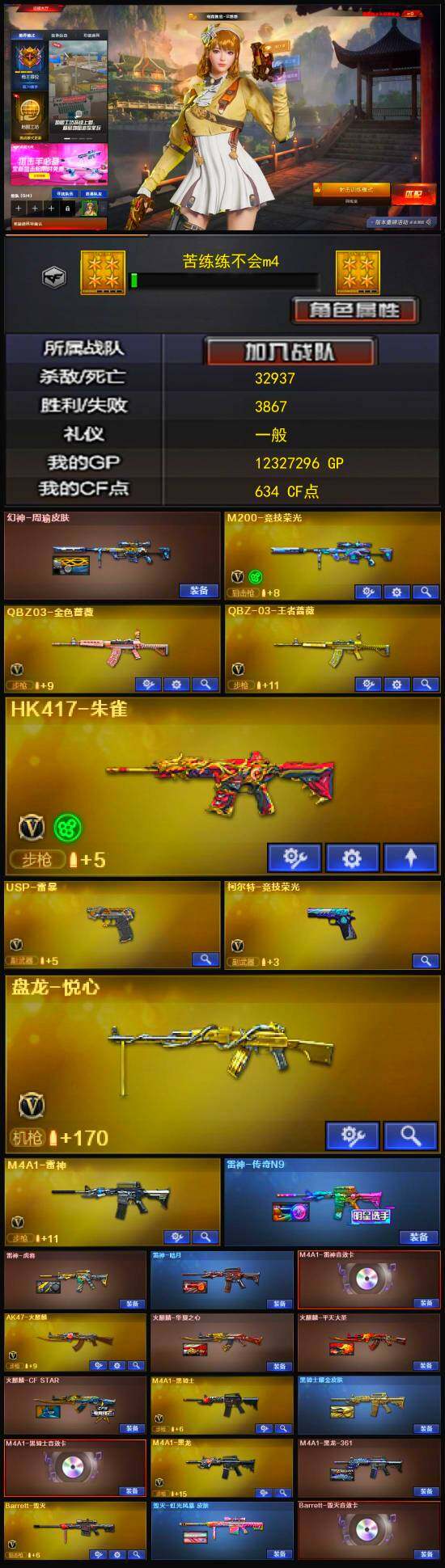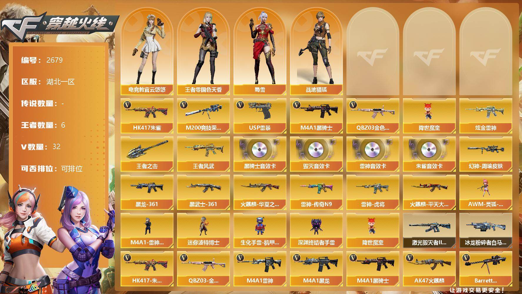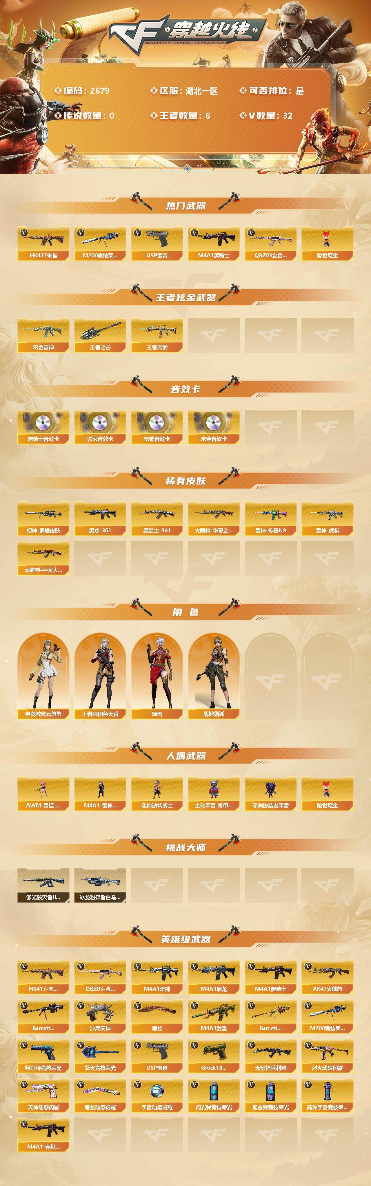 [12523064]【商品标题】:湖北一区-32V-6王者-1炫金 【热门武器】:QBZ03-金色蔷薇,HK417-朱雀,M200-竞技荣光,M4A1-黑骑士,降世魔童,USP-雷暴 【王者炫金武器】:炫金雷神,王者风武,王者之击 【音效卡】:M4A1-雷神音效卡,M4A1-黑骑士音效卡,Barrett-毁灭音效卡,HK417-朱雀音效卡 【稀有皮肤】:幻神-周瑜皮肤,雷神-虎将,雷神-传奇N9,火麒麟-华夏之心,火麒麟-平天大圣,M4A1-黑龙-361,AK47-黑武士-361 【角色】:王者-零-国色天香,电竞教官-云悠悠,战地猎狐,蜀雪 【人偶武器】:降世魔童,AWM-灵狐-15周年嘉年华,M4A1-雷神-精英刀锋,迷你波特博士,生化手雷-机甲核心,深渊终结者手雷 【挑战大师】:激光毁灭者III-白马银枪,冰龙粉碎者-白马银枪 【英雄级武器】:M200-竞技荣光,柯尔特-竞技荣光,擎天-竞技荣光*2,高爆手雷-竞技荣光*3,烟雾弹-竞技荣光,闪光弹-竞技荣光*2,USP-雷暴,M4A1-武圣,Glock18-武圣,烈火-动感闪耀,天神-动感闪耀,屠龙-动感闪耀,手雷-动感闪耀,QBZ03-金色蔷薇,HK417-朱雀,无影-神兵利器,M4A1-雷神,M4A1-黑龙,M4A1-黑骑士,AK47-火麒麟,Barrett-毁灭,Barrett-朱雀,M4A1-赤狱骑士,沙鹰-天神,屠龙*2 【特殊枪械】:1黑骑士