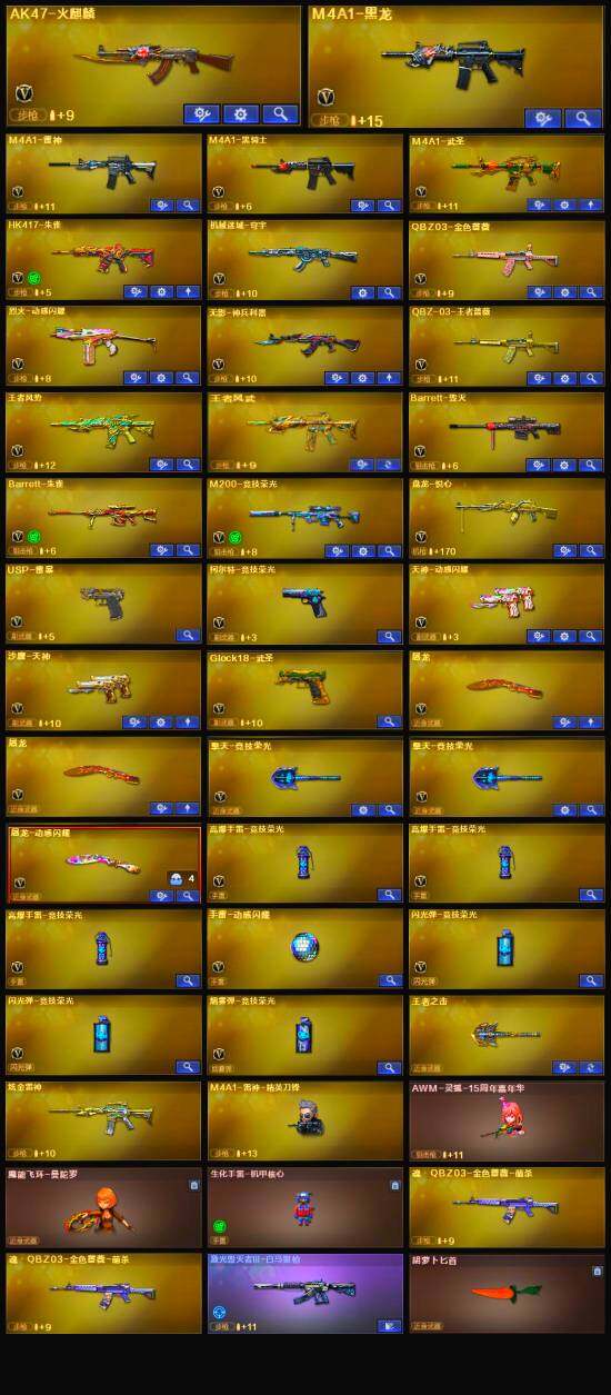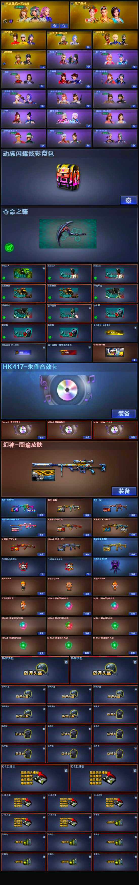 【英雄级武器】:M200-竞技荣光,柯尔特-竞技荣光,擎天-竞技荣光*2,高爆手雷-竞技荣光*3,烟雾弹-竞技荣光,闪光弹-竞技荣光*2,USP-雷暴,M4A1-武圣,Glock18-武圣,烈火-动感闪耀,天神-动感闪耀,屠龙-动感闪耀,手雷-动感闪耀,QBZ03-金色蔷薇,HK417-朱雀,无影-神兵利器,M4A1-雷神,M4A1-黑龙,M4A1-黑骑士,AK47-火麒麟,Barrett-毁灭,Barrett-朱雀,M4A1-赤狱骑士,沙鹰-天神,屠龙*2