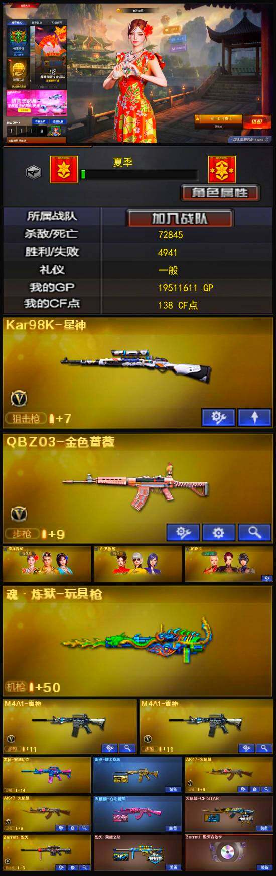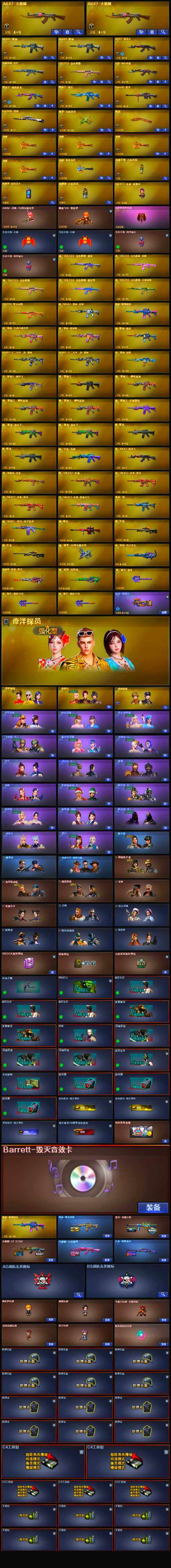 【英雄级武器】:烟雾弹-竞技荣光,QBZ03-金色蔷薇,无影-神兵利器,M4A1-雷神*2,AK47-火麒麟*2,AK47-黑武士,Barrett-毁灭,Kar98K-星神,黑武士-锦绣游龙,黑骑士-海王,修罗-古蛇迷踪,龙啸*4,屠龙,龙啸-热带奇洋