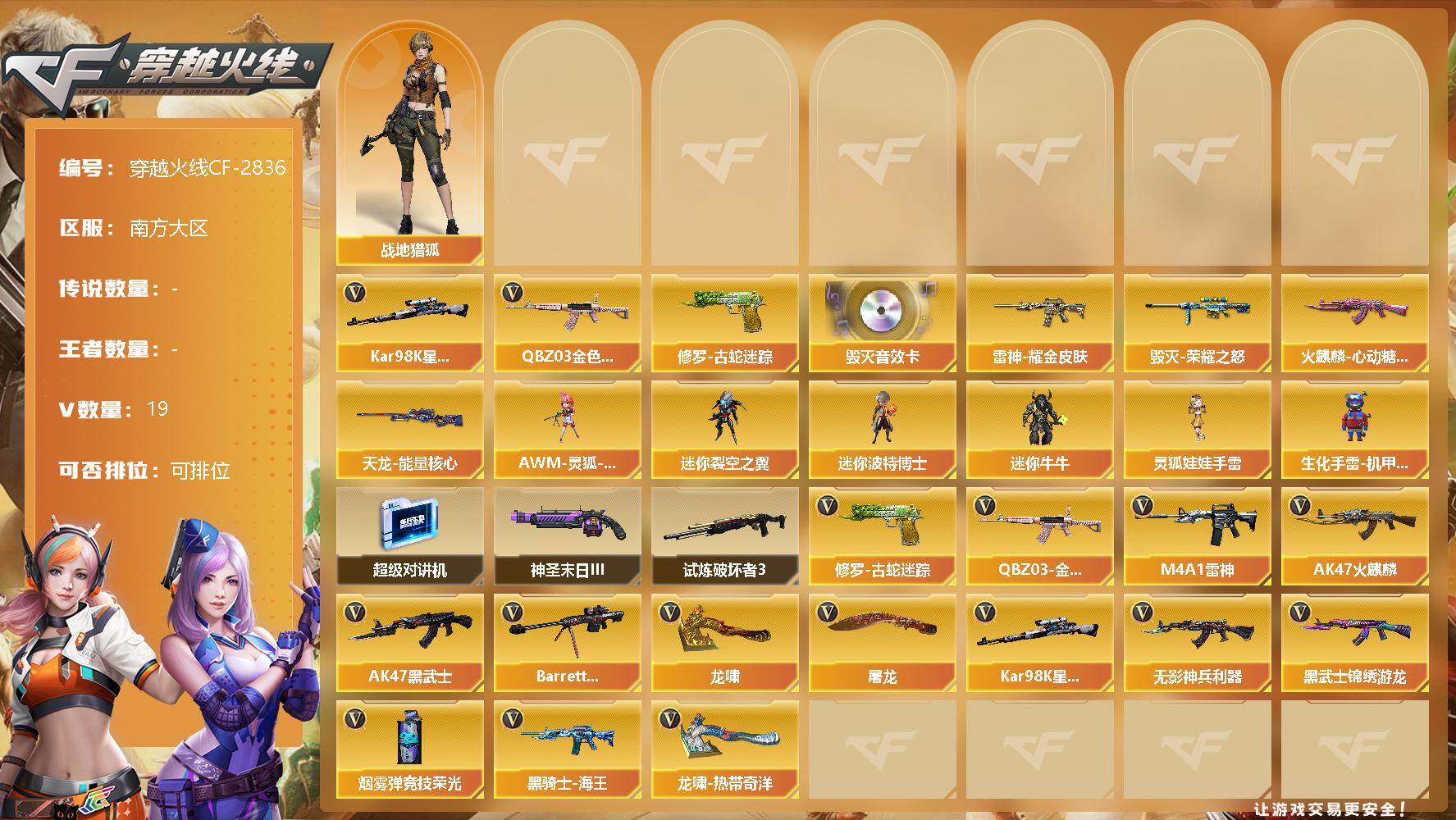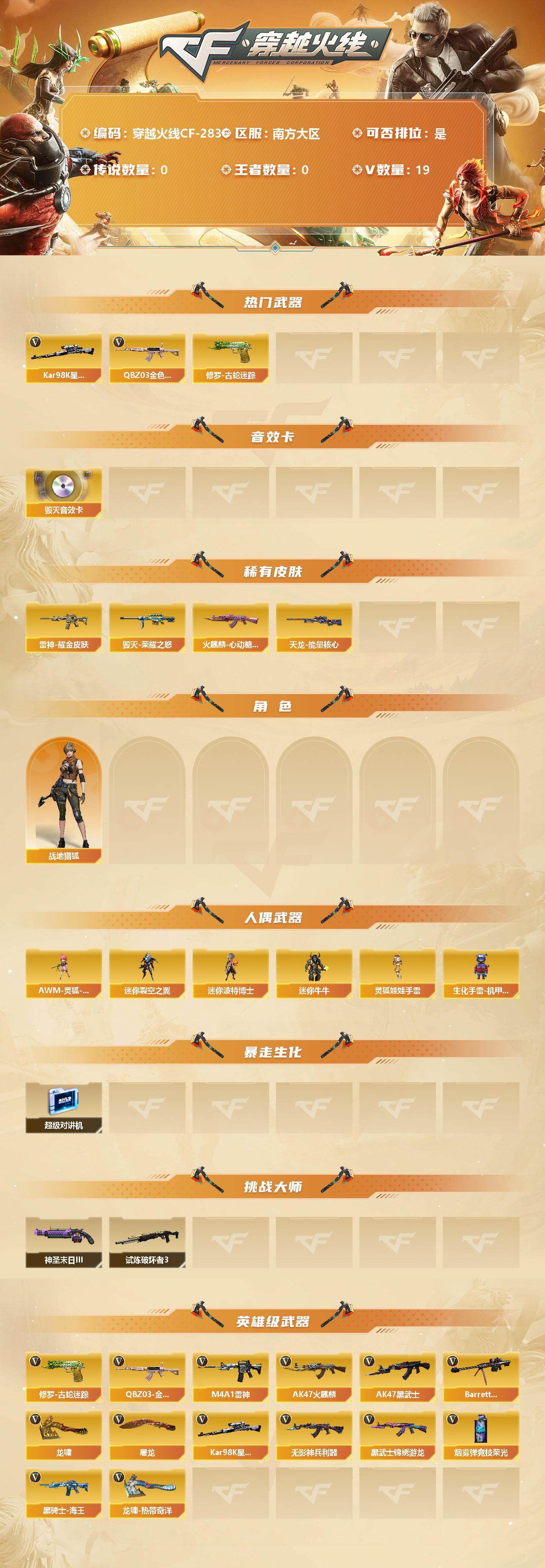 [12523189]【商品标题】:南方大区-19V-0王者-0炫金 【热门武器】:QBZ03-金色蔷薇,修罗-古蛇迷踪,Kar98K-星神 【音效卡】:Barrett-毁灭音效卡 【稀有皮肤】:雷神-耀金皮肤,火麒麟-心动糖果,毁灭-荣耀之怒,天龙-能量核心 【角色】:战地猎狐 【人偶武器】:AWM-灵狐-15周年嘉年华,迷你裂空之翼,迷你波特博士,迷你牛牛,灵狐娃娃手雷,生化手雷-机甲核心*2 【暴走生化】:超级对讲机 【挑战大师】:神圣爆裂者-末日III,试炼破坏者III 【英雄级武器】:烟雾弹-竞技荣光,QBZ03-金色蔷薇,无影-神兵利器,M4A1-雷神*2,AK47-火麒麟*2,AK47-黑武士,Barrett-毁灭,Kar98K-星神,黑武士-锦绣游龙,黑骑士-海王,修罗-古蛇迷踪,龙啸*4,屠龙,龙啸-热带奇洋 【特殊枪械】: