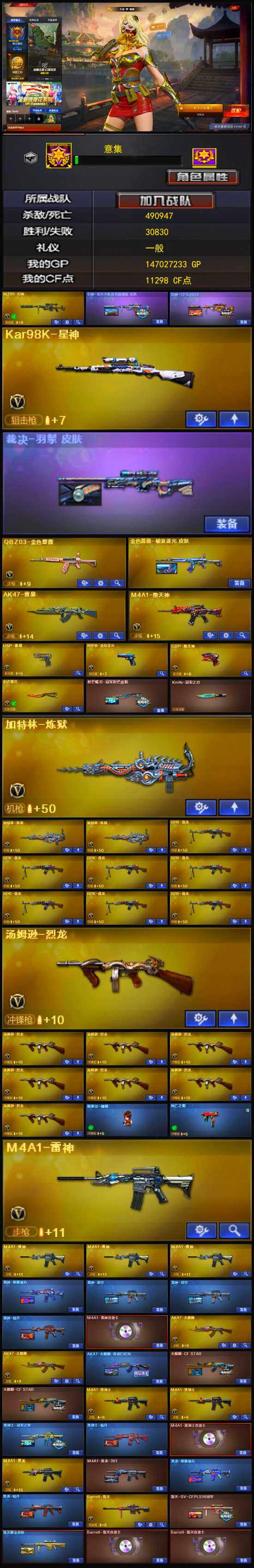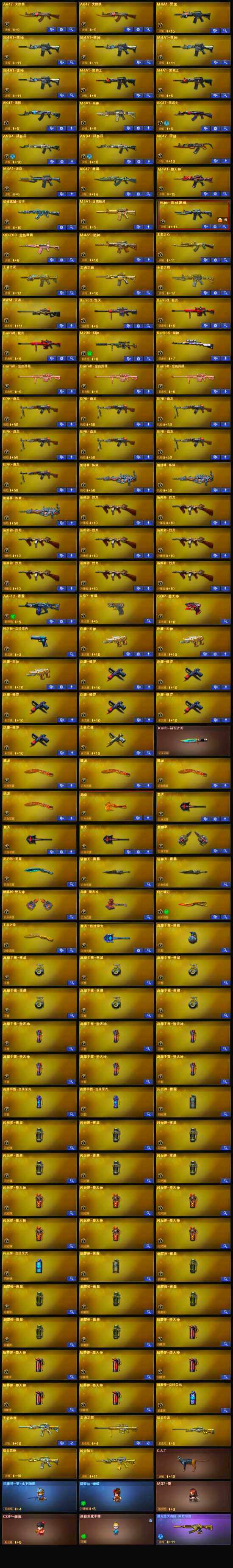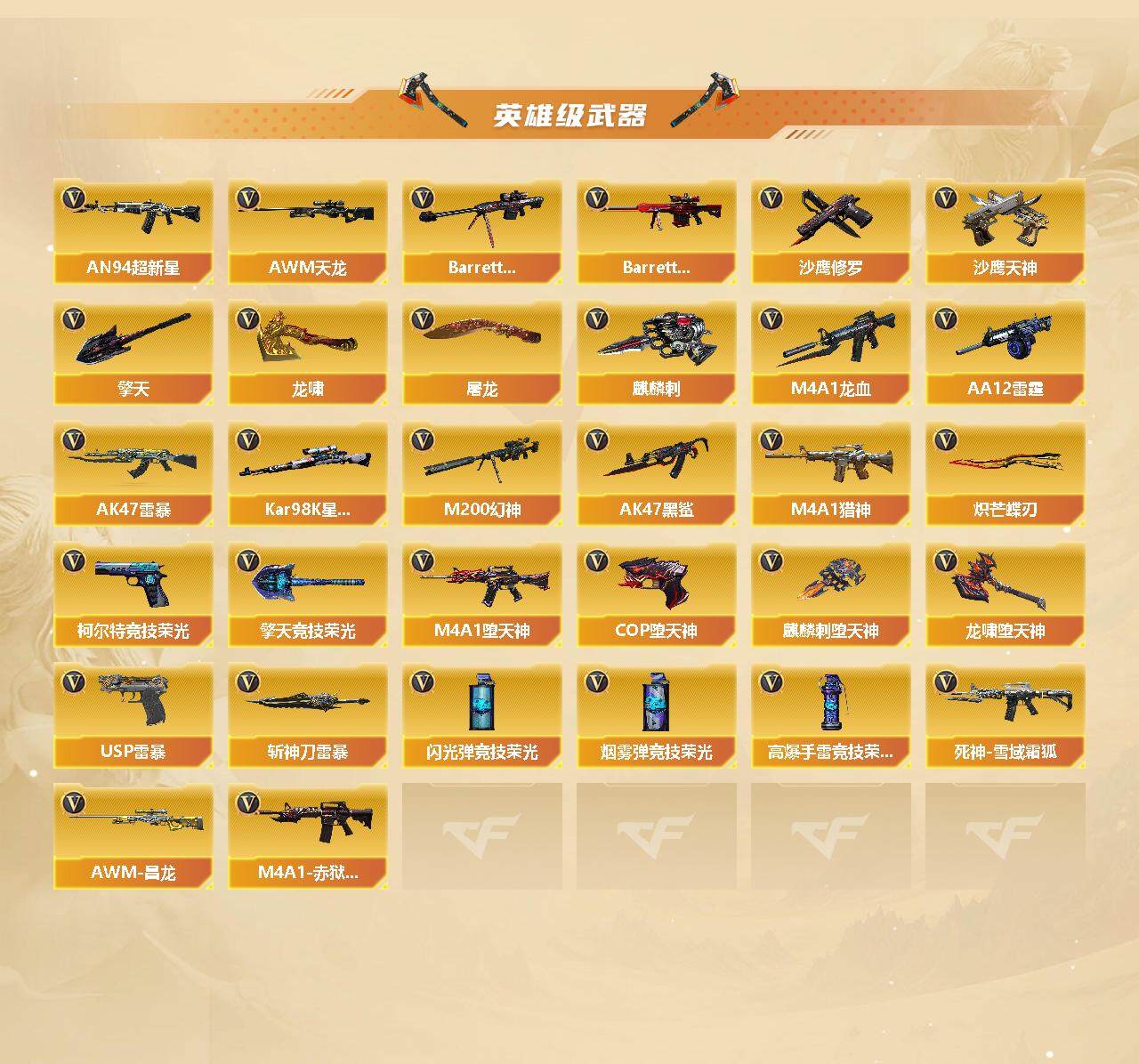【英雄级武器】:柯尔特-竞技荣光,擎天-竞技荣光,高爆手雷-竞技荣光*2,烟雾弹-竞技荣光,闪光弹-竞技荣光,M4A1-堕天神,COP-堕天神,麒麟刺-堕天神,龙啸-堕天神,AK47-雷暴,USP-雷暴,斩神刀-雷暴*2,QBZ03-金色蔷薇,M4A1-雷神*4,M4A1-黑龙,M4A1-玫瑰精灵,M4A1-黑骑士*2,M4A1-死神,RPK-盘龙*7,加特林-炼狱*3,汤姆逊-烈龙*8,AK47-无影,AK47-火麒麟*2,AK47-黑武士,AN94-超新星*2,AWM-天龙,Barrett-毁灭,Barrett-极光*2,M4A1-龙血,AA-12-雷霆,Kar98K-星神,M200-幻神,AK47-黑鲨,M4A1-猎神,死神-雪域霜狐,AWM-昌龙,M4A1-赤狱骑士,沙鹰-天神*3,沙鹰-修罗*6,炽芒蝶刃,麒麟刺,擎天*3,龙啸,屠龙*4
