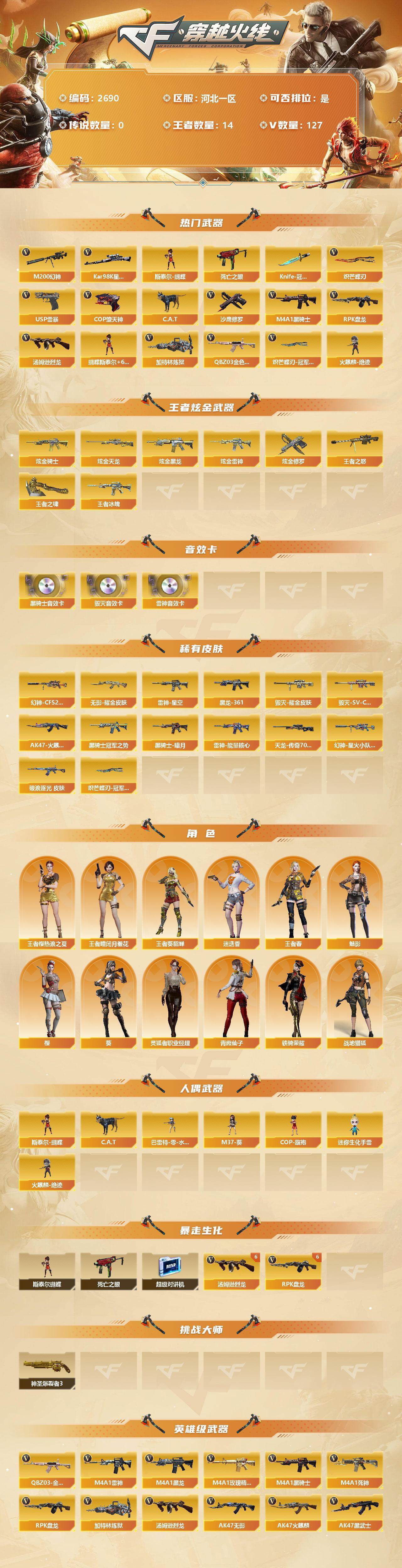 [12523337]【商品标题】:河北一区-127V-14王者-5炫金 【热门武器】:QBZ03-金色蔷薇,M200-幻神,死亡之眼,Kar98K-星神,C.A.T,M4A1-黑骑士*2,汤姆逊-烈龙*8,RPK-盘龙*7,加特林-炼狱*3,斯泰尔-蝴蝶,火麒麟-绝迹,USP-雷暴,COP-堕天神,沙鹰-修罗*6,Knife-冠军之刃,炽芒蝶刃,炽芒蝶刃-冠军炽芒皮肤 【王者炫金武器】:炫金骑士,炫金天龙,炫金黑龙,炫金雷神,炫金修罗,王者冰魄,王者之怒,王者之啸 【音效卡】:M4A1-雷神音效卡,M4A1-黑骑士音效卡,Barrett-毁灭音效卡*2 【稀有皮肤】:幻神-CFS2022,幻神-星火小队签名臻藏版 皮肤,金色蔷薇-破浪逐光 皮肤,雷神-能量核心,雷神-星空*2,AK47-火麒麟-传奇EVEN,黑骑士-暗月,黑骑士-冠军之势,M4A1-黑龙-361,毁灭耀金皮肤,毁灭-SV-CFPLS16冠军,AWM-天龙-传奇70KG,无影耀金皮肤,炽芒蝶刃-冠军炽芒皮肤 【角色】:王者-瞳-闭月羞花,王者樱-热浪之夏,王者-葵-貂蝉,王者春,灵狐者-职业经理,葵,樱,魅影,迷迭香,战地猎狐,铁骑荣耀,青霞仙子 【人偶武器】:火麒麟-绝迹,斯泰尔-蝴蝶,巴雷特-零-水下丽影,M37-葵,COP-旗袍,C.A.T,迷你生化手雷 【暴走生化】:斯泰尔-蝴蝶,死亡之眼,超级对讲机 【挑战大师】:神圣爆裂者III 【英雄级武器】:柯尔特-竞技荣光,擎天-竞技荣光,高爆手雷-竞技荣光*2,烟雾弹-竞技荣光,闪光弹-竞技荣光,M4A1-堕天神,COP-堕天神,麒麟刺-堕天神,龙啸-堕天神,AK47-雷暴,USP-雷暴,斩神刀-雷暴*2,QBZ03-金色蔷薇,M4A1-雷神*4,M4A1-黑龙,M4A1-玫瑰精灵,M4A1-黑骑士*2,M4A1-死神,RPK-盘龙*7,加特林-炼狱*3,汤姆逊-烈龙*8,AK47-无影,AK47-火麒麟*2,AK47-黑武士,AN94-超新星*2,AWM-天龙,Barrett-毁灭,Barrett-极光*2,M4A1-龙血,AA-12-雷霆,Kar98K-星神,M200-幻神,AK47-黑鲨,M4A1-猎神,死神-雪域霜狐,AWM-昌龙,M4A1-赤狱骑士,沙鹰-天神*3,沙鹰-修罗*6,炽芒蝶刃,麒麟刺,擎天*3,龙啸,屠龙*4 【特殊枪械】:蝴蝶斯泰尔+6烈龙