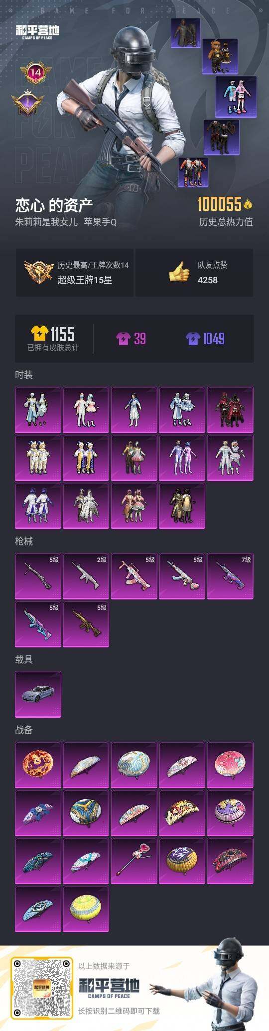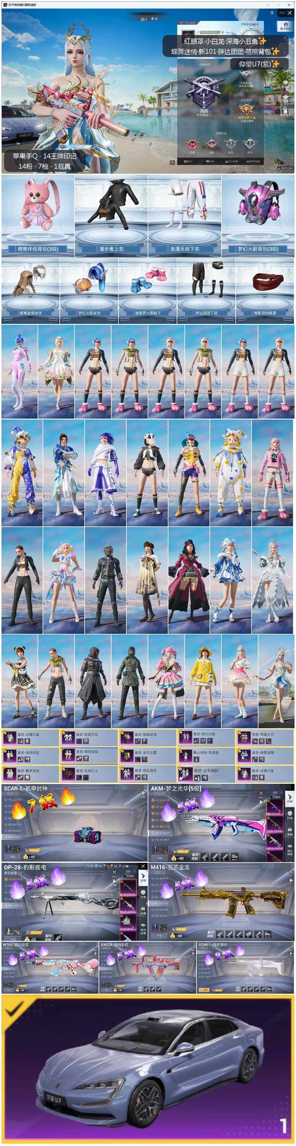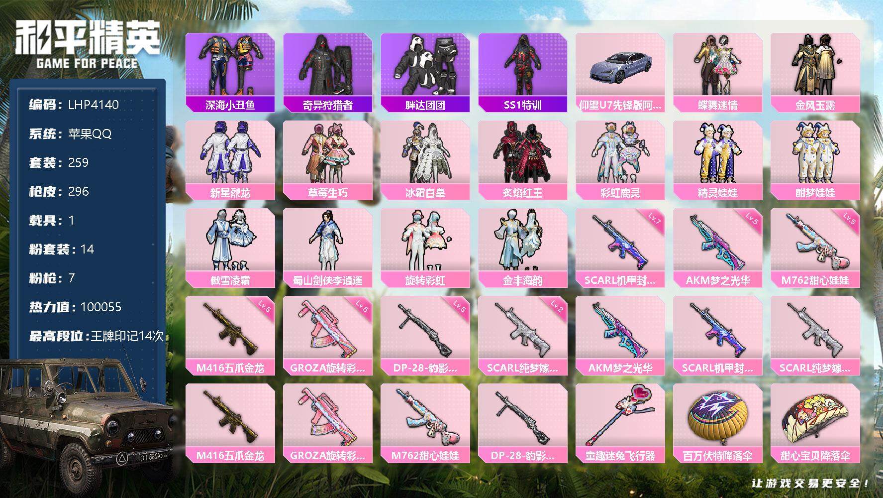 [12523401]【暑期末清货/特价急出/永久包赔】:苹果 手Q-14粉装-7特效枪-1载具-10w热力值-14印记-259套装-296枪皮【热门品类】:套装-深海小丑鱼,套装-奇异狩猎者,套装-胖达团团,套装-SS1特训【稀有载具】:仰望U7(阿盖尔紫)【特效枪等级】:AKM-梦之光华(五级),SCAR-L-机甲封神(七级),SCAR-L-纯梦嫁纱(二级),M416-五爪金龙(五级),GROZA-旋转彩虹(五级),M762-甜心娃娃(五级),DP-28-豹影疾电(五级)【优质套装】:粉装-蝶舞迷情,粉装-梦幻火箭,粉装-金风玉露,粉装-新星烈龙,粉装-草莓生巧,粉装-冰霜白皇,粉装-炙焰红王,粉装-彩虹鹿灵,粉装-精灵娃娃,粉装-酣梦娃娃,粉装-傲雪凌霜,蜀山剑侠-李逍遥,粉装-旋转彩虹,粉装-金丰海韵【优质飞行器】:童趣迷兔飞行器