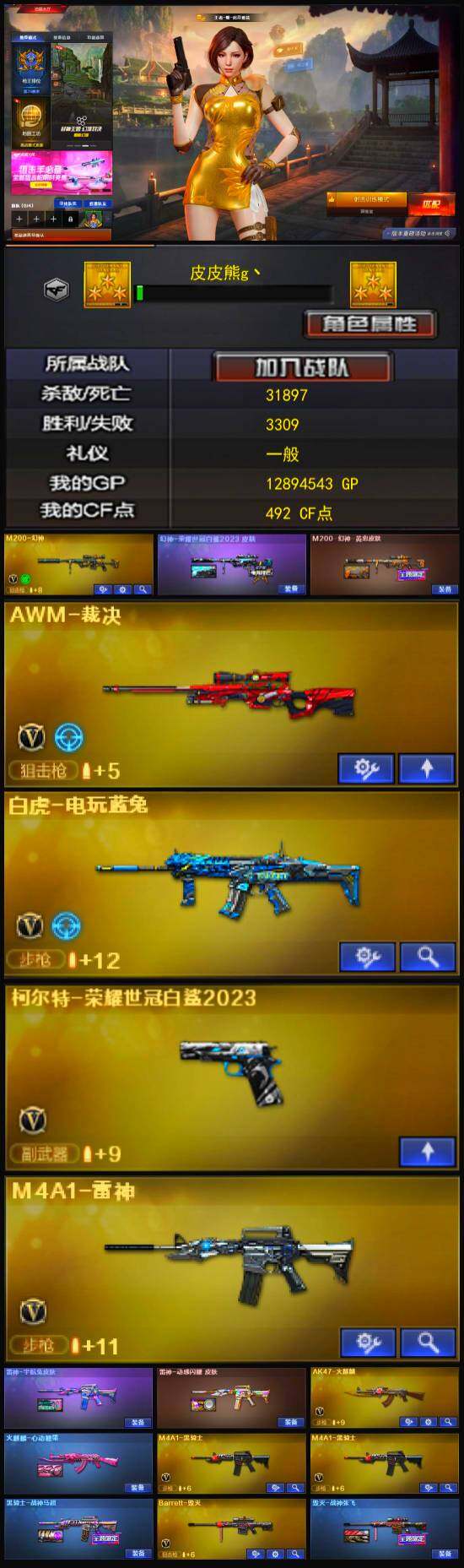 - [11598987]1传说角色 1炫金武器 62V武器 可二次 可修改实名 优质装备:M200-幻神,M200-竞技荣光,QBZ03-金色蔷薇,白虎-电玩蓝兔,AK47-火麒麟,M4A1-雷神,M4A1-武圣,Barrett-毁灭,AWM-裁决,AK12-天启,9A91-烈火,屠龙,柯尔特-竞技荣光,擎天-竞技荣光,Barrett-暗月传说,斩神刀-雷暴,烈火-动感闪耀,天神-动感闪耀,屠龙-动感闪耀,擎天-云海游龙,AK47-黑武士-锦绣游龙,Glock18-武圣,烈龙-云海游龙,无影-神兵利器,金色蔷薇-古蛇迷踪,修罗-古蛇迷踪 V武器:AK47-B-战士,AK47-B-战神,黑骑士-海王 王者武器:王者冰魄-觉醒版,QBZ-03-王者蔷薇-觉醒版,王者之影-觉醒版,王者之锋-觉醒版,COP 357-雷霆王者-觉醒版,王者之力-觉醒版,王者星神-觉醒版 炫金武器:炫金修罗 热门武器:裁决-雪莉杨