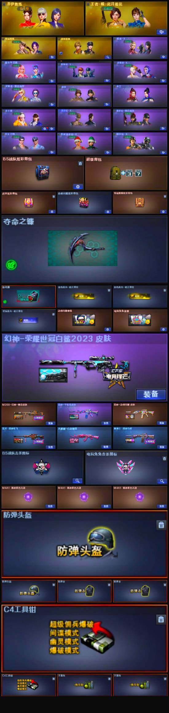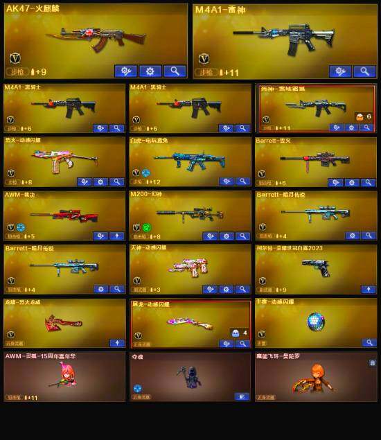 【英雄级武器】:烈火-动感闪耀,天神-动感闪耀,屠龙-动感闪耀,手雷-动感闪耀,白虎-电玩蓝兔,M4A1-雷神,M4A1-黑骑士*2,AK47-火麒麟,Barrett-毁灭,AWM-裁决,M200-幻神,死神-雪域霜狐,AK-47-猩红传说,M4A1-赤狱骑士