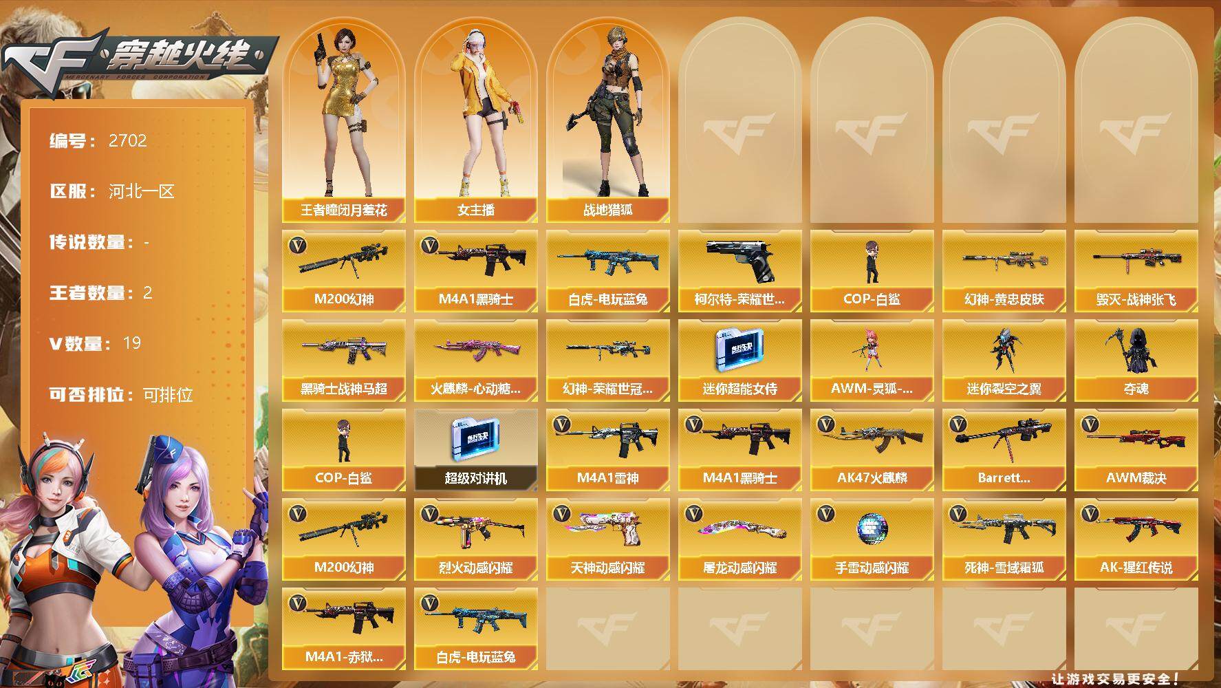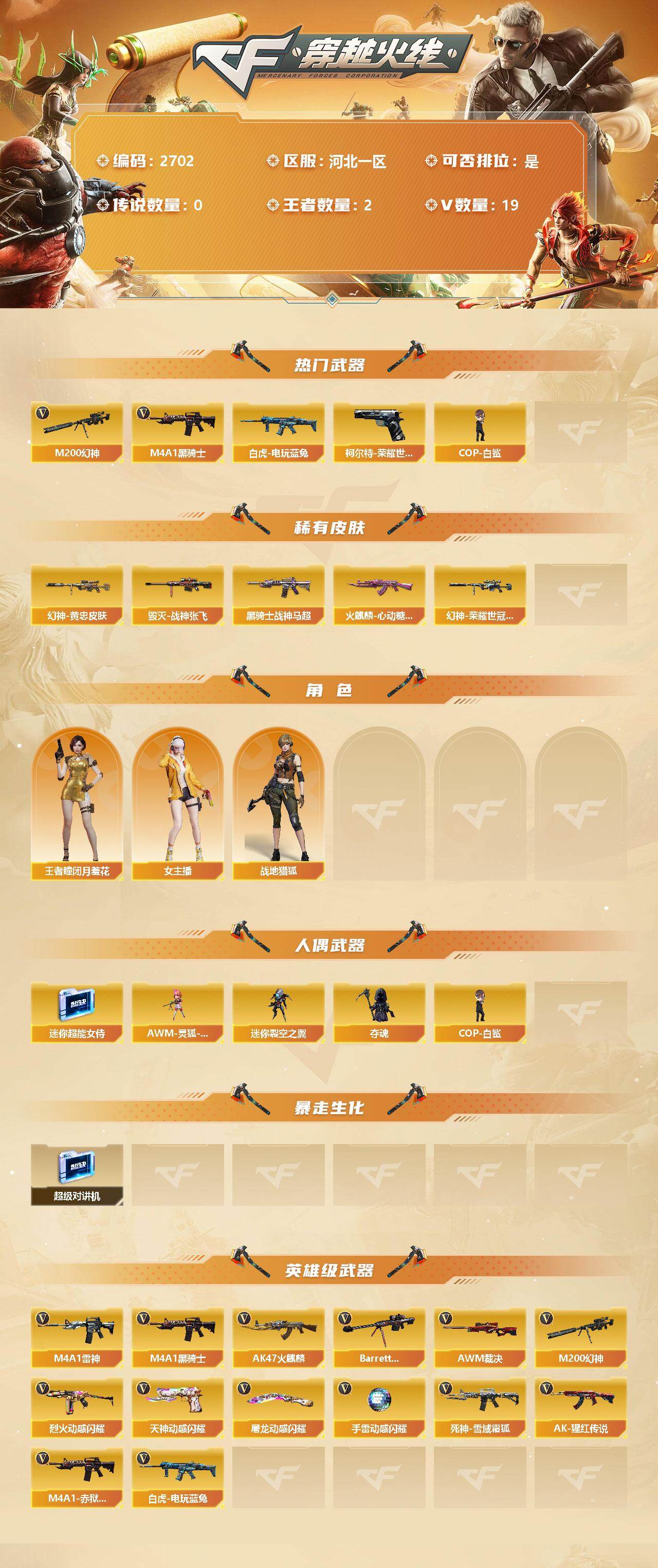 [12523806]【商品标题】:河北一区-19V-2王者-0炫金 【热门武器】:M200-幻神,柯尔特-荣耀世冠白鲨2023,白虎-电玩蓝兔,M4A1-黑骑士*2,COP-白鲨 【稀有皮肤】:M200-幻神-黄忠皮肤,幻神-荣耀世冠白鲨2023 皮肤,火麒麟-心动糖果,黑骑士-战神马超,毁灭-战神张飞 【角色】:王者-瞳-闭月羞花,战地猎狐,女主播 【人偶武器】:COP-白鲨,AWM-灵狐-15周年嘉年华,迷你超能女侍,迷你裂空之翼,夺魂 【暴走生化】:超级对讲机 【英雄级武器】:烈火-动感闪耀,天神-动感闪耀,屠龙-动感闪耀,手雷-动感闪耀,白虎-电玩蓝兔,M4A1-雷神,M4A1-黑骑士*2,AK47-火麒麟,Barrett-毁灭,AWM-裁决,M200-幻神,死神-雪域霜狐,AK-47-猩红传说,M4A1-赤狱骑士 【特殊枪械】:2黑骑士