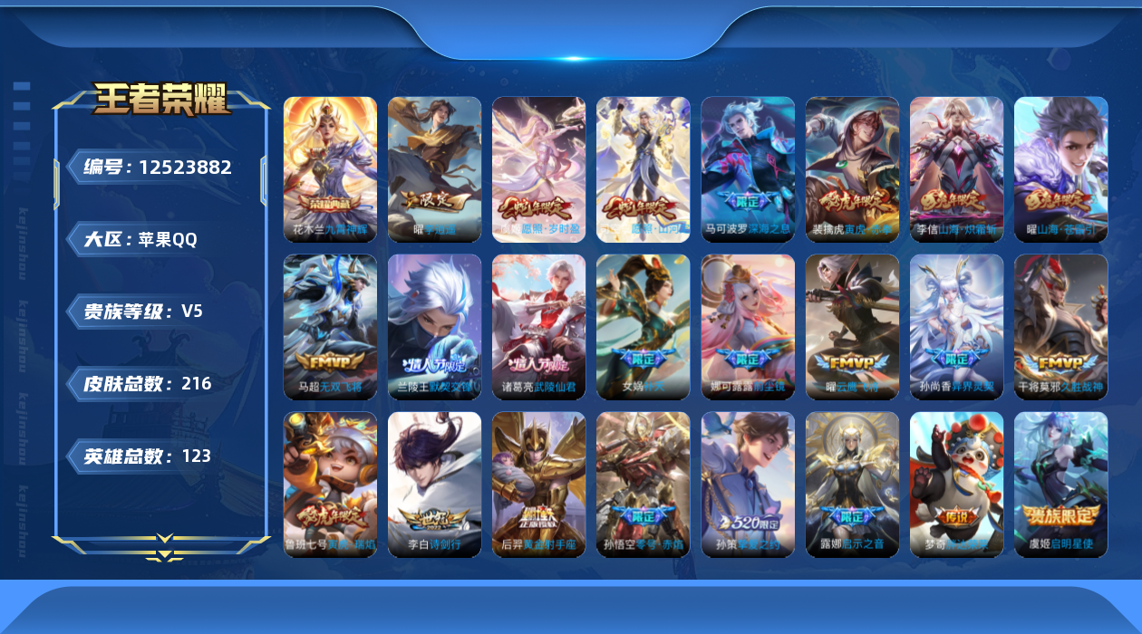 [12523882]【商品标题】:苹果Q-V5-至尊星耀III段位-123英雄-216皮肤-1典藏-0珍品无双-0无双-0珍品传说-24传说-65史诗