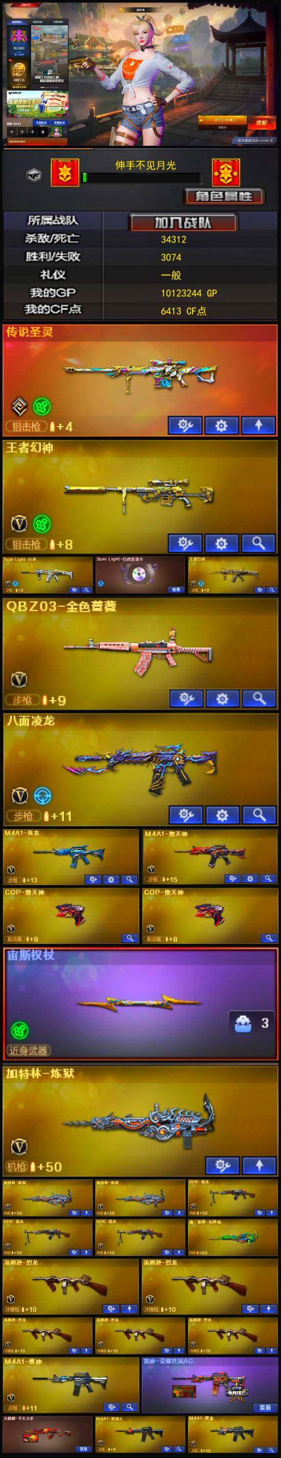 【热门武器】:传说圣灵,QBZ03-金色蔷薇,Scar Light-白虎,M4A1-青龙,八面凌龙,M4A1-黑骑士,汤姆逊-烈龙*5,RPK-盘龙*3,加特林-炼狱*3,COP-堕天神*2,沙鹰-修罗