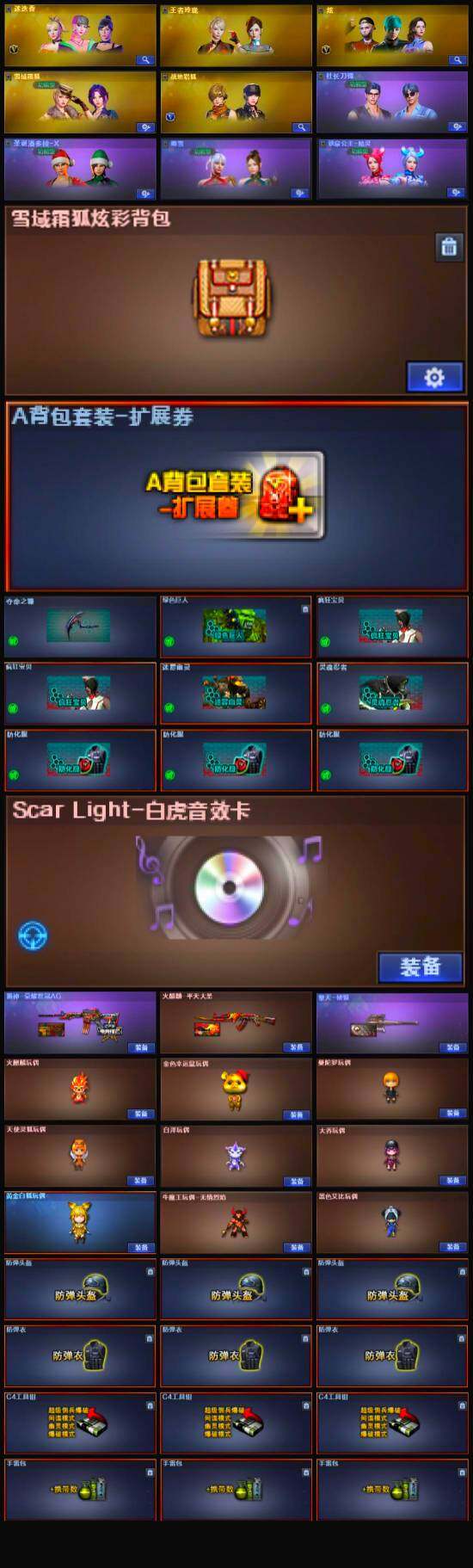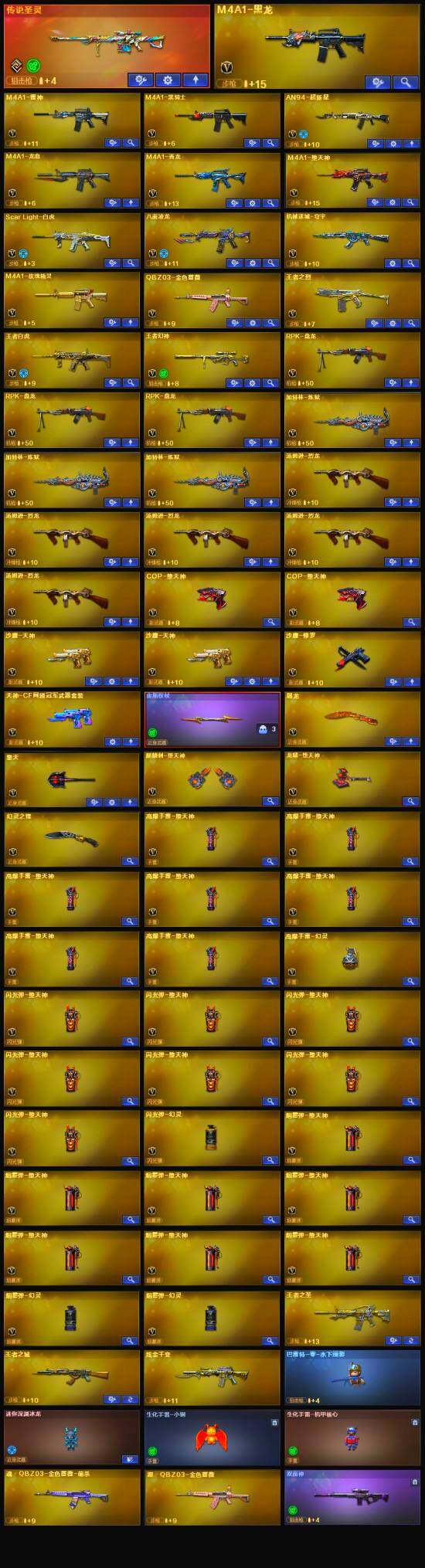 【英雄级武器】:幻灵之锋,M4A1-堕天神,COP-堕天神*2,麒麟刺-堕天神,龙啸-堕天神,QBZ03-金色蔷薇,Scar Light-白虎,M4A1-青龙,八面凌龙,M4A1-雷神,M4A1-黑龙,M4A1-玫瑰精灵,M4A1-黑骑士,RPK-盘龙*3,加特林-炼狱*3,汤姆逊-烈龙*5,AN94-超新星,M4A1-龙血,M4A1-赤狱骑士,沙鹰-天神*2,沙鹰-修罗,擎天,屠龙