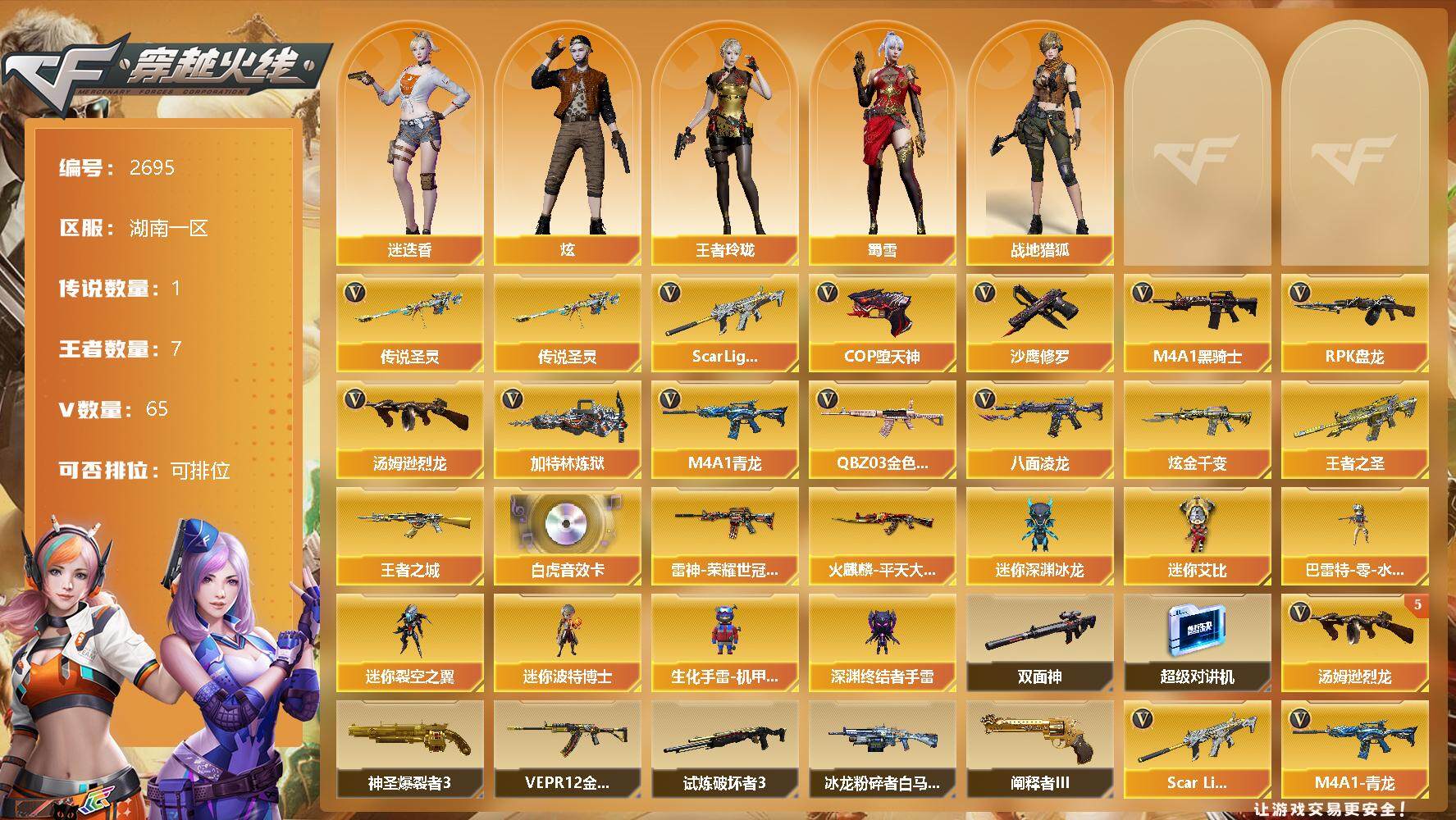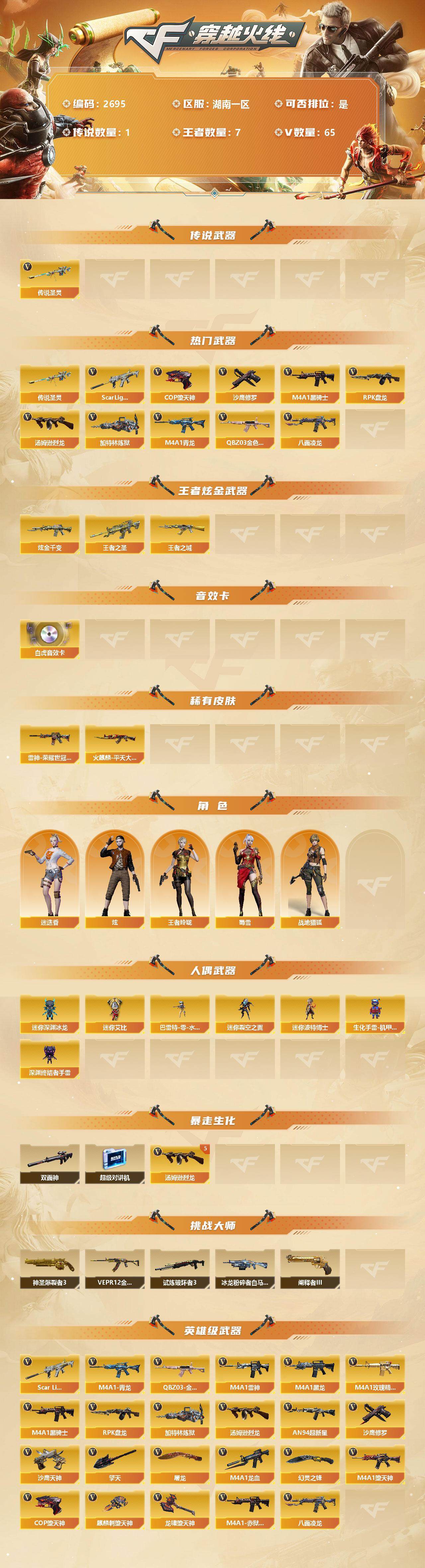 [12523473]【商品标题】:湖南一区-65V-7王者-1炫金 【传说武器】:传说圣灵 【热门武器】:传说圣灵,QBZ03-金色蔷薇,Scar Light-白虎,M4A1-青龙,八面凌龙,M4A1-黑骑士,汤姆逊-烈龙*5,RPK-盘龙*3,加特林-炼狱*3,COP-堕天神*2,沙鹰-修罗 【王者炫金武器】:炫金千变,王者之圣,王者之城 【音效卡】:Scar Light-白虎音效卡 【稀有皮肤】:雷神-荣耀世冠AG,火麒麟-平天大圣 【角色】:王者玲珑,炫,迷迭香,战地猎狐,蜀雪 【人偶武器】:巴雷特-零-水下丽影,迷你深渊冰龙,迷你艾比,迷你裂空之翼*2,迷你波特博士*3,生化手雷-机甲核心,深渊终结者手雷 【暴走生化】:双面神,超级对讲机 【挑战大师】:神圣爆裂者III,阐释者III,试炼破坏者III,VEPR-12-金魔,冰龙粉碎者-白马银枪 【英雄级武器】:幻灵之锋,M4A1-堕天神,COP-堕天神*2,麒麟刺-堕天神,龙啸-堕天神,QBZ03-金色蔷薇,Scar Light-白虎,M4A1-青龙,八面凌龙,M4A1-雷神,M4A1-黑龙,M4A1-玫瑰精灵,M4A1-黑骑士,RPK-盘龙*3,加特林-炼狱*3,汤姆逊-烈龙*5,AN94-超新星,M4A1-龙血,M4A1-赤狱骑士,沙鹰-天神*2,沙鹰-修罗,擎天,屠龙 【特殊枪械】:1白虎,1黑骑士,5烈龙,3盘龙,3炼狱