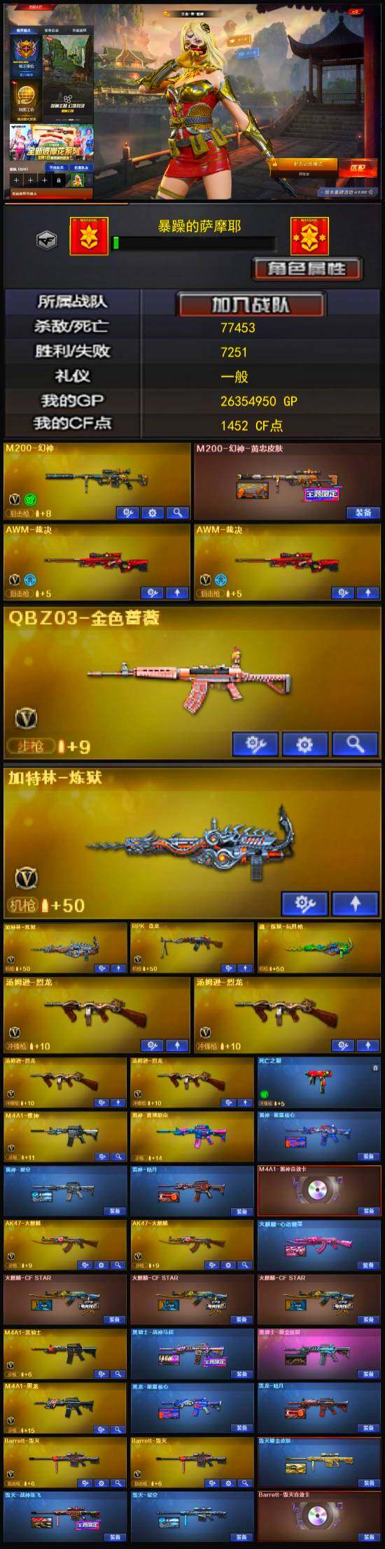 【热门武器】:QBZ03-金色蔷薇,M200-幻神,死亡之眼,M4A1-黑骑士,汤姆逊-烈龙*4,RPK-盘龙,加特林-炼狱*2,沙鹰-修罗*2