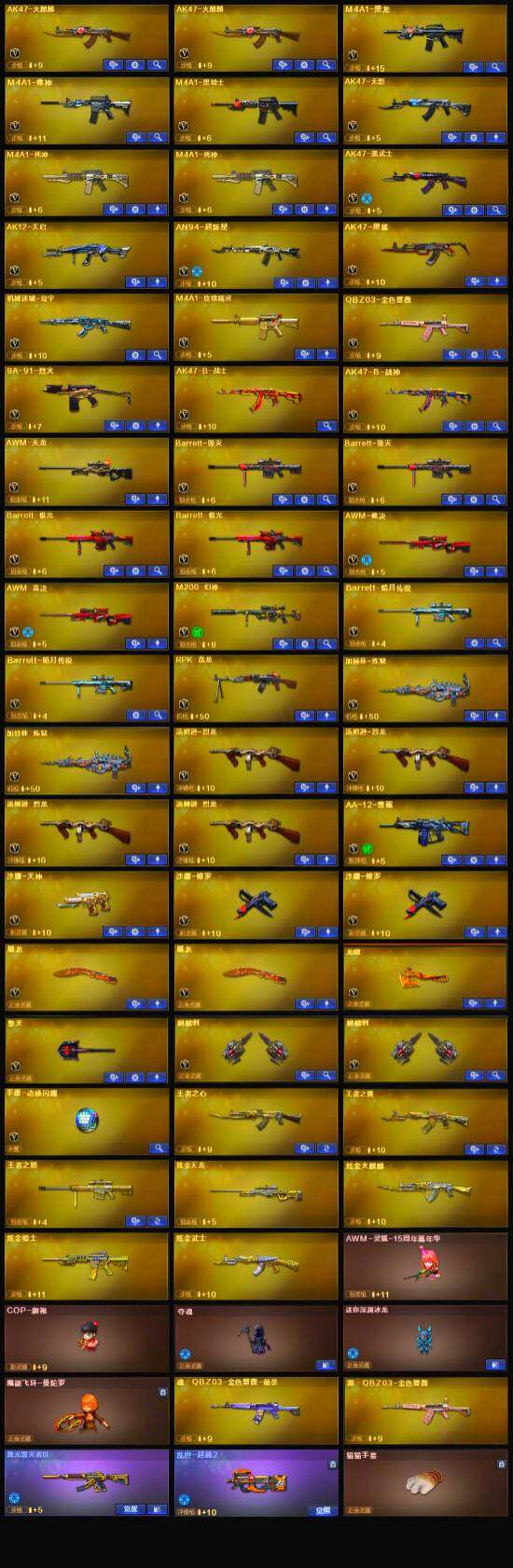 【英雄级武器】:手雷-动感闪耀,QBZ03-金色蔷薇,M4A1-雷神,M4A1-黑龙,M4A1-玫瑰精灵,M4A1-黑骑士,M4A1-死神*2,RPK-盘龙,加特林-炼狱*2,汤姆逊-烈龙*4,AK47-无影,AK47-火麒麟*2,AK47-黑武士,AK12-天启,AN94-超新星,AWM-天龙,Barrett-毁灭*2,Barrett-极光*2,AWM-裁决*2,AA-12-雷霆,M200-幻神,AK47-黑鲨,AK-47-猩红传说*3,AK47-B-战神,沙鹰-天神,沙鹰-修罗*2,麒麟刺*2,擎天,龙啸,屠龙*2