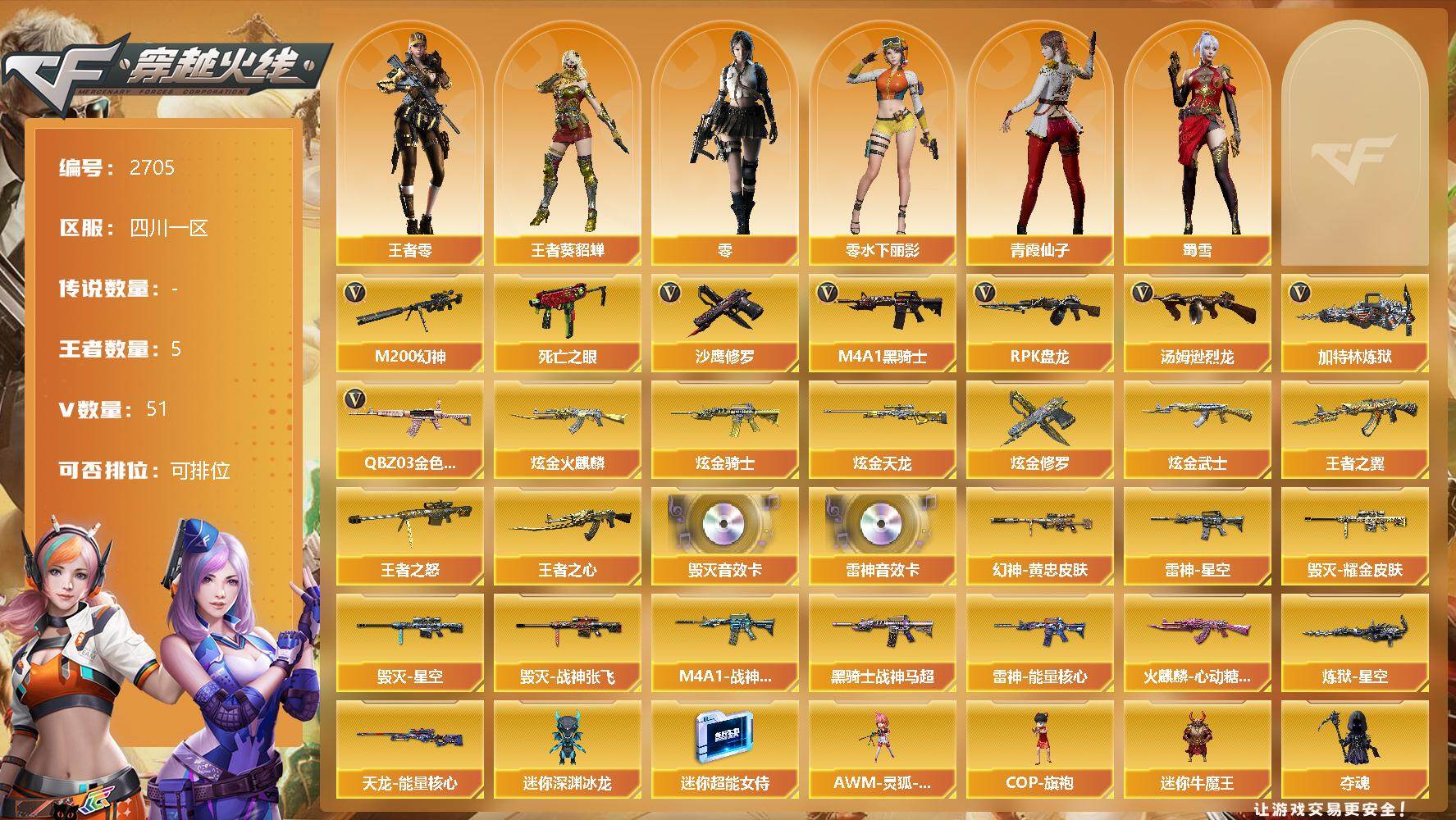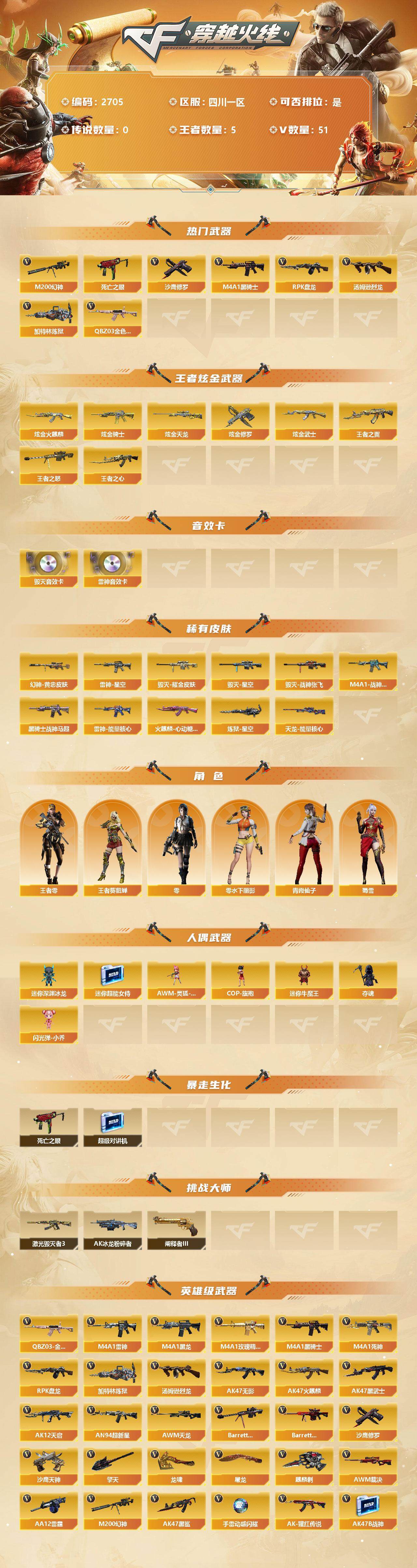 [12523950]【商品标题】:四川一区-51V-5王者-5炫金 【热门武器】:QBZ03-金色蔷薇,M200-幻神,死亡之眼,M4A1-黑骑士,汤姆逊-烈龙*4,RPK-盘龙,加特林-炼狱*2,沙鹰-修罗*2 【王者炫金武器】:炫金火麒麟,炫金骑士,炫金天龙,炫金修罗,炫金武士,王者之翼,王者之怒,王者之心 【音效卡】:M4A1-雷神音效卡,Barrett-毁灭音效卡 【稀有皮肤】:M200-幻神-黄忠皮肤,雷神-能量核心,雷神-星空,M4A1-战神赵云,火麒麟-心动糖果,黑骑士-战神马超,炼狱-星空,毁灭耀金皮肤,毁灭-星空,毁灭-战神张飞,天龙-能量核心 【角色】:王者-葵-貂蝉,王者-零,零-水下丽影,零,蜀雪,青霞仙子 【人偶武器】:AWM-灵狐-15周年嘉年华,COP-旗袍,迷你深渊冰龙,迷你超能女侍,迷你牛魔王,夺魂,闪光弹-小乔 【暴走生化】:死亡之眼,超级对讲机 【挑战大师】:阐释者III,激光毁灭者III,AK47-冰龙粉碎者 【英雄级武器】:手雷-动感闪耀,QBZ03-金色蔷薇,M4A1-雷神,M4A1-黑龙,M4A1-玫瑰精灵,M4A1-黑骑士,M4A1-死神*2,RPK-盘龙,加特林-炼狱*2,汤姆逊-烈龙*4,AK47-无影,AK47-火麒麟*2,AK47-黑武士,AK12-天启,AN94-超新星,AWM-天龙,Barrett-毁灭*2,Barrett-极光*2,AWM-裁决*2,AA-12-雷霆,M200-幻神,AK47-黑鲨,AK-47-猩红传说*3,AK47-B-战神,沙鹰-天神,沙鹰-修罗*2,麒麟刺*2,擎天,龙啸,屠龙*2 【特殊枪械】:1黑骑士,4烈龙,1盘龙,2炼狱
