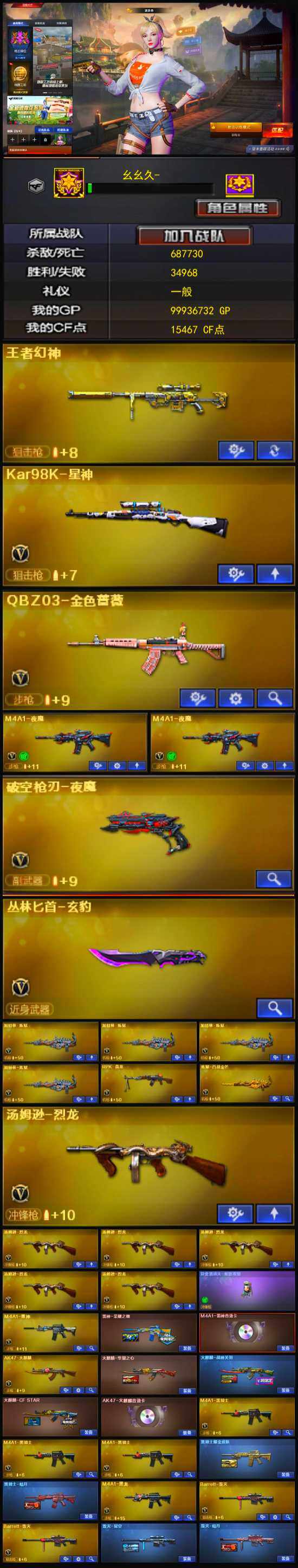 【热门武器】:王者幻神,QBZ03-金色蔷薇,王者炎心,Kar98K-星神,牛牛-AK47,M4A1-黑骑士*3,汤姆逊-烈龙*6,RPK-盘龙,加特林-炼狱*4,沙鹰-修罗*3