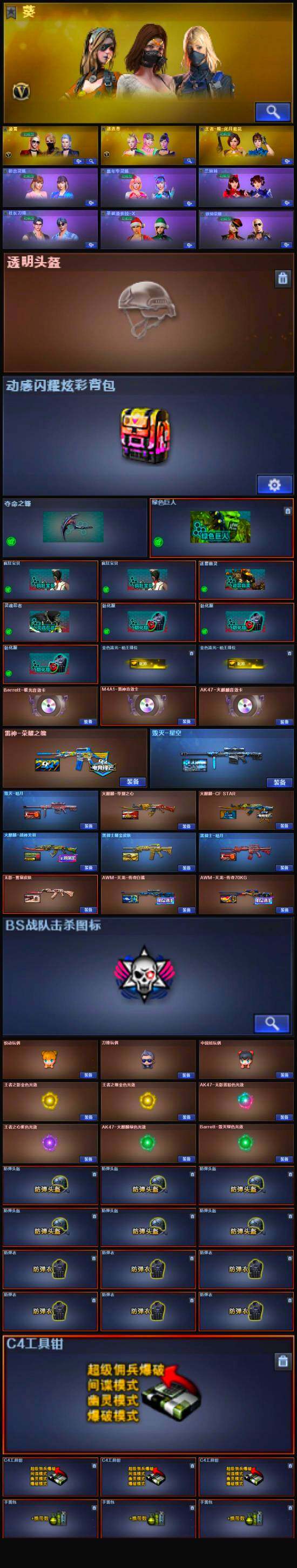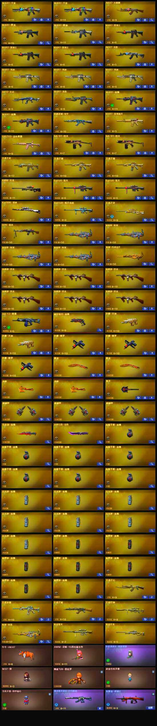 【英雄级武器】:M4A1-夜魔*2,破空枪刃-夜魔,马来剑-夜魔,QBZ03-金色蔷薇,M4A1-雷神,M4A1-黑龙,M4A1-玫瑰精灵,M4A1-黑骑士*3,M4A1-死神*3,RPK-盘龙,加特林-炼狱*4,汤姆逊-烈龙*6,AK47-无影,AK47-火麒麟,AK12-天启,AWM-天龙,Barrett-毁灭*2,M4A1-龙血,AA-12-雷霆,Kar98K-星神,M4A1-千变*2,沙鹰-天神*2,沙鹰-修罗*3,麒麟刺*3,擎天,龙啸*2,屠龙*2