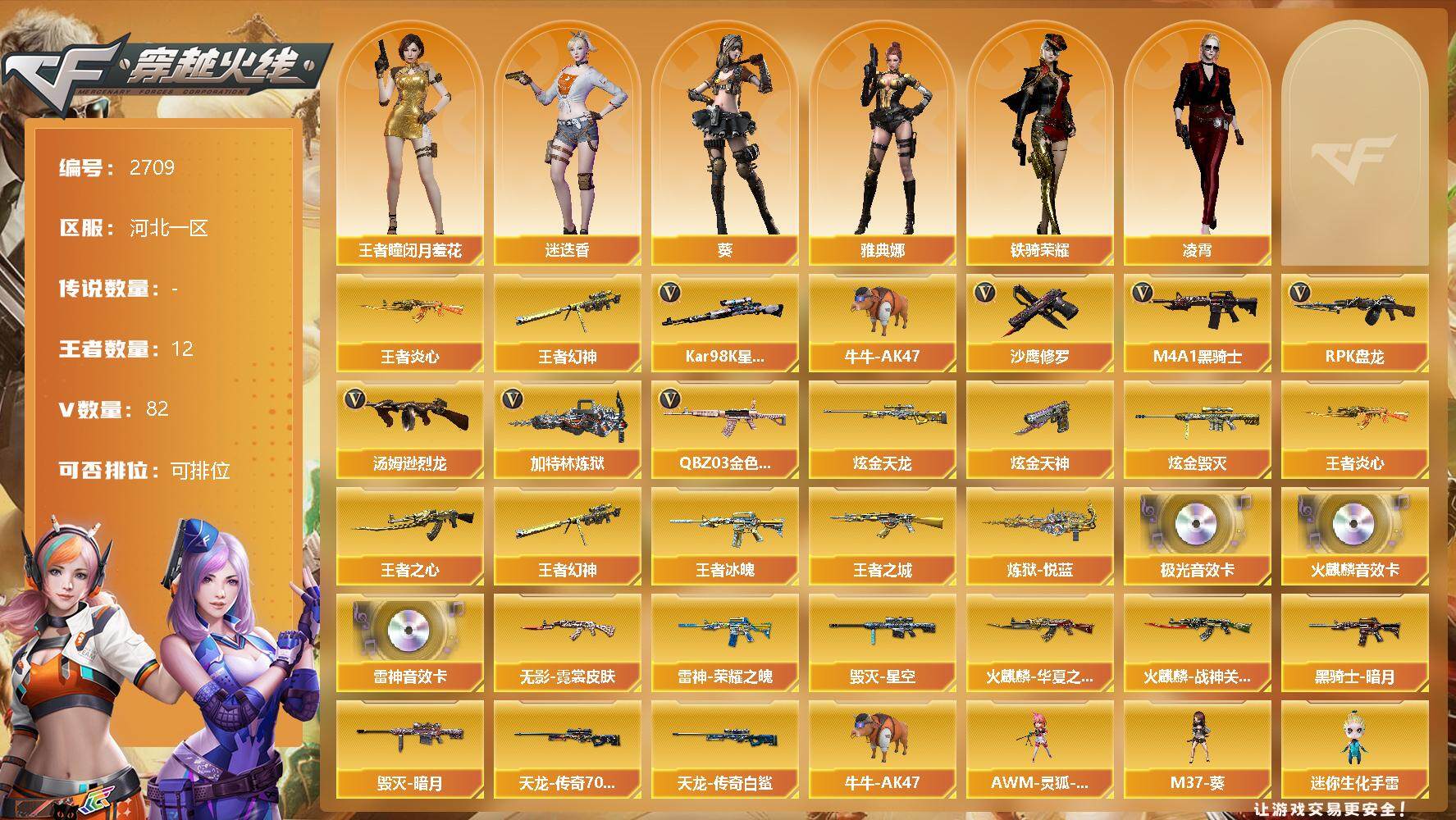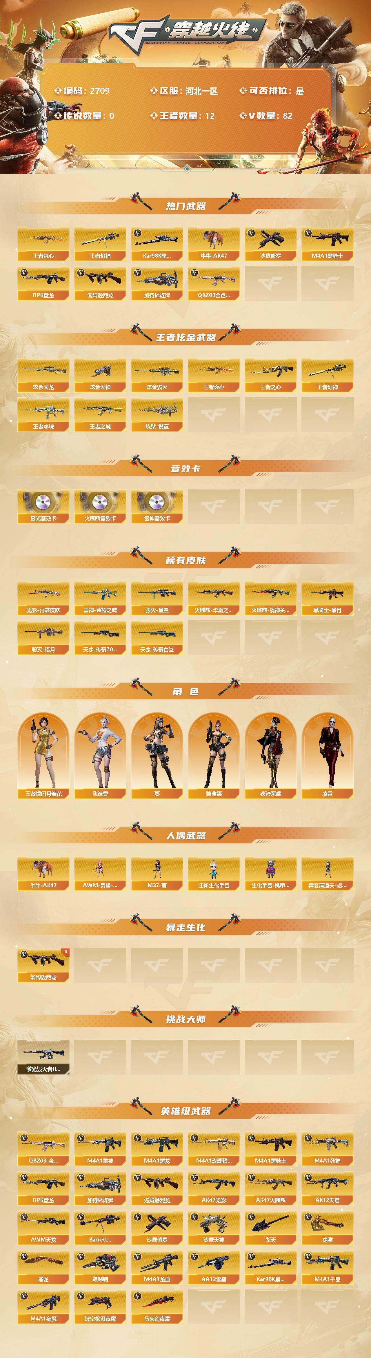 [12524182]【商品标题】:河北一区-82V-12王者-5炫金 【热门武器】:王者幻神,QBZ03-金色蔷薇,王者炎心,Kar98K-星神,牛牛-AK47,M4A1-黑骑士*3,汤姆逊-烈龙*6,RPK-盘龙,加特林-炼狱*4,沙鹰-修罗*3 【王者炫金武器】:炫金天龙,炫金天神*3,炫金毁灭,王者之城,王者冰魄,王者炎心,王者幻神,炼狱-悦蓝,王者之心 【音效卡】:AK47-火麒麟音效卡,M4A1-雷神音效卡,Barrett-极光音效卡 【稀有皮肤】:雷神-荣耀之魄,火麒麟-华夏之心,火麒麟-战神关羽,黑骑士-暗月,毁灭-暗月,毁灭-星空,AWM-天龙-传奇70KG,AWM-天龙-传奇白鲨,无影-霓裳皮肤 【角色】:王者-瞳-闭月羞花,雅典娜,葵,迷迭香,凌霄,铁骑荣耀 【人偶武器】:AWM-灵狐-15周年嘉年华,M37-葵,异变清道夫-蛇影双骄,牛牛-AK47,迷你生化手雷,生化手雷-机甲核心 【挑战大师】:激光毁灭者III-白马银枪 【英雄级武器】:M4A1-夜魔*2,破空枪刃-夜魔,马来剑-夜魔,QBZ03-金色蔷薇,M4A1-雷神,M4A1-黑龙,M4A1-玫瑰精灵,M4A1-黑骑士*3,M4A1-死神*3,RPK-盘龙,加特林-炼狱*4,汤姆逊-烈龙*6,AK47-无影,AK47-火麒麟,AK12-天启,AWM-天龙,Barrett-毁灭*2,M4A1-龙血,AA-12-雷霆,Kar98K-星神,M4A1-千变*2,沙鹰-天神*2,沙鹰-修罗*3,麒麟刺*3,擎天,龙啸*2,屠龙*2 【特殊枪械】:3黑骑士,6烈龙,1盘龙,4炼狱