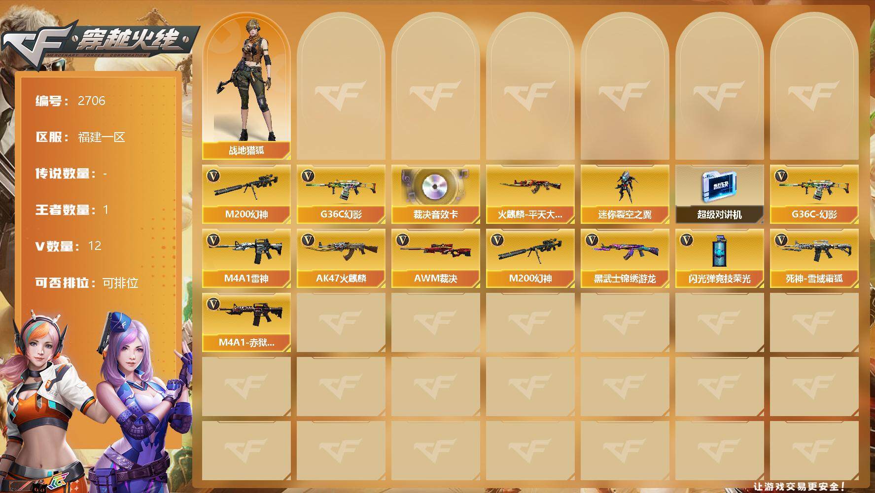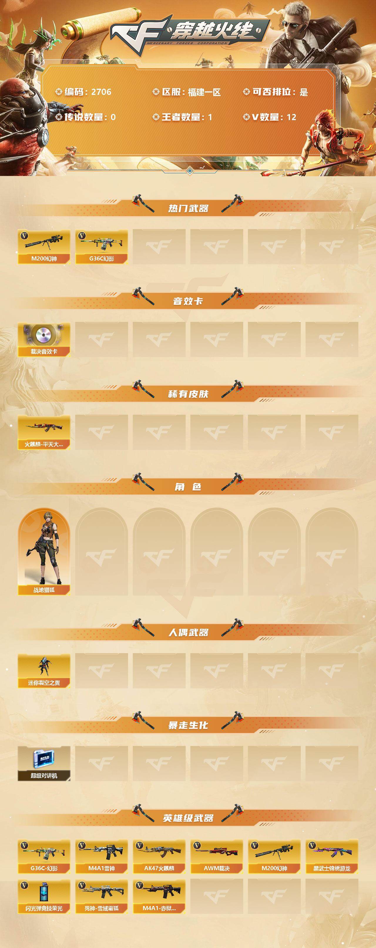 [12524155]【商品标题】:福建一区-12V-1王者-0炫金 【热门武器】:G36C-幻影,M200-幻神 【音效卡】:AWM-裁决音效卡 【稀有皮肤】:火麒麟-平天大圣 【角色】:战地猎狐 【人偶武器】:迷你裂空之翼 【暴走生化】:超级对讲机 【英雄级武器】:闪光弹-竞技荣光,G36C-幻影,M4A1-雷神*2,AK47-火麒麟,AWM-裁决,M200-幻神,黑武士-锦绣游龙,死神-雪域霜狐,M4A1-赤狱骑士 【特殊枪械】: