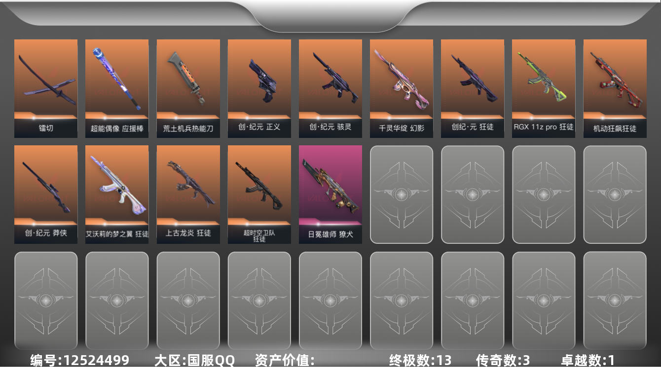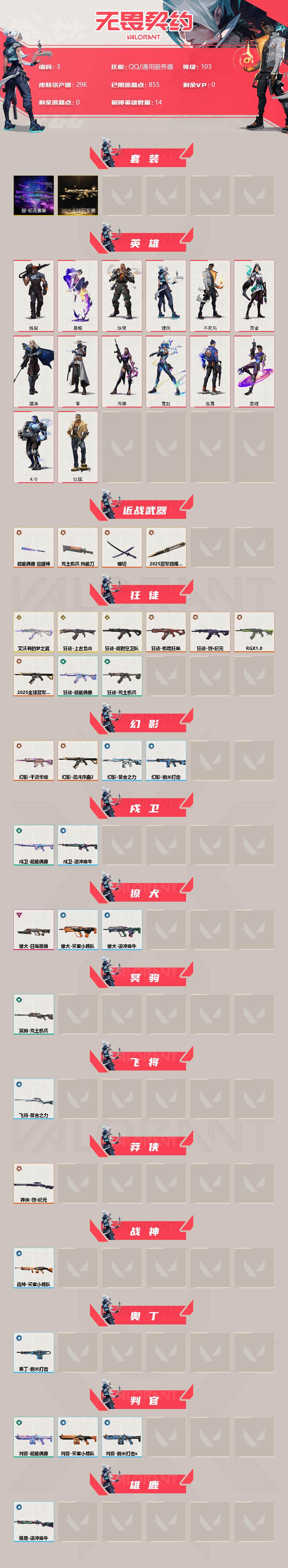 [12524499]【套装】:2025全球冠军赛套装,创·纪元套装 【英雄】:炼狱,暮蝶,钛狐,铁臂,捷风,不死鸟,贤者,猎枭,零,芮娜,霓虹,夜露,星礈,K/O 【近战 武器】:近战武器-2025全球冠军赛 蝴蝶刀,近战武器-镭切,近战武器-超能偶像 应援棒,近战武器-荒土机兵 热能刀 【狂徒】:狂徒-艾沃莉的梦之翼,狂徒-上古龙炎,狂徒-超时空卫队,狂徒-2025全球冠军赛,狂徒-机动狂飙,狂徒-创·纪元,狂徒-RGX 11z Pro,狂徒-超能偶像,狂徒-荒土机兵 【幻影】:幻影-千灵华绽,幻影-混沌序曲//2.0,幻影-聚合之力,幻影-纳米打击 【戍卫】:戍卫-超能偶像,戍卫-逆冲蛮牛 【獠犬】:獠犬-日冕雄师,獠犬-采蜜小蜂队,獠犬-逆冲蛮牛 【冥驹】:冥驹-荒土机兵 【飞将】:飞将-聚合之力 【莽侠】:莽侠-创·纪元 【战神】:战神-采蜜小蜂队 【奥丁】:奥丁-纳米打击 【判官】:判官-超能偶像,判官-采蜜小蜂队,判官-纳米打击x 【雄鹿】:雄鹿-逆冲蛮牛 【骇灵】:骇灵-创·纪元,骇灵-荒土机兵 【蜂刺】:蜂刺-聚合之力 【标配】:标配-超能偶像,标配-荒土机兵 【正义】:正义-创·纪元,正义-纳米打击 【鬼魅】:鬼魅-流星兵团,鬼魅-采蜜小蜂队 【狂怒】:狂怒-聚合之力,狂怒-逆冲蛮牛 【卡面】:终章:激斗汉堡 卡面,进入射程 卡面,分崩离析 卡面,纳米打击 卡面,抑制技术 卡面,激斗汉堡 卡面,瓦娃脸雪糕 P2 卡面,从黄昏到黎明 卡面,荒土机兵 卡面,银弹猎手 卡面,逆冲蛮牛 卡面,《双城之战》拥抱 卡面,精灵大战 卡面,欢迎来到底城 卡面,南瓜盛典 卡面,正义的化身 卡面,终章:生意人麦宝 卡面,铁之华 卡面,失而复得 卡面,时间到 卡面,最高舞台 卡面,复活专家 卡面,归乡 // 蝰蛇 卡面,超能偶像 卡面,生意人麦宝 卡面,音熊登场 卡面,声感陷阱设计图 卡面,钢锁工牌 卡面,战术小伙伴的夏日 卡面,采蜜小蜂队 卡面,聚合之力 卡面,梦幻奶茶 卡面,趁热吃 卡面,源能反应 卡面,零点嗅探设计图 卡面,无畏契约GO!第一卷:零 卡面,代号红色 卡面,新兵报到 卡面,V契约 卡面,无畏契约 卡面 【喷漆】:小小心意 喷漆,战“素”兔 喷漆,宇宙的指引 喷漆,请求重启 喷漆,逆冲蛮牛 喷漆,纳米打击 喷漆,鼻尖上的蝴蝶 喷漆,简笔画黯兽 喷漆,独守蝰腹 喷漆,他们