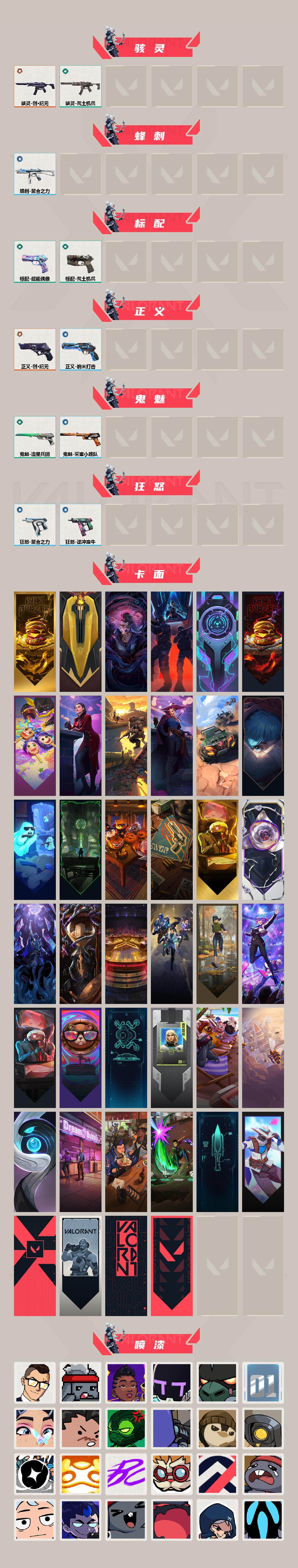 - [12957881]【英雄】:炼狱,捷风,不死鸟,贤者,猎枭 【幻影】:幻影-般若假面 【卡面】:红鳞松叶 卡面,代号红色 卡面,新兵报到 卡面,V契约 卡面,无畏契约 卡面 【喷漆】:胜利属于无畏契约 喷漆,GLHF 喷漆,无畏契约 喷漆 【挂饰】:红鳞松叶 挂饰,无畏契约 纪念币 挂饰