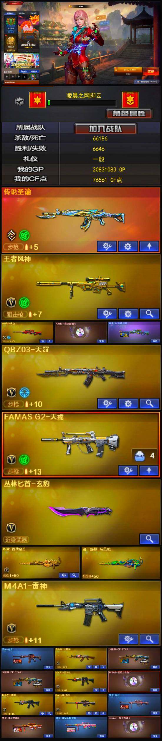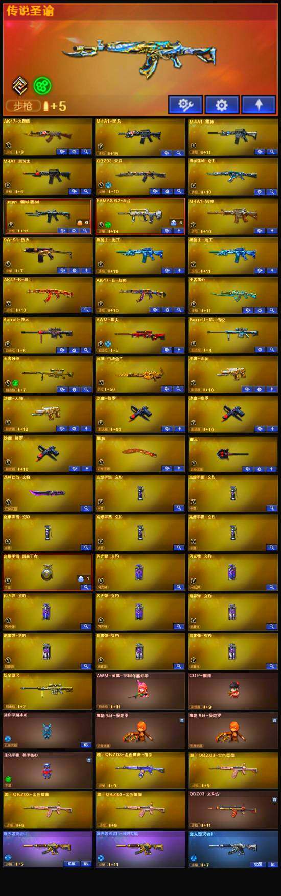 【英雄级武器】:FAMAS G2-天戎,M4A1-雷神,M4A1-黑龙,M4A1-黑骑士,AK47-火麒麟,Barrett-毁灭,AWM-裁决,QBZ03-天罚,M4A1-猎神,黑骑士-海王*2,死神-雪域霜狐,AK-47-猩红传说,AK47-B-战神,沙鹰-天神*2,沙鹰-修罗*3,擎天,屠龙