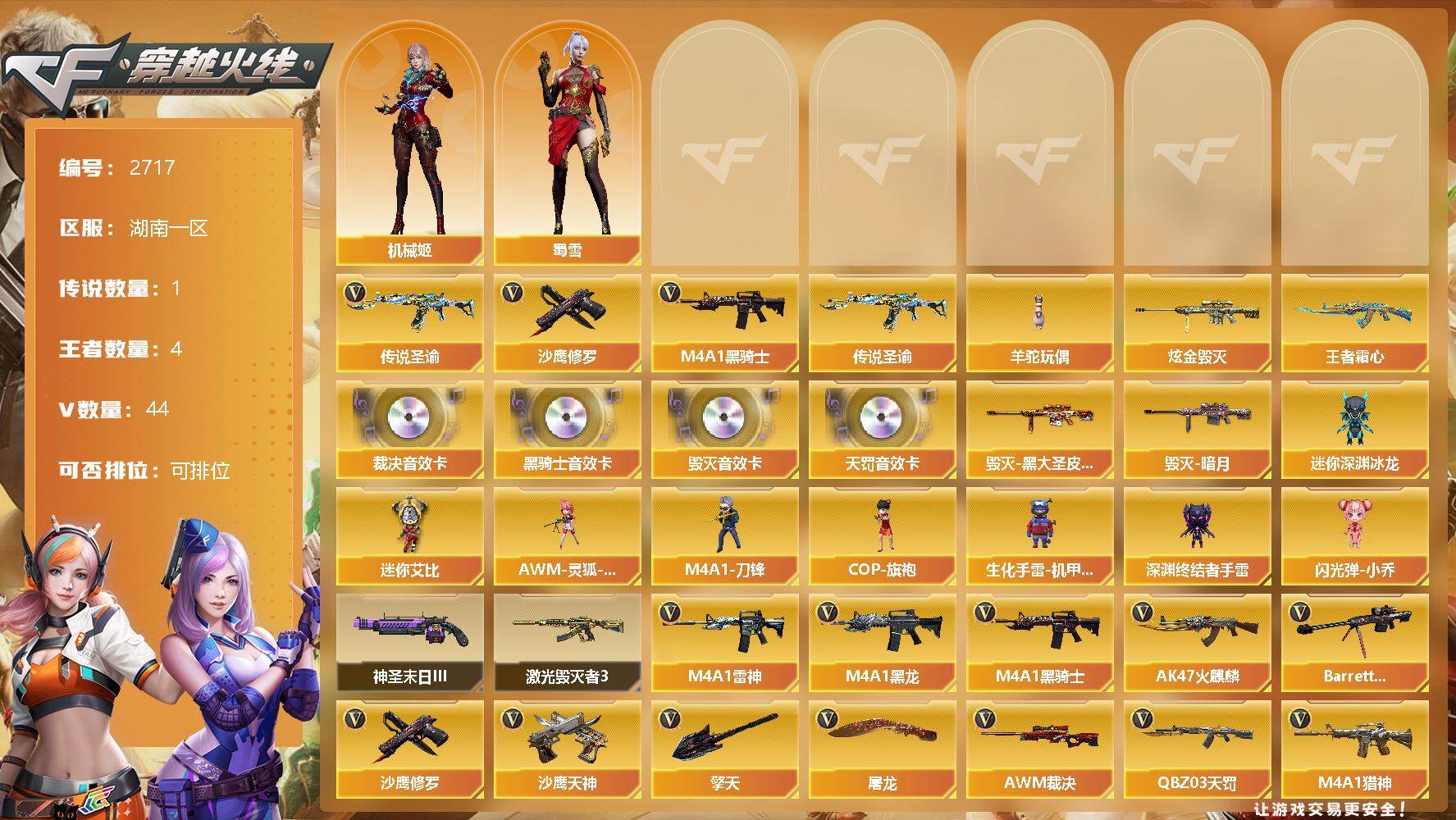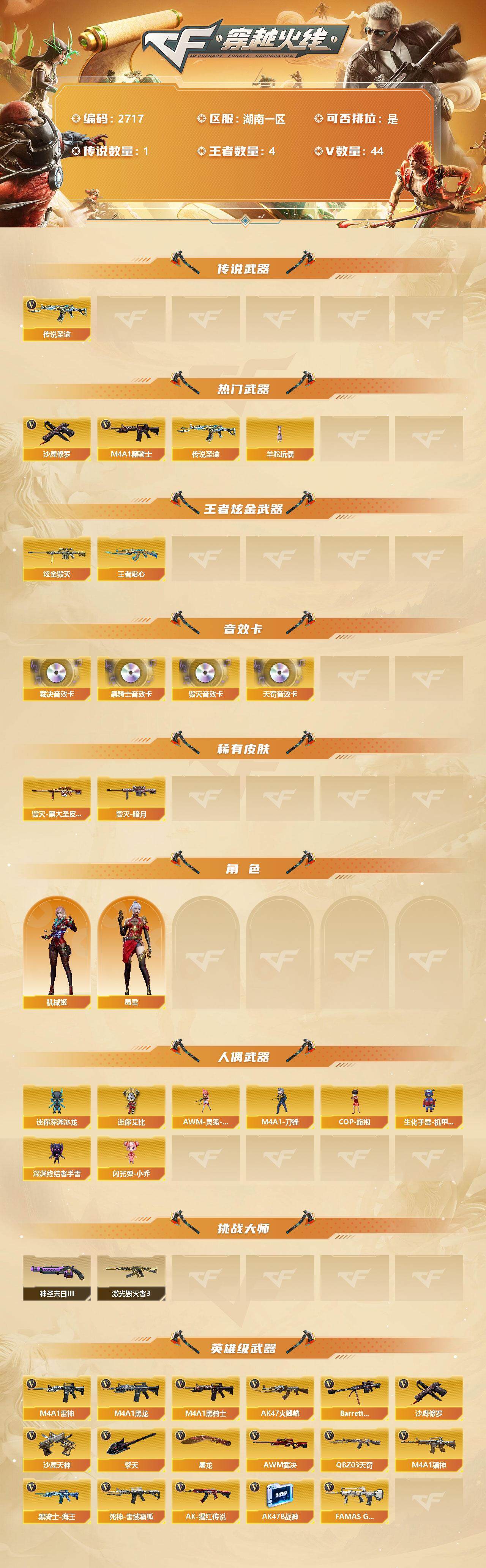 [12524375]【商品标题】:湖南一区-44V-4王者-1炫金 【传说武器】:传说圣谕 【热门武器】:传说圣谕,M4A1-黑骑士,羊驼玩偶,沙鹰-修罗*3 【王者炫金武器】:炫金毁灭,王者霜心 【音效卡】:M4A1-黑骑士音效卡,Barrett-毁灭音效卡,AWM-裁决音效卡,QBZ03-天罚音效卡 【稀有皮肤】:毁灭-暗月,毁灭-黑大圣皮肤 【角色】:机械姬,蜀雪 【人偶武器】:AWM-灵狐-15周年嘉年华,M4A1-刀锋,COP-旗袍,迷你深渊冰龙,迷你艾比,生化手雷-机甲核心,深渊终结者手雷,闪光弹-小乔 【挑战大师】:神圣爆裂者-末日III,激光毁灭者III 【英雄级武器】:FAMAS G2-天戎,M4A1-雷神,M4A1-黑龙,M4A1-黑骑士,AK47-火麒麟,Barrett-毁灭,AWM-裁决,QBZ03-天罚,M4A1-猎神,黑骑士-海王*2,死神-雪域霜狐,AK-47-猩红传说,AK47-B-战神,沙鹰-天神*2,沙鹰-修罗*3,擎天,屠龙 【特殊枪械】:1黑骑士