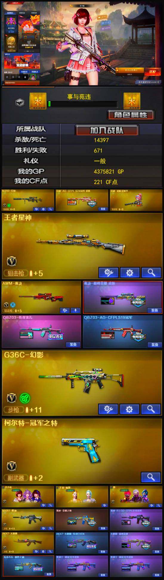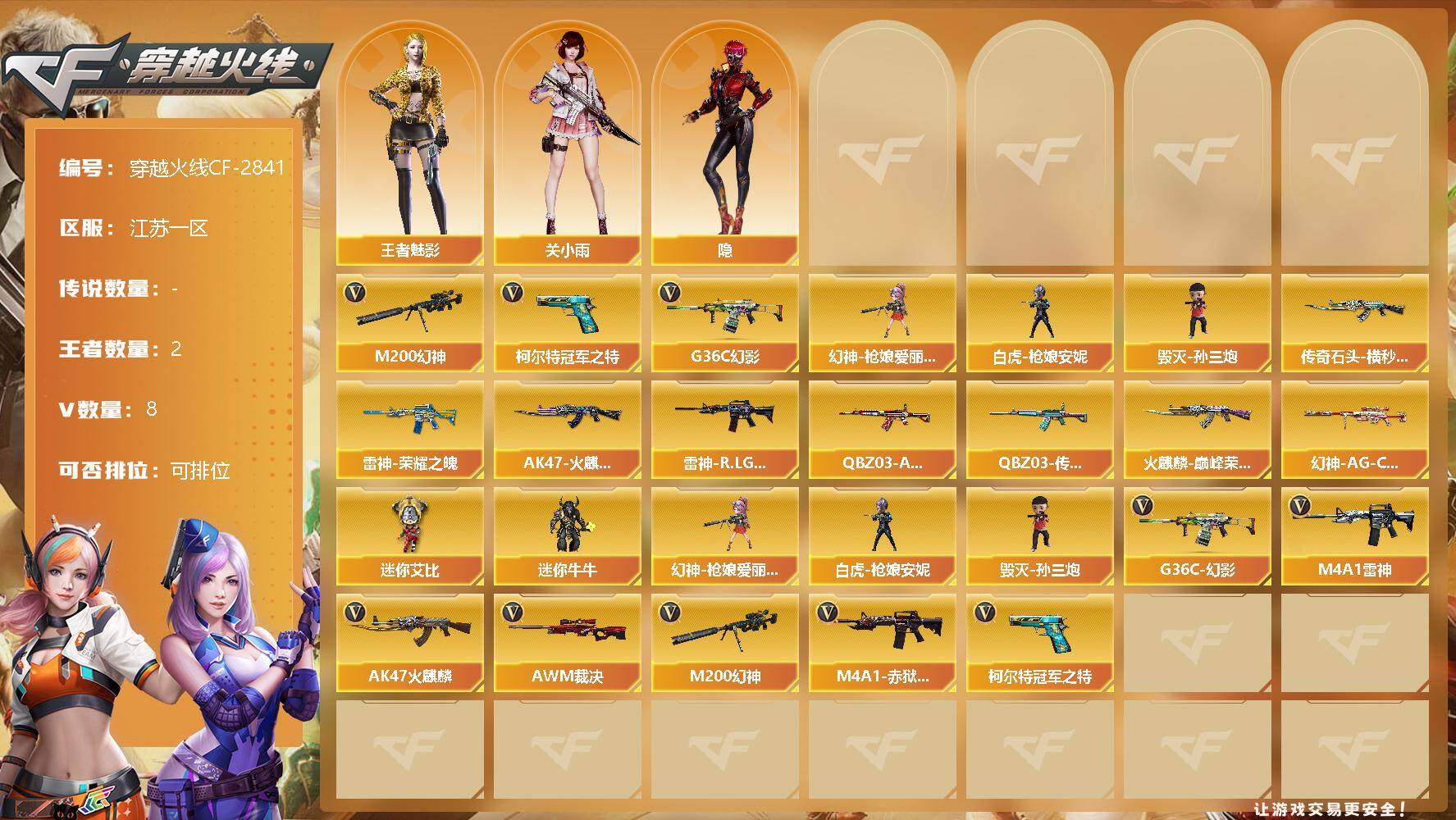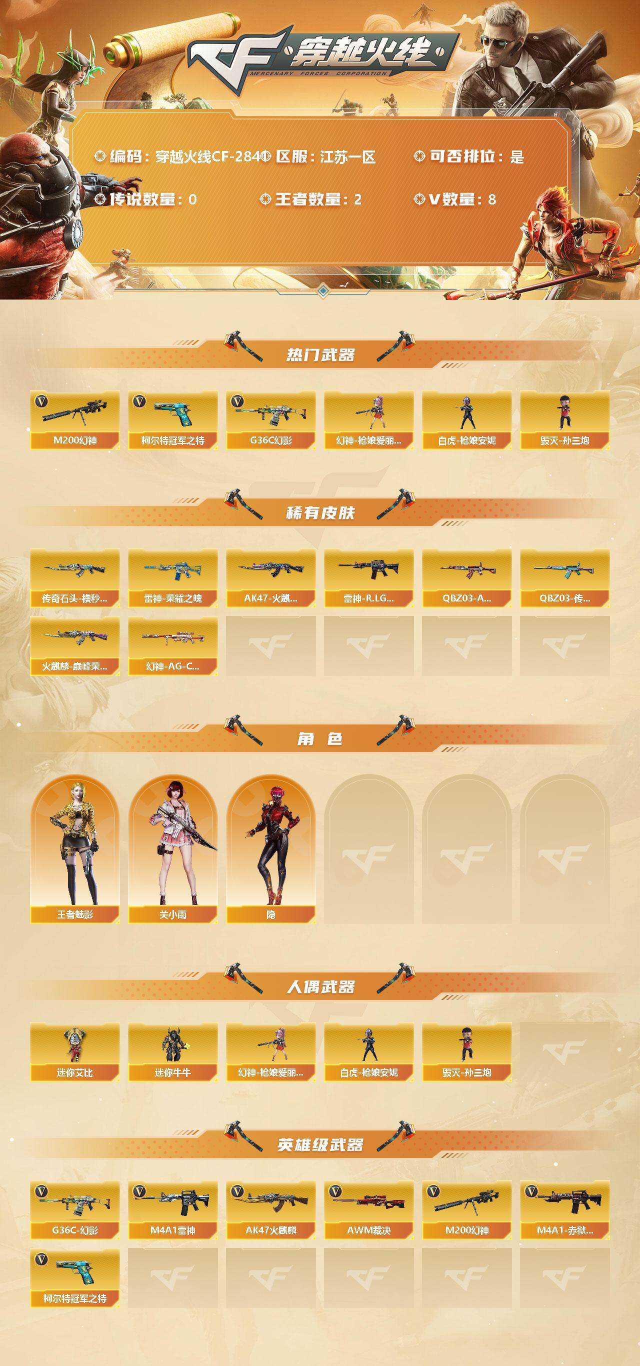 [12524640]【商品标题】:江苏一区-8V-2王者-0炫金 【热门武器】:G36C-幻影,M200-幻神,柯尔特-冠军之特,幻神-枪娘爱丽丝,白虎-枪娘安妮,毁灭-孙三炮 【稀有皮肤】:幻神-AG-CFPL S24冠军 皮肤,QBZ03-传奇宠儿,QBZ03-AG-CFPLS19冠军,雷神-荣耀之魄,雷神-R.LGD-CFPLS18冠军,AK47-火麒麟-传奇EVEN,传奇石头-横秒之巅,火麒麟-巅峰荣耀 【角色】:王者-魅影,关小雨,隐 【人偶武器】:幻神-枪娘爱丽丝,白虎-枪娘安妮,毁灭-孙三炮,迷你艾比,迷你牛牛 【英雄级武器】:G36C-幻影,M4A1-雷神,AK47-火麒麟,AWM-裁决,M200-幻神,M4A1-赤狱骑士,柯尔特-冠军之特 【特殊枪械】: