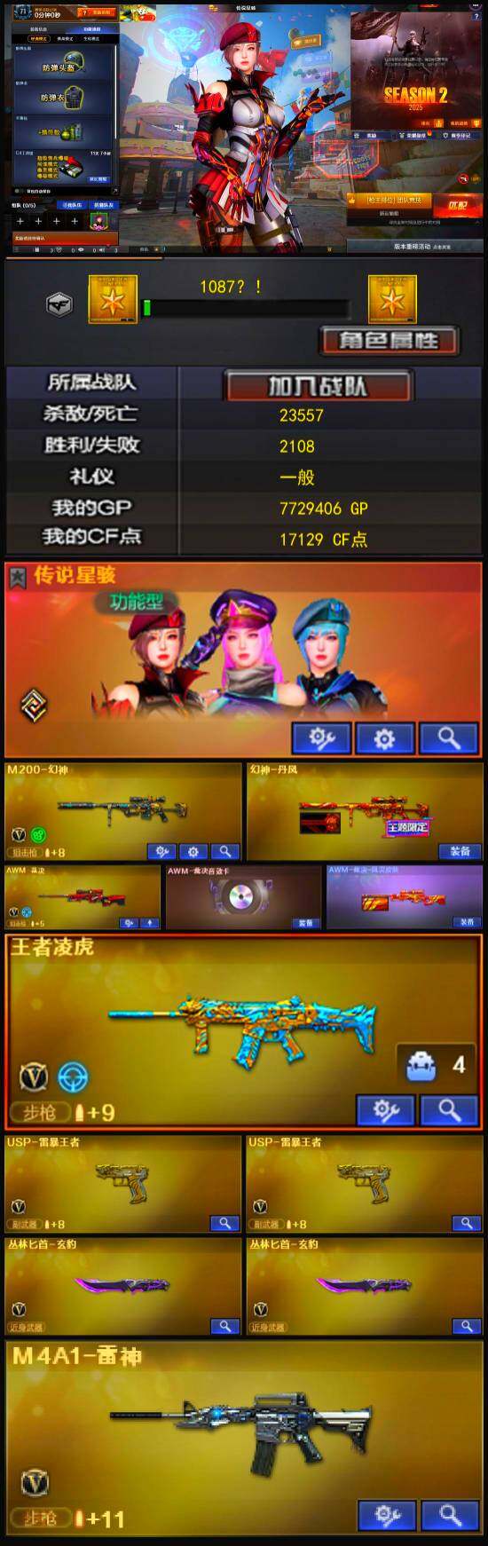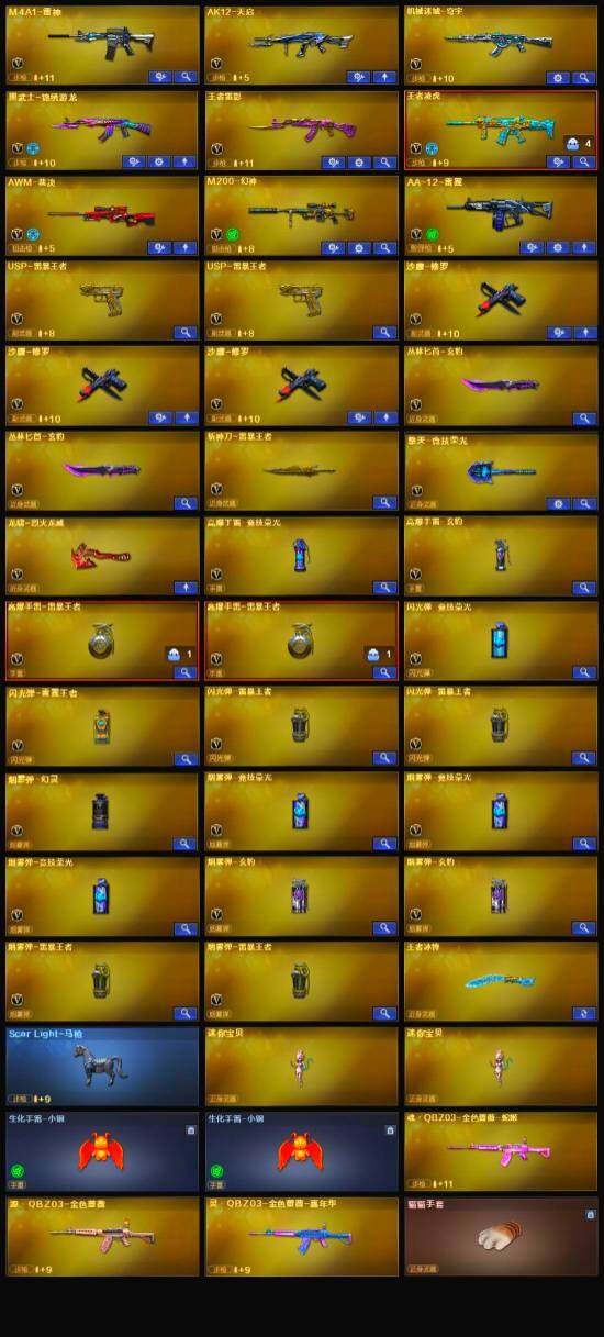 【英雄级武器】:擎天-竞技荣光,高爆手雷-竞技荣光,烟雾弹-竞技荣光*3,闪光弹-竞技荣光,M4A1-雷神,AK12-天启,AWM-裁决,AA-12-雷霆,M200-幻神,黑武士-锦绣游龙,沙鹰-修罗*3