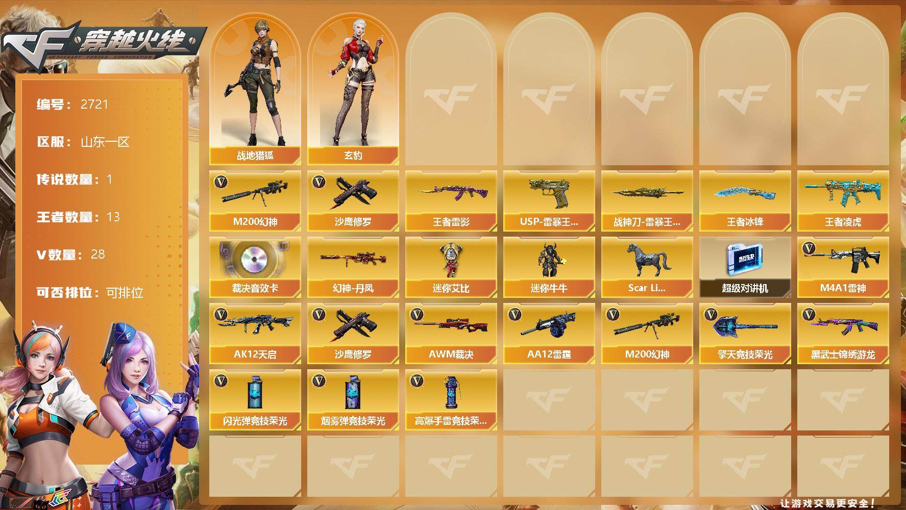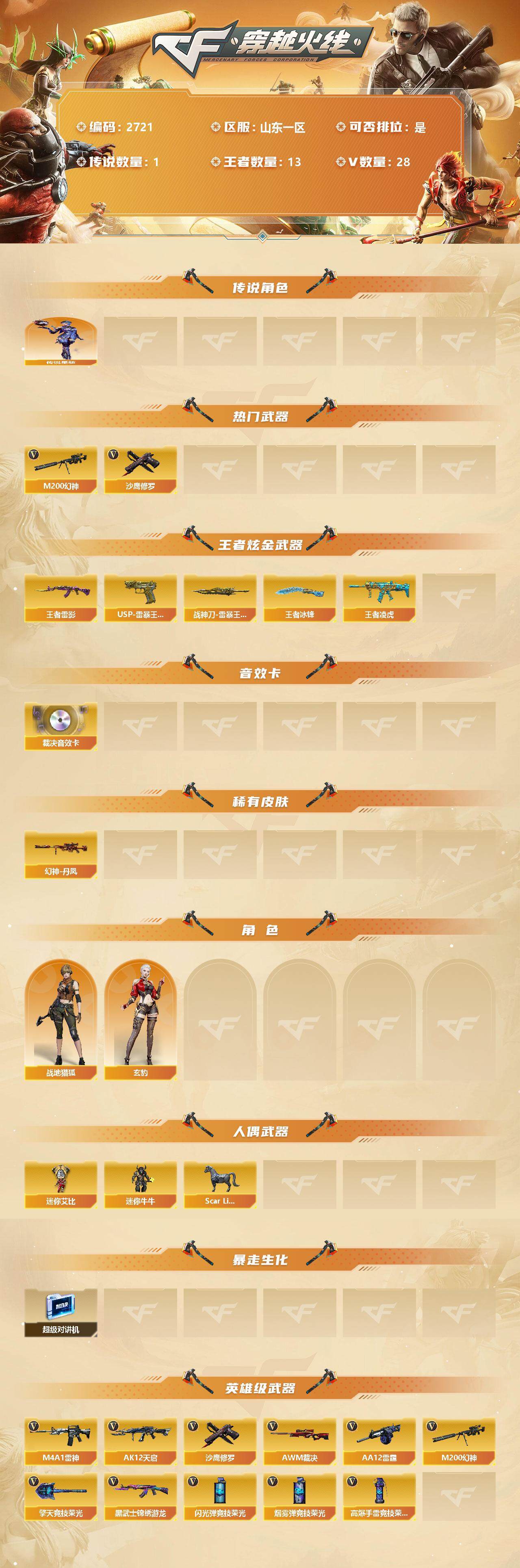 [12524812]【商品标题】:山东一区-28V-13王者-0炫金 【传说角色】:传说星骇 【热门武器】:M200-幻神,沙鹰-修罗*3 【王者炫金武器】:王者雷影,王者凌虎,USP-雷暴王者*2,斩神刀-雷暴王者,王者冰锋 【音效卡】:AWM-裁决音效卡 【稀有皮肤】:幻神-丹凤 【角色】:战地猎狐,玄豹 【人偶武器】:Scar Light-马枪,迷你艾比,迷你牛牛 【暴走生化】:超级对讲机 【英雄级武器】:擎天-竞技荣光,高爆手雷-竞技荣光,烟雾弹-竞技荣光*3,闪光弹-竞技荣光,M4A1-雷神,AK12-天启,AWM-裁决,AA-12-雷霆,M200-幻神,黑武士-锦绣游龙,沙鹰-修罗*3 【特殊枪械】: