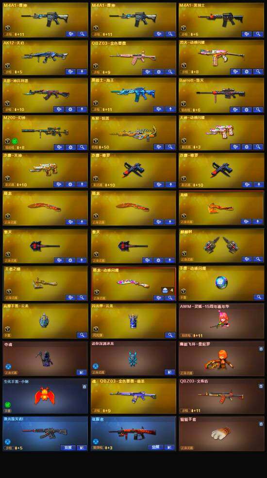 【英雄级武器】:烈火-动感闪耀,天神-动感闪耀,屠龙-动感闪耀,手雷-动感闪耀,QBZ03-金色蔷薇,无影-神兵利器,M4A1-雷神*2,M4A1-黑骑士,AK12-天启,Barrett-毁灭,M200-幻神,黑骑士-海王,AWM-昌龙,M4A1-赤狱骑士,沙鹰-天神,沙鹰-修罗*2,麒麟刺,擎天*2,龙啸,屠龙*2