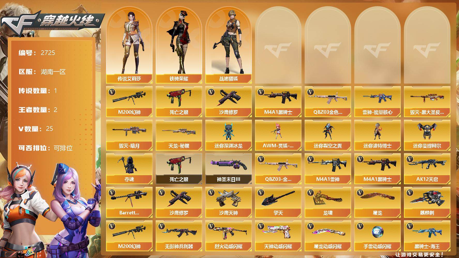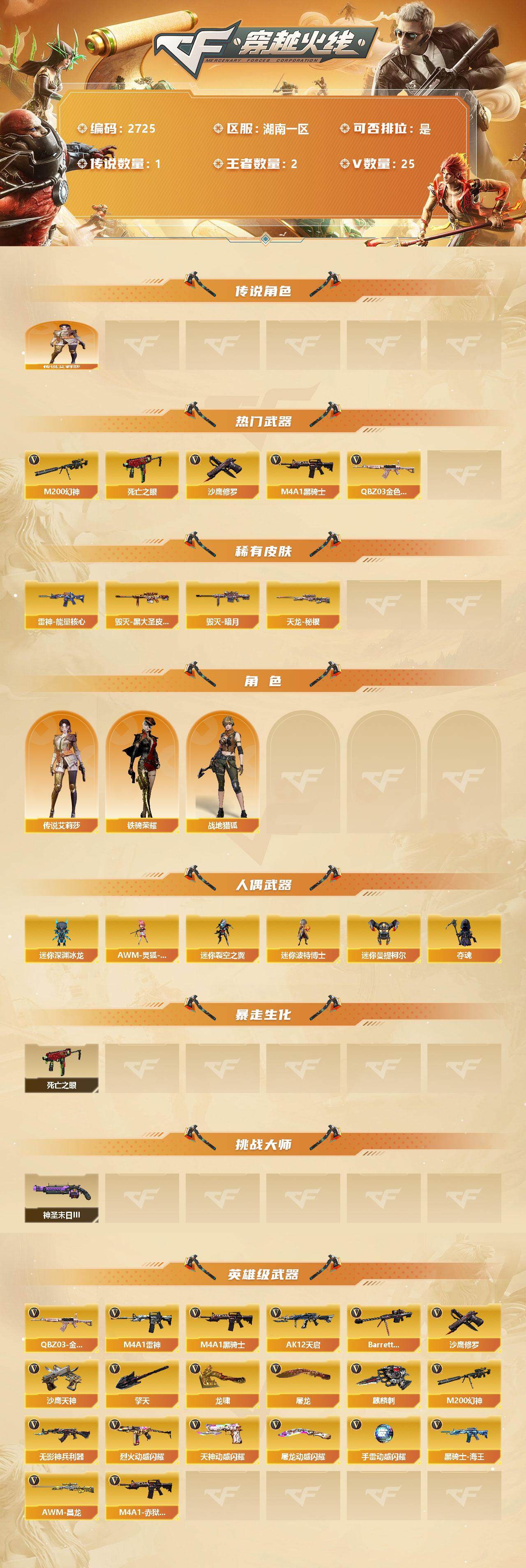 [12524991]【商品标题】:湖南一区-25V-2王者-0炫金 【传说角色】:传说艾莉莎 【热门武器】:QBZ03-金色蔷薇,M200-幻神,死亡之眼,M4A1-黑骑士,沙鹰-修罗*2 【稀有皮肤】:雷神-能量核心,毁灭-暗月*2,毁灭-黑大圣皮肤,天龙-秘银 【角色】:传说艾莉莎,战地猎狐,铁骑荣耀 【人偶武器】:AWM-灵狐-15周年嘉年华,迷你深渊冰龙,迷你裂空之翼,迷你波特博士,迷你曼提柯尔,夺魂 【暴走生化】:死亡之眼 【挑战大师】:神圣爆裂者-末日III 【英雄级武器】:烈火-动感闪耀,天神-动感闪耀,屠龙-动感闪耀,手雷-动感闪耀,QBZ03-金色蔷薇,无影-神兵利器,M4A1-雷神*2,M4A1-黑骑士,AK12-天启,Barrett-毁灭,M200-幻神,黑骑士-海王,AWM-昌龙,M4A1-赤狱骑士,沙鹰-天神,沙鹰-修罗*2,麒麟刺,擎天*2,龙啸,屠龙*2 【特殊枪械】:1黑骑士