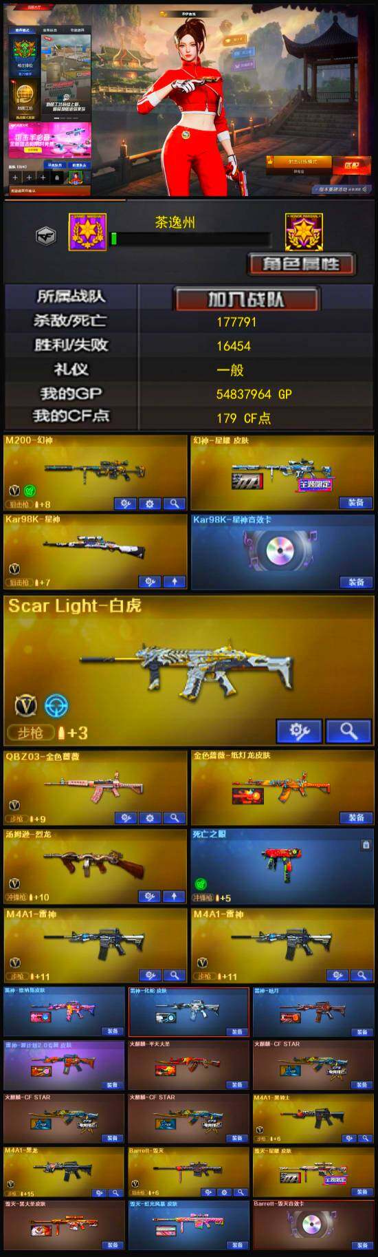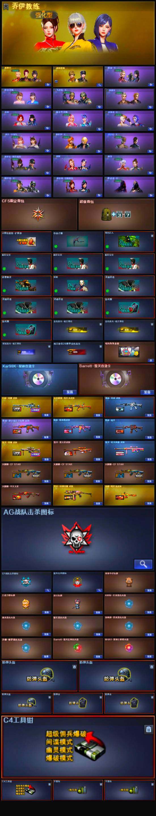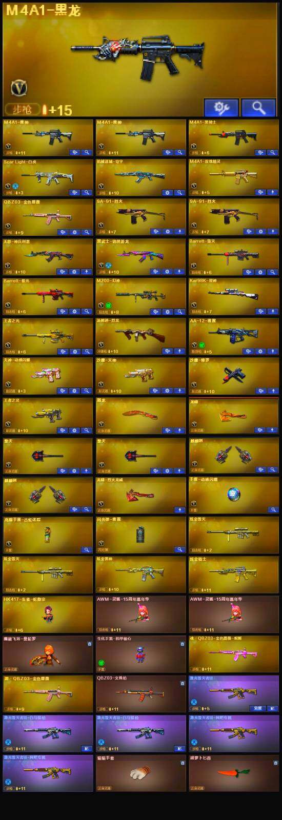【英雄级武器】:天神-动感闪耀,手雷-动感闪耀,QBZ03-金色蔷薇,Scar Light-白虎,无影-神兵利器,M4A1-雷神*2,M4A1-黑龙,M4A1-玫瑰精灵,M4A1-黑骑士,汤姆逊-烈龙,Barrett-毁灭,Barrett-极光,AA-12-雷霆,Kar98K-星神,M200-幻神,黑武士-锦绣游龙,AK-47-猩红传说*2,M4A1-赤狱骑士,沙鹰-天神,沙鹰-修罗,麒麟刺*2,擎天*2,龙啸,屠龙