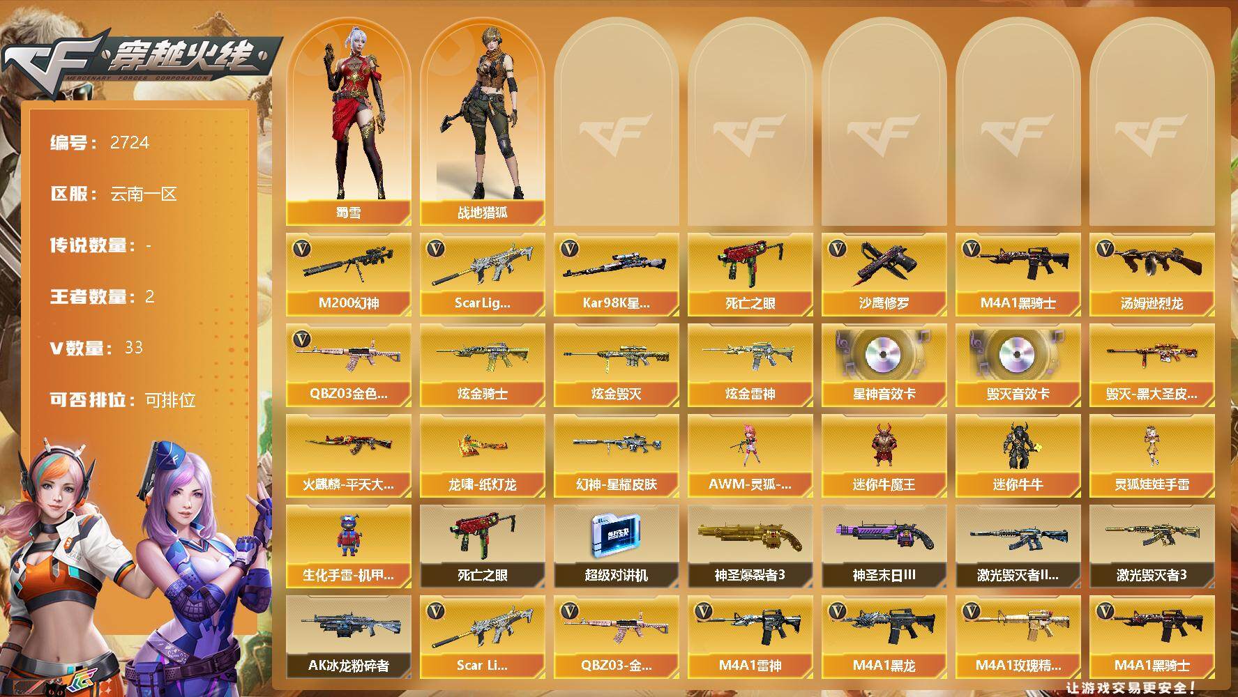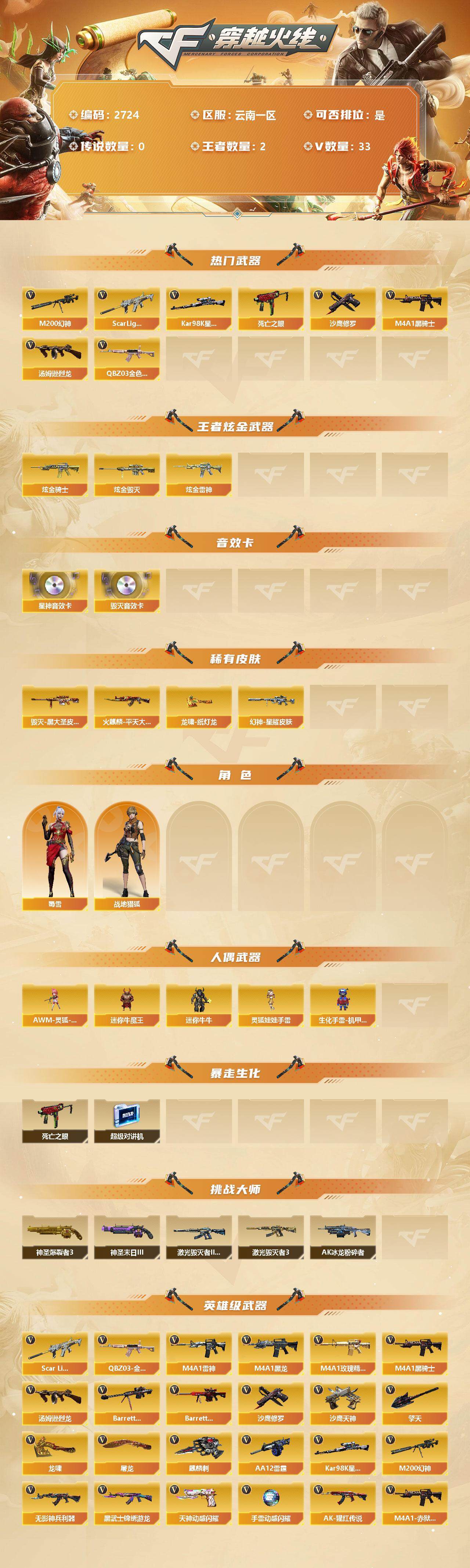 [12524915]【商品标题】:云南一区-33V-2王者-4炫金 【热门武器】:QBZ03-金色蔷薇,Scar Light-白虎,M200-幻神,死亡之眼,Kar98K-星神,M4A1-黑骑士,汤姆逊-烈龙,沙鹰-修罗 【王者炫金武器】:炫金骑士,炫金毁灭*2,炫金雷神 【音效卡】:Barrett-毁灭音效卡,Kar98K-星神音效卡 【稀有皮肤】:幻神-星耀 皮肤,火麒麟-平天大圣,毁灭-黑大圣皮肤,龙啸-纸灯龙皮肤 【角色】:战地猎狐,蜀雪 【人偶武器】:AWM-灵狐-15周年嘉年华*2,迷你牛魔王,迷你牛牛*2,灵狐娃娃手雷,生化手雷-机甲核心 【暴走生化】:死亡之眼,超级对讲机 【挑战大师】:神圣爆裂者III,神圣爆裂者-末日III,激光毁灭者III,激光毁灭者III-白马银枪*2,AK47-冰龙粉碎者 【英雄级武器】:天神-动感闪耀,手雷-动感闪耀,QBZ03-金色蔷薇,Scar Light-白虎,无影-神兵利器,M4A1-雷神*2,M4A1-黑龙,M4A1-玫瑰精灵,M4A1-黑骑士,汤姆逊-烈龙,Barrett-毁灭,Barrett-极光,AA-12-雷霆,Kar98K-星神,M200-幻神,黑武士-锦绣游龙,AK-47-猩红传说*2,M4A1-赤狱骑士,沙鹰-天神,沙鹰-修罗,麒麟刺*2,擎天*2,龙啸,屠龙 【特殊枪械】:1白虎,1黑骑士,1烈龙