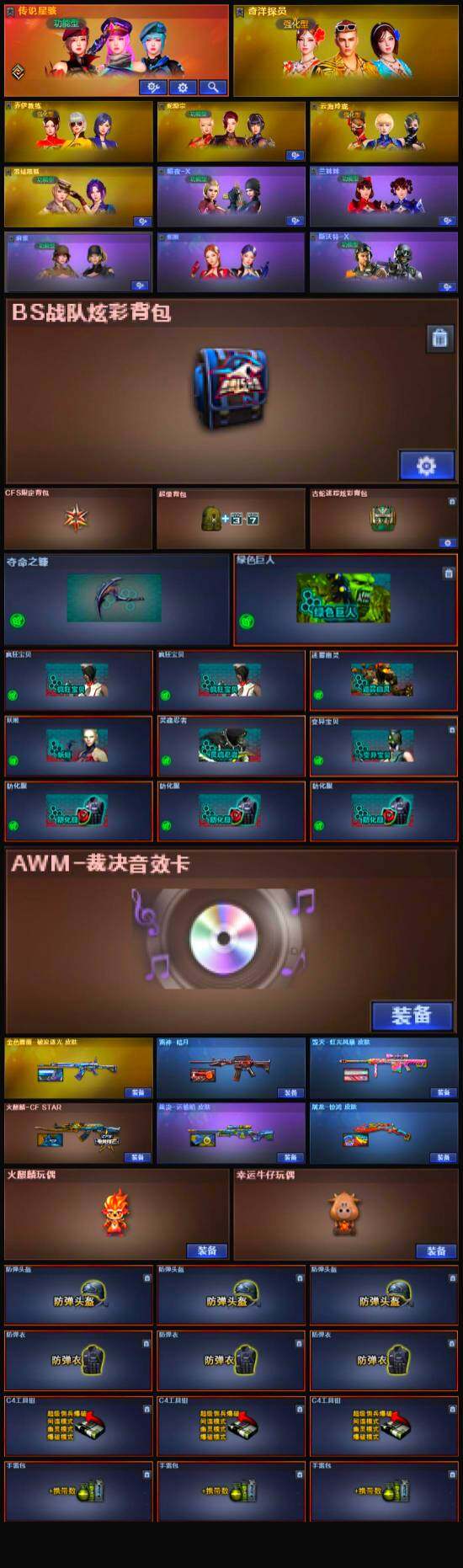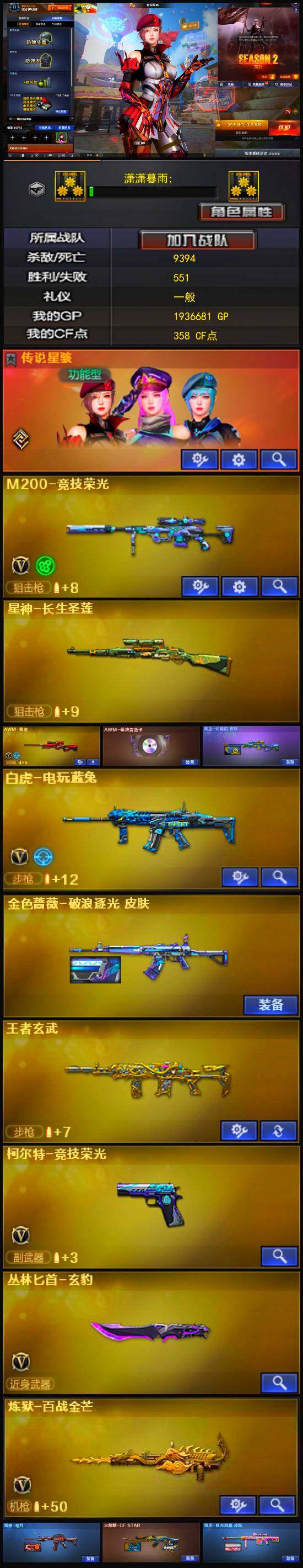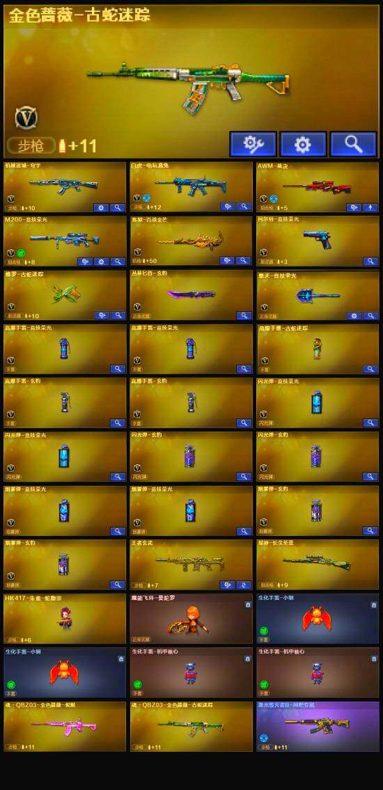 【英雄级武器】:M200-竞技荣光,柯尔特-竞技荣光,擎天-竞技荣光,高爆手雷-竞技荣光*2,烟雾弹-竞技荣光*2,闪光弹-竞技荣光*2,金色蔷薇-古蛇迷踪,白虎-电玩蓝兔,AWM-裁决,修罗-古蛇迷踪