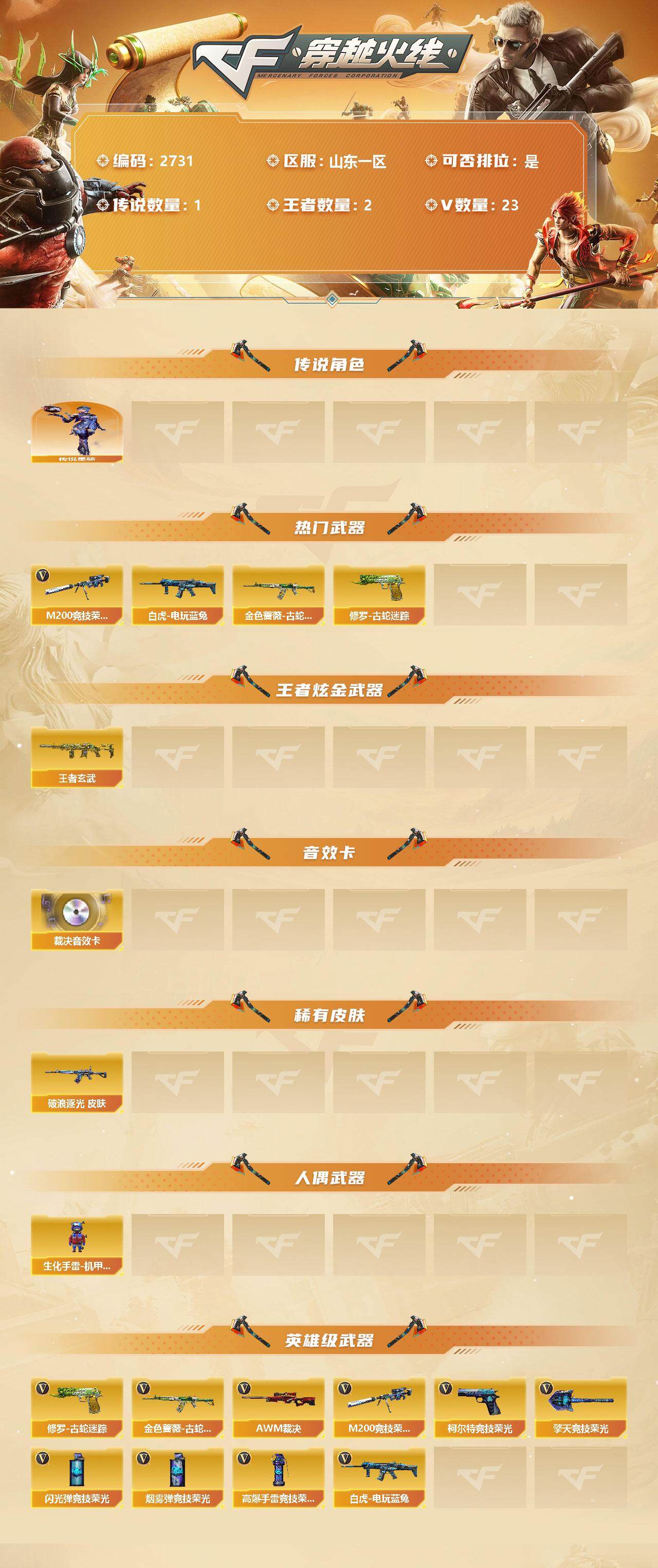 [12525179]【商品标题】:山东一区-23V-2王者-0炫金 【传说角色】:传说星骇 【热门武器】:金色蔷薇-古蛇迷踪,修罗-古蛇迷踪,M200-竞技荣光,白虎-电玩蓝兔 【王者炫金武器】:王者玄武 【音效卡】:AWM-裁决音效卡 【稀有皮肤】:金色蔷薇-破浪逐光 皮肤 【人偶武器】:生化手雷-机甲核心*2 【英雄级武器】:M200-竞技荣光,柯尔特-竞技荣光,擎天-竞技荣光,高爆手雷-竞技荣光*2,烟雾弹-竞技荣光*2,闪光弹-竞技荣光*2,金色蔷薇-古蛇迷踪,白虎-电玩蓝兔,AWM-裁决,修罗-古蛇迷踪 【特殊枪械】: