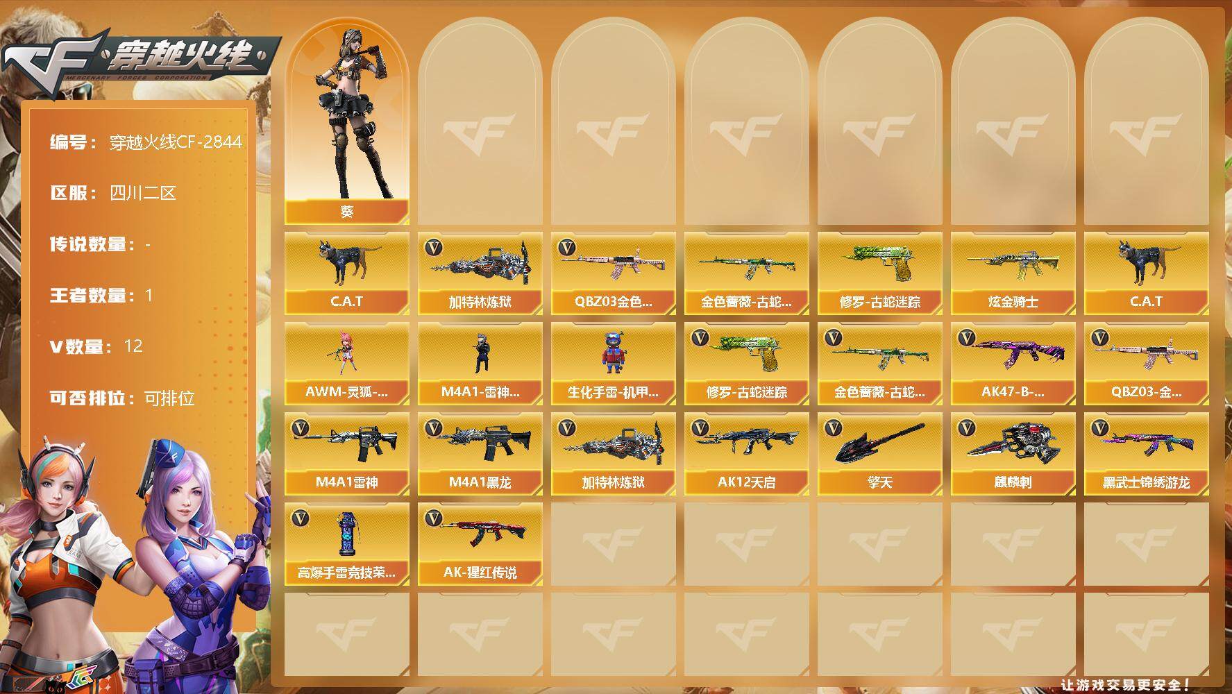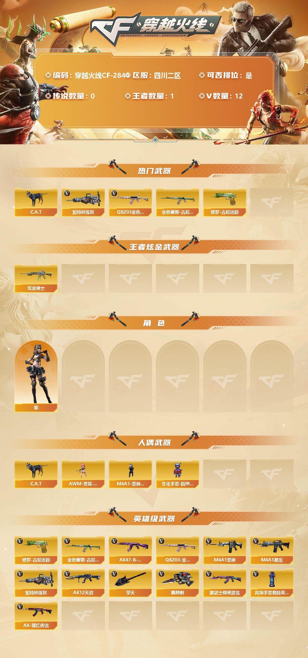 [12525264]【商品标题】:四川二区-12V-1王者-1炫金 【热门武器】:QBZ03-金色蔷薇,金色蔷薇-古蛇迷踪,修罗-古蛇迷踪,C.A.T,加特林-炼狱 【王者炫金武器】:炫金骑士 【角色】:葵 【人偶武器】:AWM-灵狐-15周年嘉年华*2,M4A1-雷神-精英刀锋,C.A.T,生化手雷-机甲核心 【英雄级武器】:高爆手雷-竞技荣光,QBZ03-金色蔷薇,金色蔷薇-古蛇迷踪,M4A1-雷神,M4A1-黑龙,加特林-炼狱,AK12-天启,黑武士-锦绣游龙,AK-47-猩红传说,AK47-B-常胜将军,修罗-古蛇迷踪,麒麟刺,擎天 【特殊枪械】:1炼狱