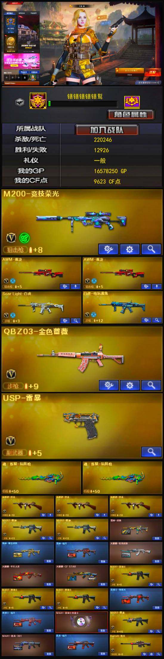 - [12560891]【商品标题】:河南一区-50V-0王者-0炫金 【热门武器】:QBZ03-金色蔷薇,M200-竞技荣光,死亡之眼,M4A1-黑骑士,汤姆逊-烈龙*8,RPK-盘龙*5,加特林-炼狱*2,USP-雷暴,沙鹰-修罗 【稀有皮肤】:雷神-能量核心,火麒麟-平天大圣,火麒麟-百城,黑骑士-暗月,黑骑士-摸金校尉,毁灭-黑大圣皮肤,毁灭-风暴,天龙-秘银*2,修罗-CF STAR 【角色】:电竞教官-云悠悠,铁骑荣耀 【人偶武器】:迷你艾比,夺魂*2 【暴走生化】:死亡之眼,超级对讲机 【挑战大师】:神圣爆裂者III,神圣爆裂者-末日III,试炼破坏者III,激光毁灭者III,激光毁灭者III-白马银枪*2,冰龙粉碎者-白马银枪 【英雄级武器】:M200-竞技荣光,柯尔特-竞技荣光,擎天-竞技荣光,高爆手雷-竞技荣光*2,烟雾弹-竞技荣光*3,闪光弹-竞技荣光*3,USP-雷暴,M4A1-武圣*3,QBZ03-金色蔷薇,无影-神兵利器,M4A1-雷神*2,M4A1-黑龙*2,M4A1-玫瑰精灵,M4A1-黑骑士,M4A1-死神,RPK-盘龙*5,加特林-炼狱*2,汤姆逊-烈龙*8,AK47-火麒麟,AWM-天龙,Barrett-毁灭,Barrett-极光,AK47-机械迷城,沙鹰-修罗,麒麟刺,屠龙*2 【特殊枪械】:0白虎,1黑骑士,6烈龙,5盘龙,2炼狱,0蝴蝶斯泰尔