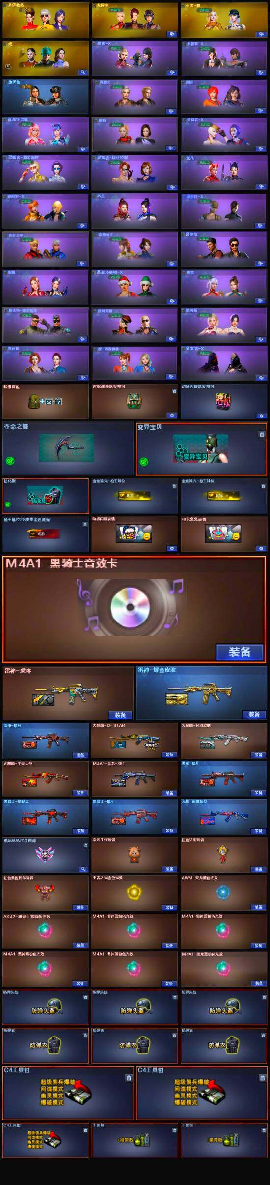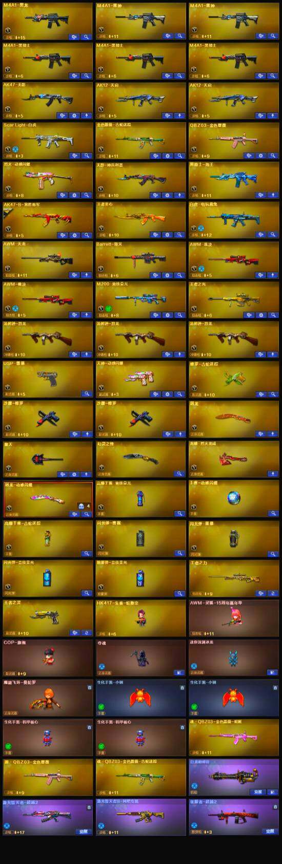 【英雄级武器】:M200-竞技荣光,高爆手雷-竞技荣光,烟雾弹-竞技荣光,闪光弹-竞技荣光,幻灵之锋,USP-雷暴,烈火-动感闪耀,天神-动感闪耀,屠龙-动感闪耀,手雷-动感闪耀,QBZ03-金色蔷薇,Scar Light-白虎,金色蔷薇-古蛇迷踪,白虎-电玩蓝兔,无影-神兵利器,M4A1-雷神*2,M4A1-黑龙,M4A1-黑骑士*3,汤姆逊-烈龙*3,AK47-无影,AK12-天启*2,AWM-天龙,Barrett-毁灭,AWM-裁决*2,黑骑士-海王,AK-47-猩红传说*3,AK47-B-常胜将军,修罗-古蛇迷踪,沙鹰-修罗*2,擎天,屠龙