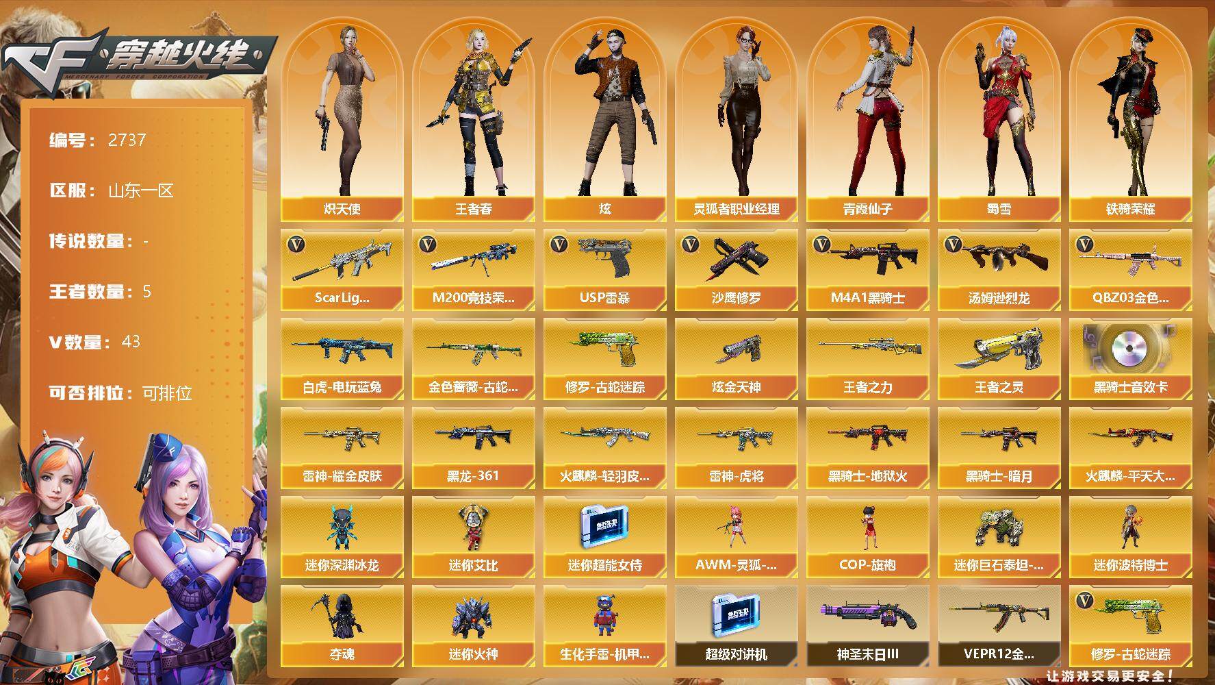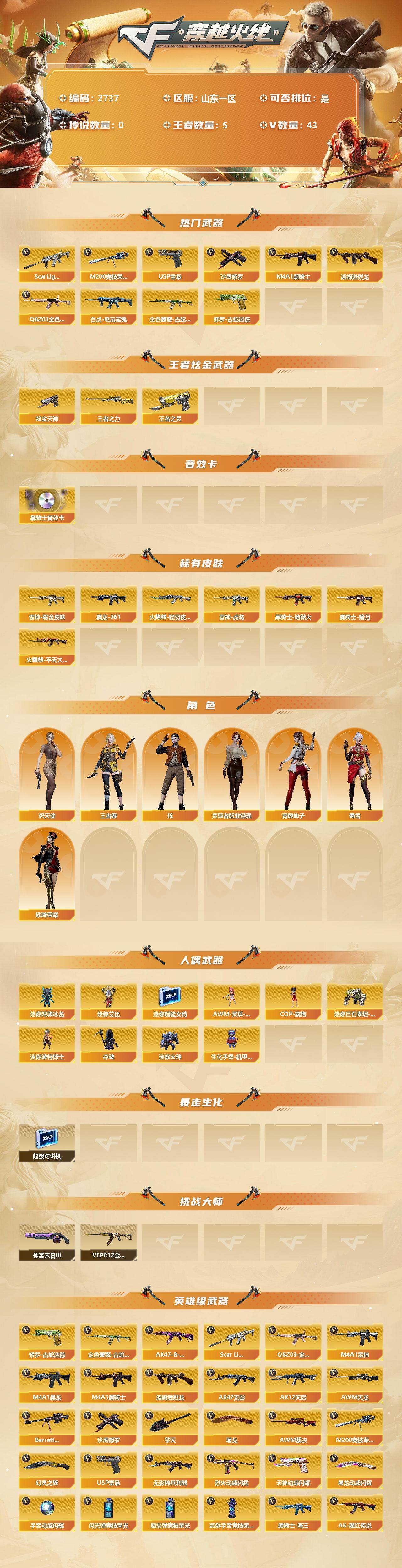 [12525554]【商品标题】:山东一区-43V-5王者-1炫金 【热门武器】:QBZ03-金色蔷薇,Scar Light-白虎,金色蔷薇-古蛇迷踪,修罗-古蛇迷踪,M200-竞技荣光,白虎-电玩蓝兔,M4A1-黑骑士*3,汤姆逊-烈龙*3,USP-雷暴,沙鹰-修罗*2 【王者炫金武器】:炫金天神,王者之力,王者之灵 【音效卡】:M4A1-黑骑士音效卡 【稀有皮肤】:雷神-虎将,雷神-耀金皮肤,火麒麟-轻羽皮肤,火麒麟-平天大圣,黑骑士-暗月,黑骑士-地狱火,M4A1-黑龙-361 【角色】:王者春,灵狐者-职业经理,炫,蜀雪,炽天使,铁骑荣耀,青霞仙子 【人偶武器】:AWM-灵狐-15周年嘉年华,COP-旗袍,迷你深渊冰龙,迷你艾比,迷你超能女侍,迷你巨石泰坦-魔花研究所,迷你波特博士*2,夺魂,迷你火种*4,生化手雷-机甲核心*2 【暴走生化】:超级对讲机 【挑战大师】:神圣爆裂者-末日III,VEPR-12-金魔 【英雄级武器】:M200-竞技荣光,高爆手雷-竞技荣光,烟雾弹-竞技荣光,闪光弹-竞技荣光,幻灵之锋,USP-雷暴,烈火-动感闪耀,天神-动感闪耀,屠龙-动感闪耀,手雷-动感闪耀,QBZ03-金色蔷薇,Scar Light-白虎,金色蔷薇-古蛇迷踪,白虎-电玩蓝兔,无影-神兵利器,M4A1-雷神*2,M4A1-黑龙,M4A1-黑骑士*3,汤姆逊-烈龙*3,AK47-无影,AK12-天启*2,AWM-天龙,Barrett-毁灭,AWM-裁决*2,黑骑士-海王,AK-47-猩红传说*3,AK47-B-常胜将军,修罗-古蛇迷踪,沙鹰-修罗*2,擎天,屠龙 【特殊枪械】:1白虎,3黑骑士,3烈龙