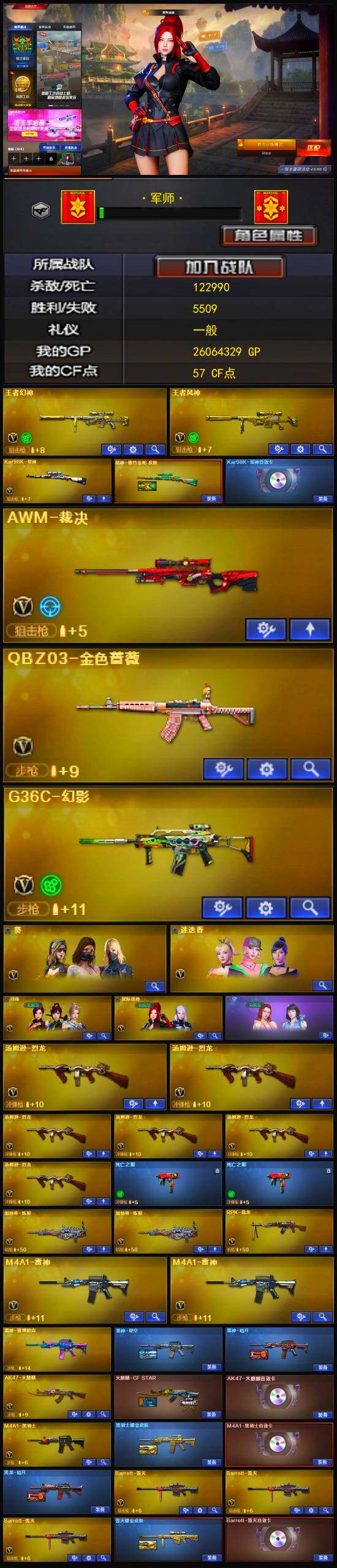 【热门武器】:G36C-幻影,QBZ03-金色蔷薇,死亡之眼*2,Kar98K-星神,金色小号,Cat-刀锋,牛牛-AK47,M4A1-黑骑士,汤姆逊-烈龙*6,RPK-盘龙,加特林-炼狱*2,沙鹰-修罗*3,金刚伞