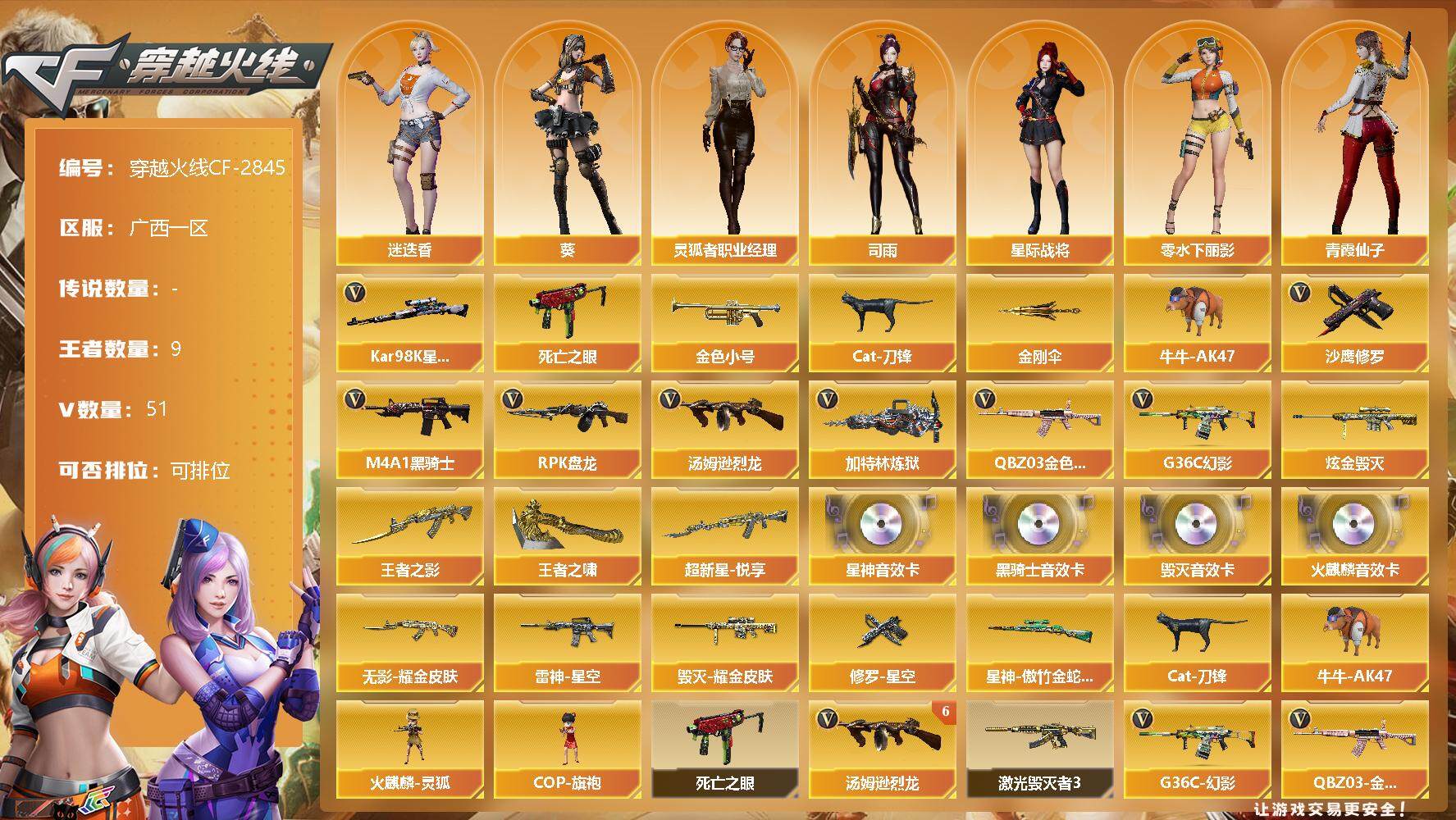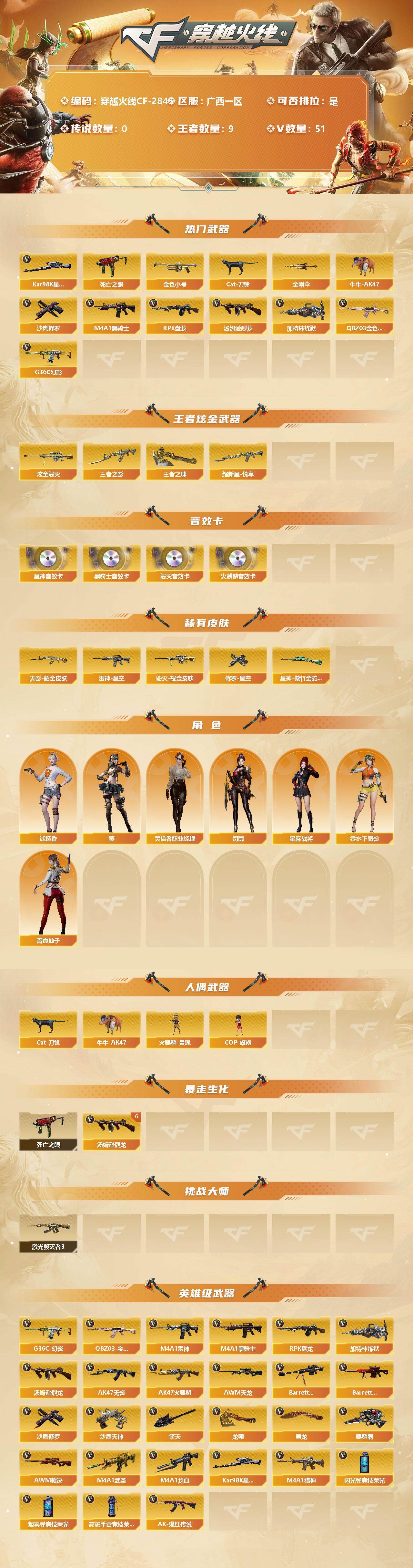 [12525928]【商品标题】:广西一区-51V-9王者-1炫金 【热门武器】:G36C-幻影,QBZ03-金色蔷薇,死亡之眼*2,Kar98K-星神,金色小号,Cat-刀锋,牛牛-AK47,M4A1-黑骑士,汤姆逊-烈龙*6,RPK-盘龙,加特林-炼狱*2,沙鹰-修罗*3,金刚伞 【王者炫金武器】:炫金毁灭,超新星-悦享,王者之影,王者之啸 【音效卡】:AK47-火麒麟音效卡,M4A1-黑骑士音效卡,Barrett-毁灭音效卡,Kar98K-星神音效卡 【稀有皮肤】:星神-傲竹金蛇 皮肤,雷神-星空,毁灭耀金皮肤,无影耀金皮肤,修罗-星空 【角色】:零-水下丽影,灵狐者-职业经理,葵,迷迭香,星际战将,司雨,青霞仙子 【人偶武器】:火麒麟-灵狐,COP-旗袍,Cat-刀锋,牛牛-AK47 【暴走生化】:死亡之眼*2 【挑战大师】:激光毁灭者III 【英雄级武器】:高爆手雷-竞技荣光,烟雾弹-竞技荣光,闪光弹-竞技荣光,M4A1-武圣,G36C-幻影,QBZ03-金色蔷薇,M4A1-雷神*2,M4A1-黑骑士,RPK-盘龙,加特林-炼狱*2,汤姆逊-烈龙*6,AK47-无影,AK47-火麒麟,AWM-天龙,Barrett-毁灭*3,Barrett-极光,AWM-裁决,M4A1-龙血,Kar98K-星神,M4A1-猎神,AK-47-猩红传说*3,沙鹰-天神*2,沙鹰-修罗*3,麒麟刺,擎天,龙啸*2,屠龙*2 【特殊枪械】:1黑骑士,6烈龙,1盘龙,2炼狱