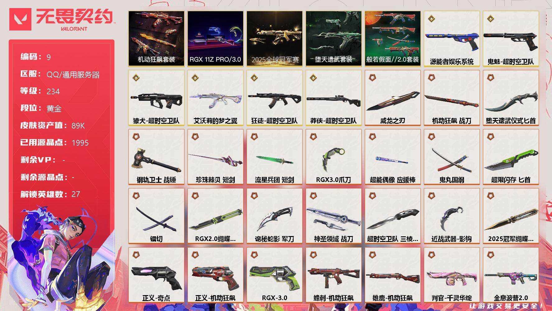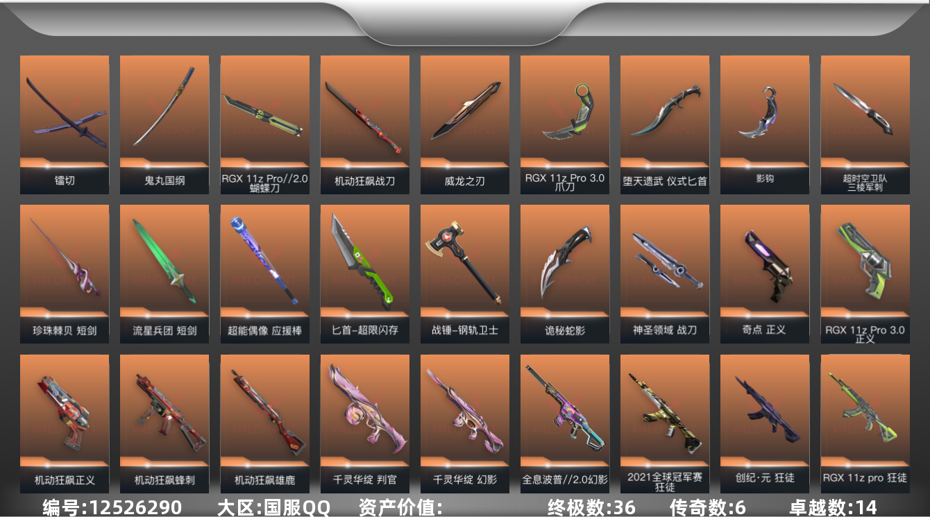 [12526290]【套装】:2025全球冠军赛套装,超时空卫队套装,RGX 11z Pro//3.0套装,机动狂飙套装,般若假面//2.0套装,堕天遗武套装 【英雄】:幻棱,炼狱,维斯,暮蝶,钛狐,壹决,铁臂,捷风,雷兹,幽影,不死鸟,贤者,猎枭,蝰蛇,零,芮娜,奇乐,尚勃勒,霓虹,斯凯,夜露,星礈,K/O,海神,盖可,黑梦,钢锁 【近战 武器】:近战武器-2025全球冠军赛 蝴蝶刀,近战武器-影钩,近战武器-超时空卫队 三棱军刺,近战武器-RGX 11z Pro//2.0 蝴蝶刀,近战武器-RGX 11z Pro//3.0 爪刀,近战武器-镭切,近战武器-威龙之刃,近战武器-鬼丸国纲,近战武器-珍珠棘贝 短剑,近战武器-流星兵团 短剑,近战武器-超能偶像 应援棒,近战武器-超限闪存 匕首,近战武器-堕天遗武 仪式匕首,近战武器-钢轨卫士 战锤,近战武器-机动狂飙 战刀,近战武器-诡秘蛇影 军刀,近战武器-神圣领域 战刀 【狂徒】:狂徒-艾沃莉的梦之翼,狂徒-超时空卫队,狂徒-2025全球冠军赛,狂徒-2021全球冠军赛,狂徒-混沌序曲,狂徒-机动狂飙,狂徒-创·纪元,狂徒-RGX 11z Pro,狂徒-般若假面//2.0,狂徒-冰点凝冻,狂徒-堕天遗武,狂徒-盖亚的复仇,狂徒-海洋之星,狂徒-超能偶像,狂徒-钢轨卫士,狂徒-流星兵团,狂徒-永远铭记,狂徒-诡秘蛇影 【幻影】:幻影-千灵华绽,幻影-全息波普//2.0,幻影-侦察力量,幻影-超限闪存,幻影-珍珠棘贝,幻影-神圣领域,幻影-聚合之力,幻影-战术小伙伴,幻影-末日之翼 【戍卫】:戍卫-天界神兵,戍卫-超能偶像,戍卫-钢轨卫士,戍卫-珍珠棘贝,戍卫-浮光跃金,戍卫-逆冲蛮牛,戍卫-战术熊与伙伴们,戍卫-月球哨兵,戍卫-折光棱晶 【獠犬】:獠犬-超时空卫队,獠犬-般若假面//2.0,獠犬-神圣领域,獠犬-采蜜小蜂队,獠犬-复古浪潮,獠犬-模拟赫兹,獠犬-逆冲蛮牛,獠犬-战术小伙伴 【冥驹】:冥驹-堕天遗武,冥驹-荒土机兵,冥驹-复古浪潮,冥驹-模拟赫兹,冥驹-星云暗涌 【飞将】:飞将-黯夜怪谈,飞将-沙尘幻旅,飞将-聚合之力,飞将-光导纤维,飞将-战术熊与伙伴们,飞将-末日之翼 【莽侠】:莽侠-超时空卫队,莽侠-RGX 11z Pro//3.0,莽侠-超限闪存,莽侠-诡秘蛇影,莽侠-深海水族,莽侠-纤云弄巧,莽侠-月球哨兵